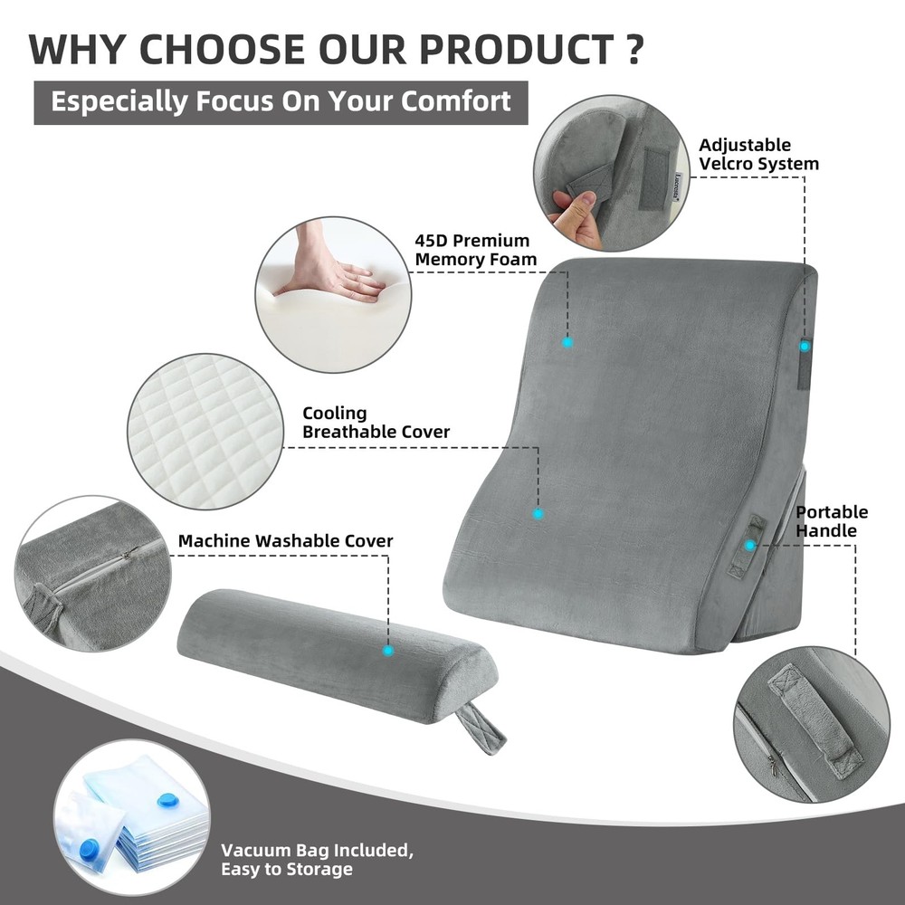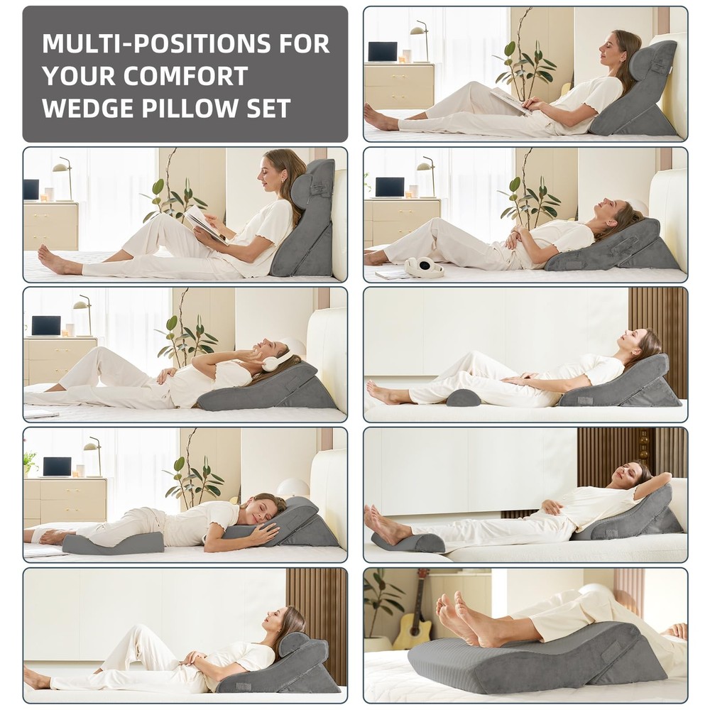 bed wedges and body positioner 【Ergonomic Curved Design】3PCS wedge pillow set features a perfectly crafted ergonomic curved design that offers unparalleled support and comfort. Its curved shape conforms to your body's natural curves, promoting better pressure distribution and alignment of your neck and spine 【Adjustable 10-in-1 Support System】3PCS bed wedge pillow set features a 10-in-1 design that caters to diverse needs. The adjustable back offers customized support and comfort for sleeping, reading or working, providing exceptionally comfortable postures for easing snoring, post-surgery discomfort, acid reflux, and improving blood circulation as a leg elevation pillow. 【Premium Fabric & Foam】Made of premium 45D high-density memory foam for superior support and comfort, the pillow set conforms your body's shape, providing customized cushioning and pressure/pain relief. The cover is made of stylish gingham fabric combining with excellent Microvlet, which is breathable, skin-friendy and soft to touch 【Designed For Your Health】Supporting your head, neck, back and legs, the pillow set provides effective relief for GRED, Heartburn, acid Reflux and other medical conditions. Ideal for Recovry after Surgery, Pregnancy, Neck/Back pain relief and anyone who caters for good overall sleep and well-being 【Perfect & Satisfying Gift】It is a thoughtful and considerate choice that will bring perfect satisfaction to your loved ones. The set of pillows is suitable for women, men and seniors, meeting their indiviual needs. This satisfying gift will be appreciated by anyone looking to improve their sleep quality and overall well-being 【Easy to Use & Clean】Its portable and lightweight design allows you to easily use it on your bed, couch or floor when reading, watching, deep sleep. And the vacuum bag included makes you store it conveniently and space-saving. The cover is removable and machine washable, making it simple to keep the pillows clean and fresh
