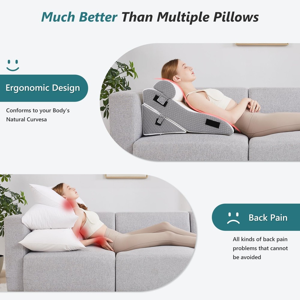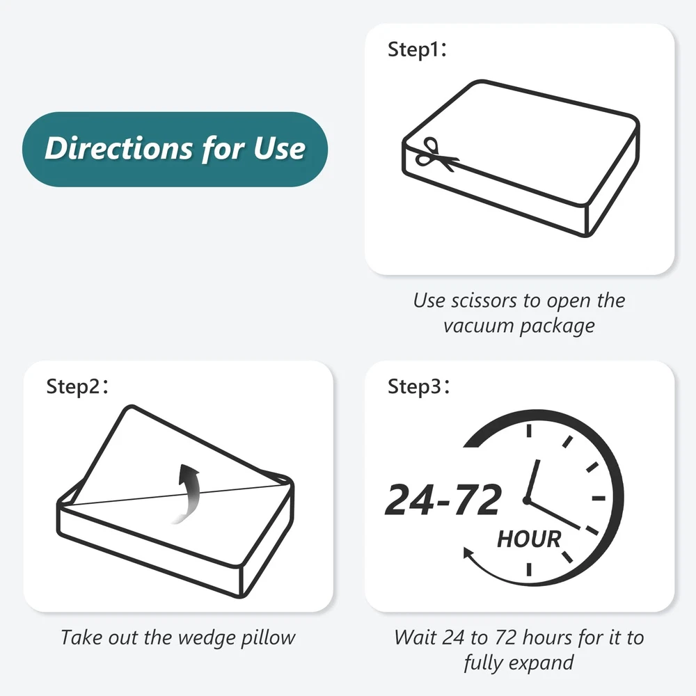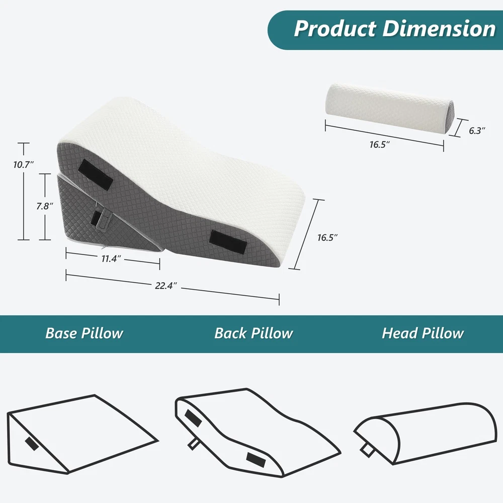has designed the most effective sleep wedge pillow for you to simultaneously provide firm support and comfort to the back, head, legs, knees and shoulders to promote breathing, and reduce snoring and heartburn. It can reduce knee pain, back pain, shoulder pain. If you are looking for a great gift that will improve your life, then you will love our 35D foam wedge pillow post surgery.100% adjustable design fits women and men of all heights, washable high quality jacquard air layer pillow cover makes your skin feel smooth, upgraded and widened Velcro and non-slip fabric design of the base enhances the safety of product usage 35D High-Density Foam, Soft and Supportive: This 22.5''wide orthopedic wedge pillow is made of high-density memory foam, which is not easy to deform and has a long service life compared to the traditional 25D foam material. Also soft and supportive, bed wedge pillow fits the body curve perfectly and is able to disperse evenly according to the weight and pressure of the body, helping to reduce pressure and relieve fatigue in all areas. Multi-Directional Support Pillow for Pain Relief: designed this wedge pillows for after surgery to relieve discomfort and is the perfect aid for post-surgical recovery. This post surgery pillow can be used in multiple areas of the head, neck, back or legs to provide firm support and comfort as a body positioner. Our Wedge Bed Pillow Set relieves shoulder and neck pain, leg and back pain, promotes breathing, and reduces snoring and heartburn. New Upgraded Non-Slip Design: The 22.5 inches width of our memory foam wedge pillow is wider than other similar products, which can meet the personalized requirements of different people's sleeping positions and needs, and can be used in any combination. At the same time, the same color wider long foldable velcro is sewn on the side, and the base part of the sleep wedges for adults is made of non-slip fabric, which improves its stability and safety. Removable Machine Washable Pillow Cover: Our Wedge pillow set is made of high quality jacquard air layer, which is soft and skin-friendly, breathable, and will keep you comfortable even after long time use. The wedge pillow is designed with Velcro in many places, which not only holds the pillow cover in place, but also provides unlimited combination changes. With hidden zipper design, you can smoothly remove the pillow cover for cleaning, hand wash or machine washable High Quality After-Sales Service: If you encounter any problems when using the 3PCS wedge bed pillow set, we can reply you within 24 hours and provide personalized solutions. NOTE: wedge pillows are vacuum packed for optimal transportation, it is recommended to let it unfold for 24-48 hours to fully expand back to its original shape.
