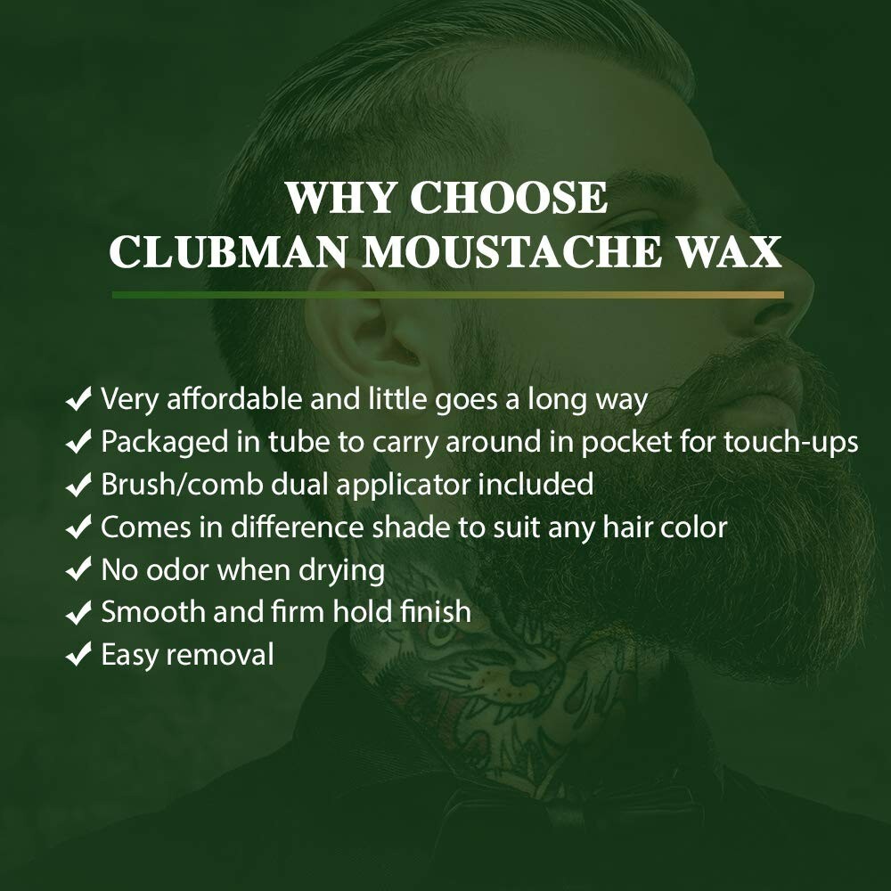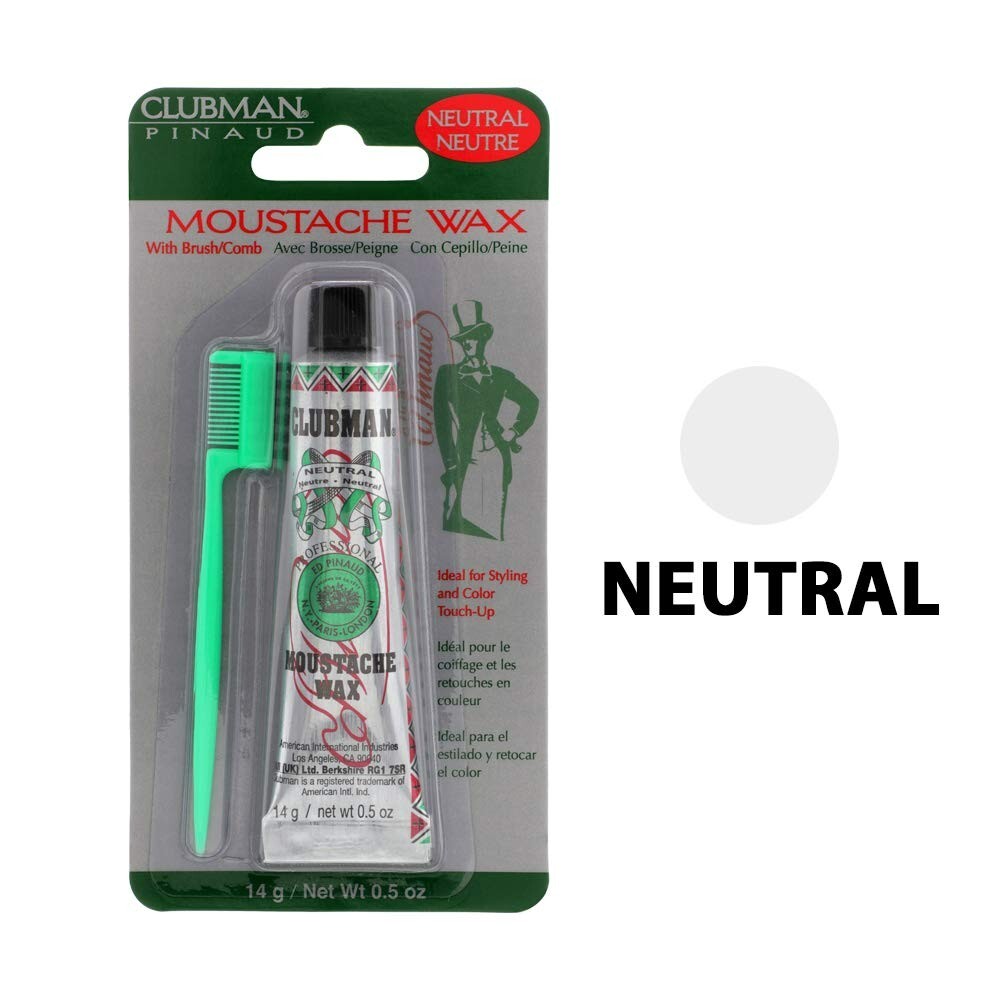 Clubman Moustache Wax Hang Pack, Neutral Color 0.5 oz x 3 packs Product Benefits Hair styling wax Hair Type fine, All Scent Unscented Liquid Volume 0.5 Fluid Ounces Item Form Wax About this item ACHIEVE A FRESH MUSTACHE LOOK: Flaunt some color to your stache! Clubman Moustache Wax Hang Pack comes in a neutral-colored formula that will help cover up grey beard hairs! It is very easy to use on your beard and face while leaving your skin feeling refreshed and cleansed. It is non-greasy or sticky, unlike other facial hair conditioners. Knockout everyone with your fresh macho look all the time with this wax from Clubman! HYDRATES AND MOISTURIZES FACIAL HAIR: Get that revitalized fresh stache and face in minutes! This facial hair styling wax is creamy and packed with volumizing and moisturizing ingredients to keep the stache stays healthy-looking instead of crispy. It is easy to rework throughout the day so your style always looks fresh! Directed at the man who is looking for a simple, comfortable daily regimen that offers basic, no-frill products that has a subtle scent and gets the job done! NO FLAKING FORMULA: Coming in a handy tube for hassle-free and no-mess stache styling that’s suitable for everyday use. Clubman Moustache Wax Hang Pack, Neutral Color is water-soluble so it’s incredibly easy to wash out that you won’t even need to use a lot of soap. Just one lather is enough for the product to get rinsed out of your hair. It can also be reapplied with no build-up. MOUSTACHE WAX WITH COMB / BRUSH: The brush included in this pack has the backbone of boar yet the softness of badger. Feels great on your face and whips up the wax fast. This is also great especially for men who prefer a firmer feel during the facial hair wax application process. It fits comfortably in your hand and provides good control and its size also makes it an excellent stache brush. QUALITY MEN’S GROOMING PRODUCTS: Clubman is committed to excellence in men's grooming and works to provide professional products at affordable prices. Approved and favored by professional hairstylists and local barbers. Founded in France in 1810, Clubman offers fine shaving and grooming products for the modern gentlemen. Product details Package Dimensions : 5.94 x 5.39 x 1.85 inches; 2.89 ounces Item model number : 070639 Manufacturer : American International Industries Important information Ingredients Water (Aqua, Eau), Beeswax (Cera Alba), Sodium Tallowate, Sodium Cocoate, PEG-32, PEG-7M, BHT, Fragrance (Parfum), Citral, Limonene, Linalool, DMDM Hydantoin, Potassium Sorbate Directions To use, simply scrape a small amount of wax from the tube with the back of your thumbnail and warm between fingers. Apply evenly to mustache and style as desired. Product Description Clubman Moustache Wax Neutral 0.5 oz, 3 Pack
