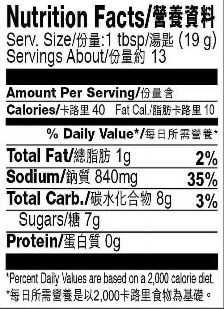 Add flavor to your dinner with Lee Kum Kee brand Hoisin Sauce. Its versatile taste makes it a valuable addition to your kitchen. You can use hoisin sauce in classic Chinese dishes, such as Peking duck or Moo Shu pork, and in a wide variety of other meals. Marinate meats in it, or pour it in your stir-fry to add a sweet, delicious burst of flavor. Use it as a barbecue sauce to take your family picnic to the next level. You can even spread this sweet and spicy sauce on a pizza for a unique and tasty twist. Hoisin Sauce: Spicy and sweet Used in classic Chinese recipes Ideal as a dip, marinade or barbecue sauce Lee Kum Kee sauce is made with spices, soybeans and sweet potatoes Deliciously unique sauce for pizza 0g trans fat, no cholesterol 90 calories per serving ( 2 tbsp) Net weight: 20 oz