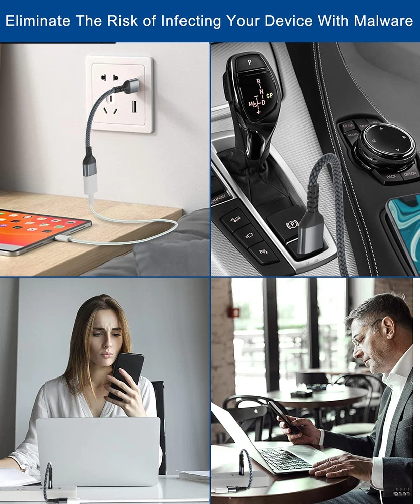 (Charging Without Compromising) In a world where cyber threats lurk around every corner, a USB Data Blocker is indispensable for your safe navigation on the Internet.The Ruxely USB Data Blocker is your loyal guardian as it can effectively prevent unauthorized access to your data without compromising on its 2.4 Amps charging speeds. (Security On the Go)With its compact and sleek design, this data blocker is your perfect travel companion. Its intelligent technology instantly detects and neutralizes any potential malware or data hijacking attempts, ensuring that your personal information remains safe and secure. Whether you're in a bustling airport, a crowded café, or a busy conference room, it's got your back. (Versatility in Compatibility) What also sets this USB Data Blocker apart from other similar devices is its compatibility with a wide range of devices. Whether you have an iPhone, an Android smartphone, a tablet, or even a digital camera, it works seamlessly with all of them, making it an essential tool for anyone who values their privacy. (Intuitive Usage) This USB data blocker is also incredibly user-friendly. There are no complicated installations or additional software required. Simply plug it into any USB port, and it will immediately kick into action, effectively blocking any data transfers while allowing the device to charge normally. It's as simple as plug-and-protect! (Buy them Worry-free) We back this product with a worry-free 12-month warranty. Questions with your orders? We are just a mouse-click away. Not satisfied with your purchase? Here's your reimbursement. No catch, no strings attached. Product Description When it comes to quality, we at Ruxely don't compromise. Our products are made with the finest materials, tested to ensure reliability and efficiency, and backed by our quality assu_rance and customer service. Whether you're a casual user or a professional, our accessories will help you get ahead and stay ahead. USB Data Blocker What's in the package USB A Data Blocker Cable * 3 Key Features: Prevent data breach or hack while charging your device Double-braided nylon jacketand sleek aluminum-alloy finish Supports up to 2.4 Amps of power output Superior Durability Designed to withstand the rigors of daily use, the double-braided nylon jacket and the aluminium alloy housing of this data blocker warrant years of service of unwavering protection throughout your digital journey and saves you loads of cash from having to constantly getting new cables and data breach. The future is Here Leveraging state-of-the-art technology, this USB Data Blocker halts all data transfers while your device charges, completely isolating your confidential information from the outside world. It's a fortress in pocket, making data theft a tall tale of yesterday! Seamlessly Compatible Credit to its supreme compatibility, this USB data blocker works seamlessly with diverse devices including iPhones, Android smartphones, tablets, or any gadget that charges via a USB port. It’s the universal soldier in your digital battle, steadfast and determined, ready to guard you anytime, anywhere!