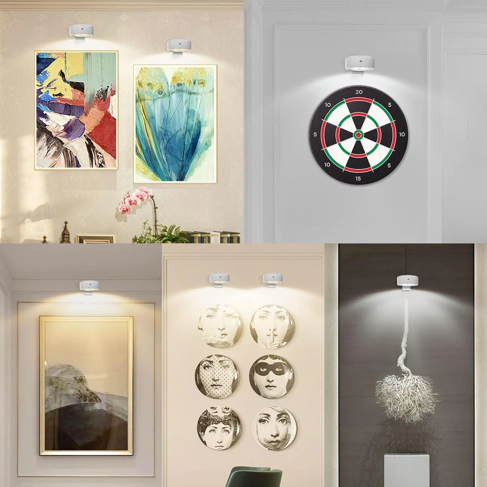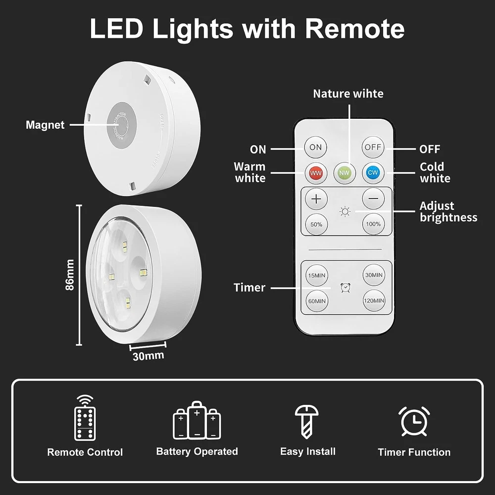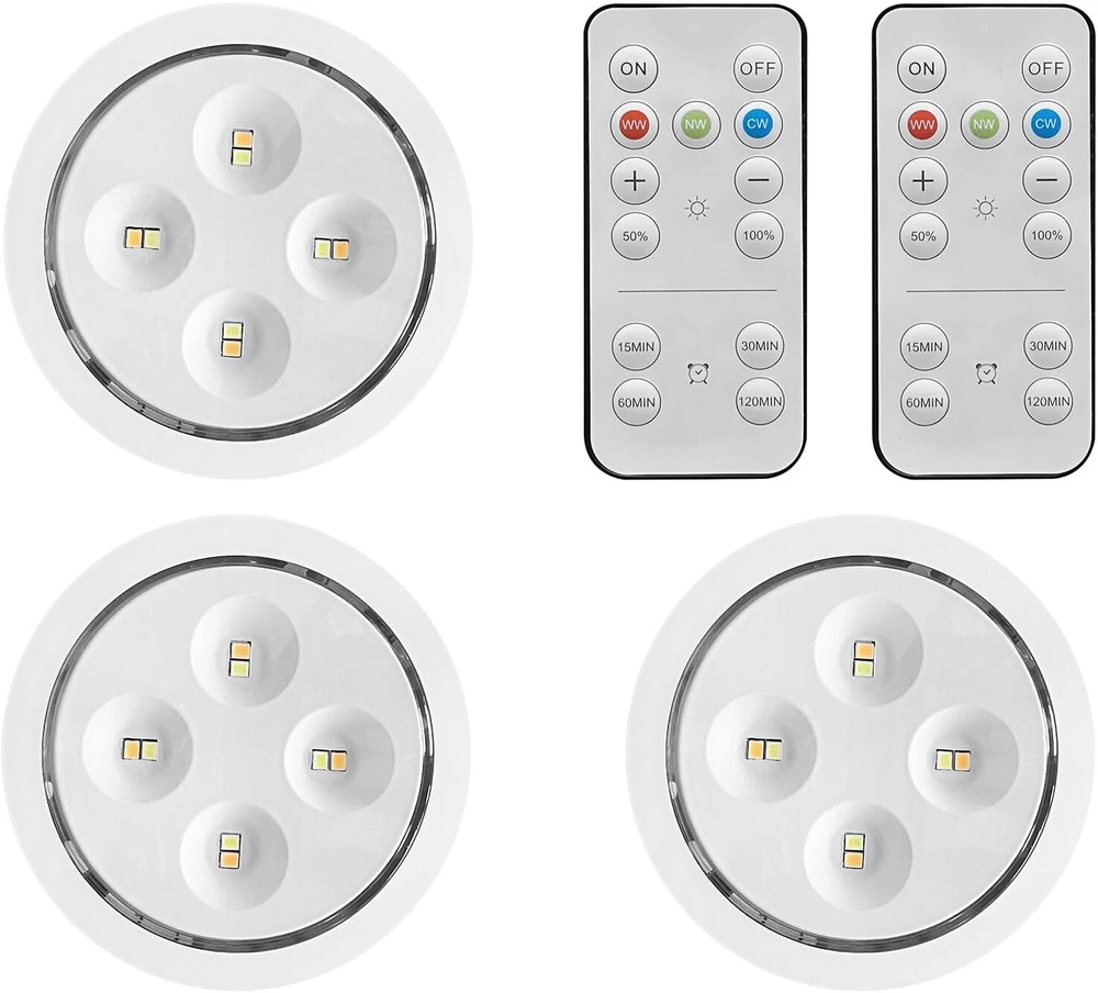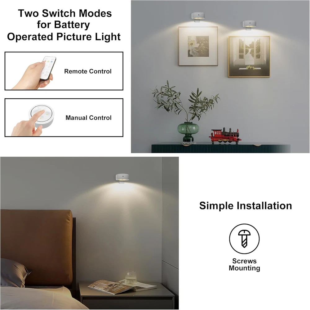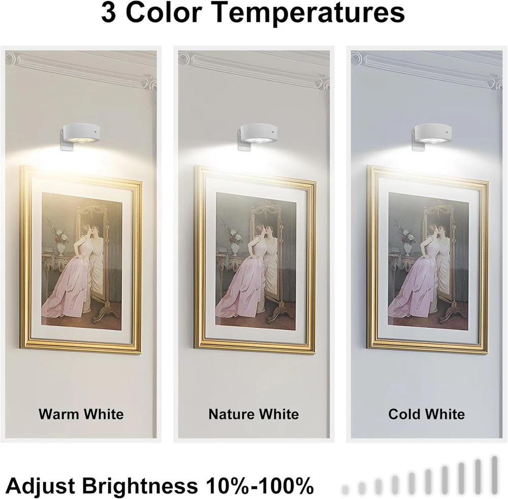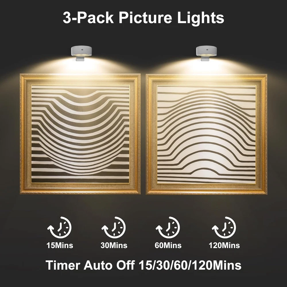 [Battery and Remote Control Picture Lights]Operated by 3 AA batteries(not included),More than 50 hours lifespan.Come with remote control,you can set the picture frame light from a distance with the handy remote control. [3 Lighting Modes & Dimmable Brightness Painting Light]3 lighting modes (warm white, natural white, cool white) to match your mood or artwork.Personalize your room with dimmable brightness levels. [Auto OFF Timer Art Lights for Paintings]The easy-to-use timer function that allows you to set the wall light to automatically turn off after 15, 30, 60 or 120 minutes. [OCCATIONS] Suitable for different occasions, such as decorating photo frames, portraits,painting ,canvas, artwork,darts ,wall display illuminating, wall decor.The art light is also good chioce for home, living room, bedroom, room decoration lighting. [EASY INSTALL]The puck lights comes with bracket and can be fixed to the wall with screws or 3M adhesive easily.Also can be adsorbed on a variety of iron items. Product Description Battery Operated Picture Lights with Remote This set of 3 art display light battery operated with remote suitable for lighting small-sized photo frames. For example 4x6,5x8, 8x8, 8x10, 8x12, 9x12,10x12,10x14 inches. It is perfect for illuminating any piece of art or portrait in your home. Key Features: Magnetic Structure: can be attracted to any iron,easy to use. Two Remote Control: can be used in multiple places at the same time. Dimmable Brightness: The picture lights are also dimmable, allowing you to create the perfect ambience for any piece of art or photo. Battery Powered: The black light for paintings powered by 3 AA batteries (not included),easy to use. Widely Use Occasions: You can use it as battery operated picture lights for paintings,battery operated wall lights,battery operated spotlight,led dimmable spotlight ,light for display,lights for pictures on wall,wireless art lighting with remote,portrait led light,light for wall picture . So, if you're looking for a way to showcase your favorite artwork or photos, then the 3-Pack Wireless Picture Lights is the perfect solution! Wireless picture lights&LED puck lights for pictures on wall Make your room warm and bright! 3-Pack battery powered picture lights with remote. Two switch modes:remote control&manual touch. Short press to change color. Long press to adjust brightness. You can set 15, 30, 60, 120 minutes for the photo light by remote control. Specifications: Light source color: 3000K warm white 4000K neutral white 6000K cold white Powered by 3AA batteries( batteries not included) Timing off function 15/30/60 or 120 minutes Dimmable brightness 10%-100% Easy to install Package Included: 3 x Battery operated puck lights (batteries not included) 2 x remote control 3 x mounting brackets 3 x screws