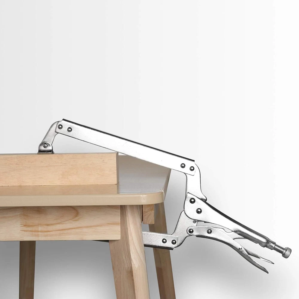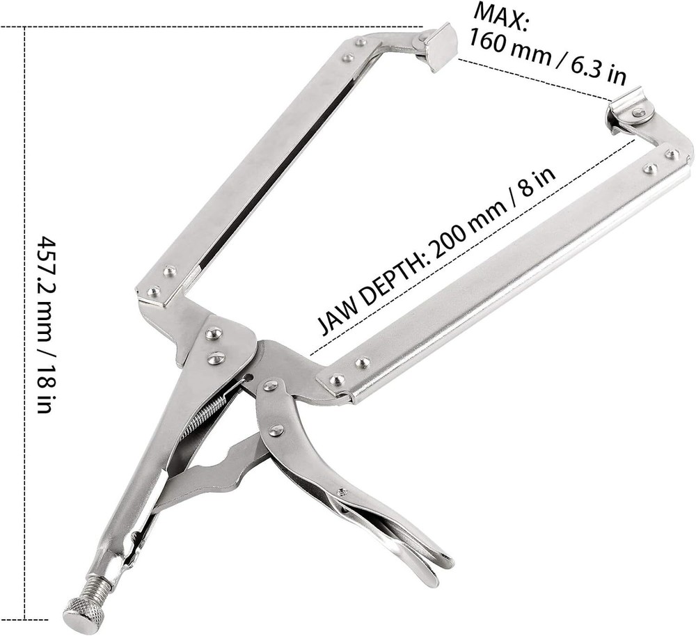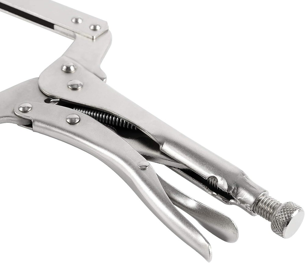 HIGH-GRADE CARBON STEEL MATERIAL - The welding clamp kit is made of heat-treated high-grade carbon steel material, which is high hardness, large torque, sturdy and durable, stable and reliable. In addition, the product has a nickel coating that is rust and corrosion resistant, and has a long service life. ADJUSTABLE SWIVEL PAD AND SAFE GRIP MECHANISM - The woodworking locking pliers come with a swivel pad, which can work on tapered, hard and delicate objects without damaging the surface of the object. The product is equipped with a trigger release mechanism, which can be released quickly to provide maximum locking force and help prevent accidental release. COMFORTABLE HANDLE AND ADJUSTABLE SCREWS - The handle of the C-clamp locking pliers is ergonomically designed, easy to open, comfortable and well controlled, can be held from any angle for better grip. The C-clamp welding tool comes with adjustable screws to adjust the size and pressure to provide a firm clamping force during work. WIDE RANGE OF USE - The C-clamp locking pliers have a wide range of uses. The large opening jaw can fix and clamp objects of various shapes and materials, which is very suitable for woodworking, welding, electrical maintenance, etc. In addition, the product has multiple rivets to fix the pliers, which is firm and stable. Come and use it, you will like it!