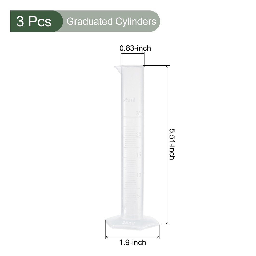 Document MULTIPURPOSE - Our graduated cylinders are great for lab, class, experiment, and daily use, suitable for teachers, technicians, etc.WHAT YOU GET - The package comes with 3pcs 25ml graduated cylinders, in size of 21 x 140 mm / 0.83 x 5.51 inch, [Tube diameter x total height].The base size is 44 x 50 mm / 1.73 x 1.9inchThe tolerance is ±0.5ml at 20℃.RELIABLE MATERIAL - This graduated cylinder is made of clear plastic, which is durable and reusable.SPECIAL DESIGNED - Hexagonal base keep the cylinder tube firm and steady.Clear scale on the tube body, for a precise measurement. And the scale will not be faded.Round edge and a tapered pour spout, benefit for filling and pouring, easy to see and use.KINDLY NOTE - This product cannot be used as a reaction container. Please avoid heating, concentrated acids or bases while using it. 3 Pcs Measuring Graduated Cylinders,for Chemical Measuring, (Clear White, 25ml) MULTIPURPOSE - Our graduated cylinders are great for lab, class, experiment, and daily use, suitable for teachers, technicians, etc. WHAT YOU GET - The package comes with 3pcs 25ml graduated cylinders, in size of 21 x 140 mm / 0.83 x 5.51 inch, [Tube diameter x total height]. The base size is 44 x 50 mm / 1.73 x 1.9inch The tolerance is ±0.5ml at 20℃. RELIABLE MATERIAL - This graduated cylinder is made of clear plastic, which is durable and reusable. SPECIAL DESIGNED - Hexagonal base keep the cylinder tube firm and steady. Clear scale on the tube body, for a precise measurement. And the scale will not be faded. Round edge and a tapered pour spout, benefit for filling and pouring, easy to see and use. KINDLY NOTE - This product cannot be used as a reaction container. Please avoid heating, concentrated acids or bases while using it. Hot Item Payment 1.We accept eBay payment . 2.Payment must be received within 7 business days of auction closing. Shipping 1.We ship to your eBay or Paypal address. Please make sure your eBay and Paypal address is correct before you pay. 2.Items will be shipped within 1-3 business day when we received payment. 3.Delivery time depends on destination and other factors. Description Policy 3 Pcs Measuring Graduated Cylinders,for Chemical Measuring, (Clear White, 25ml) MULTIPURPOSE - Our graduated cylinders are great for lab, class, experiment, and daily use, suitable for teachers, technicians, etc. WHAT YOU GET - The package comes with 3pcs 25ml graduated cylinders, in size of 21 x 140 mm / 0.83 x 5.51 inch, [Tube diameter x total height]. The base size is 44 x 50 mm / 1.73 x 1.9inch The tolerance is ±0.5ml at 20℃. RELIABLE MATERIAL - This graduated cylinder is made of clear plastic, which is durable and reusable. SPECIAL DESIGNED - Hexagonal base keep the cylinder tube firm and steady. Clear scale on the tube body, for a precise measurement. And the scale will not be faded. Round edge and a tapered pour spout, benefit for filling and pouring, easy to see and use. KINDLY NOTE - This product cannot be used as a reaction container. Please avoid heating, concentrated acids or bases while using it. Hot Item Payment 1.We accept eBay payment . 2.Payment must be received within 7 business days of auction closing. Shipping 1.We ship to your eBay or Paypal address. Please make sure your eBay and Paypal address is correct before you pay. 2.Items will be shipped within 1-3 business day when we received payment. 3.Delivery time depends on destination and other factors.