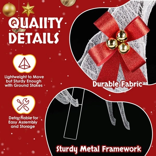 Product Description:- Introductions: This charming 3-Piece Lighted Set of 2 Reindeer & Sleigh is the perfect addition to your holiday décor. Featuring two reindeer pulling a santa's sleigh, this set is beautifully adorned with festive bowknots and sparkling glitter, capturing the magic of the holiday season. With its durable, weatherproof design and warm LED lights, it adds a cozy, enchanting glow to any indoor or outdoor space. Easy to assemble and store, this reindeer set will bring joy and festive cheer to your home year after year. Features: 1. Charming Reindeer & Sleigh Set: This delightful set features two reindeer pulling a santa's sleigh, each detailed with a festive bowknot and glistening glitter for added holiday sparkle. Loved by both kids and adults, this reindeer and sleigh set is sure to bring warmth and festive joy to your outdoor or indoor Christmas decorations. 2. Eye-Catching LED Lights: Pre-lit with 270 white LEDs, these reindeer glow beautifully in the night, creating an inviting holiday atmosphere. The well-placed LED lights make the reindeer a stunning focal point for your Christmas display, both day and night. 3. Weather-Resistant and Sturdy Build: Made from a durable, rustproof metal frame with waterproof fabric, the reindeer set is built to withstand wind, rain, and snow. The included ground stakes provide extra stability, ensuring your decorations stay secure in winter weather. 4. Easy Assembly & Storage: This collapsible reindeer set can be set up in minutes, allowing you to enjoy your festive display without hassle. The lights are pre-installed, simply connect the wires and plug them in to watch them come to life. 5.Perfect Holiday Decor for Indoor & Outdoor: Whether placed indoors near your Christmas tree, on the porch, or outdoors in the yard, this lighted reindeer set enhances any holiday setting. Perfect for holiday parties, weddings, or as a festive yard display, these reindeer bring elegance and a joyful touch to your celebrations. Specifications: 1. Overall Dimensions: (83 x 10.8 x 39.4) in / (211 x 27.5 x 100) cm 2. Number of Lights: 270pcs 3. Light Color: White Package Includes: 1 x 2 Reindeer & Sleigh Set 1 x Set of Ground Stakes