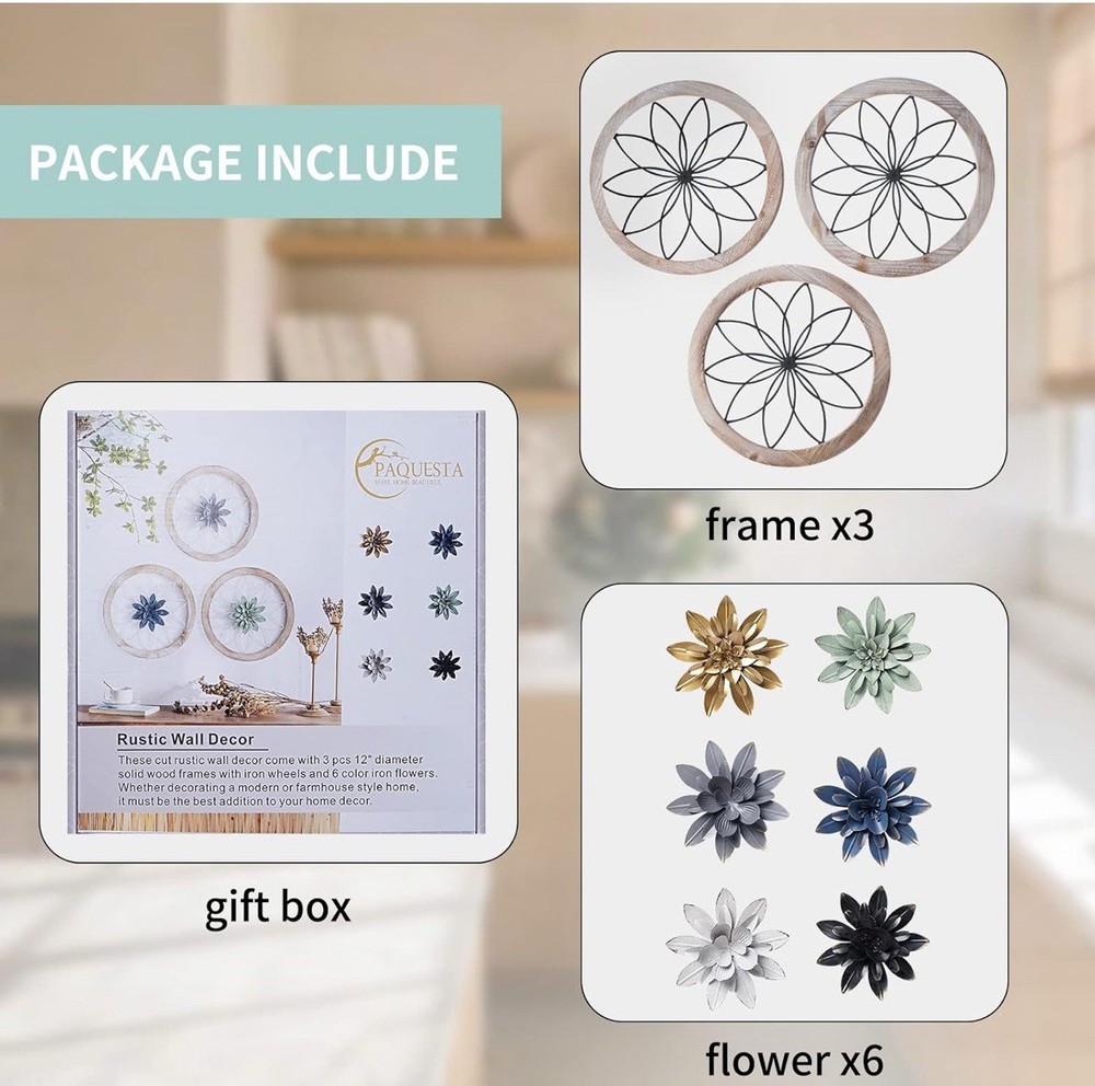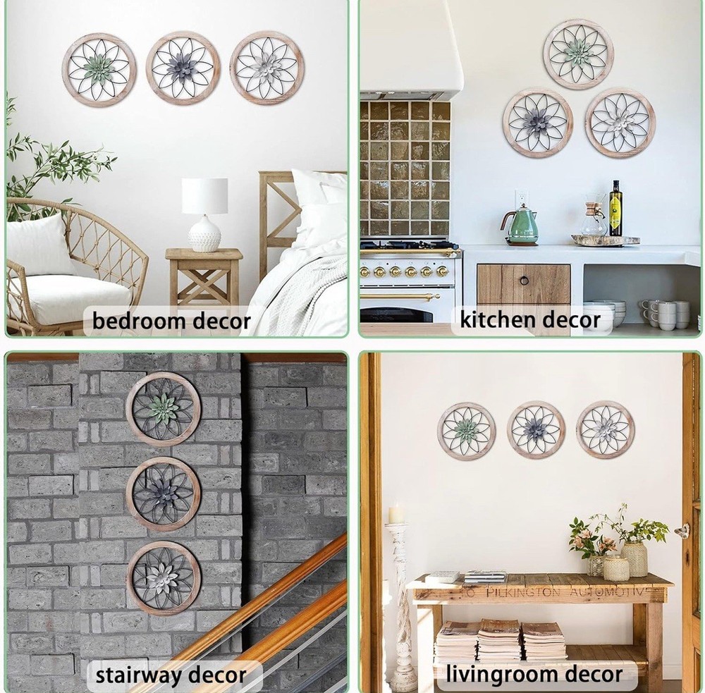 This 3-piece round farmhouse wall decor set from Decor features a rustic wood design with metal flower accents. The decorative pieces are perfect for adding a touch of vintage charm to any room. The farmhouse style, combined with the theme of flowers, gives the decor a unique and eclectic look. Made of wood with a metallic finish, these wall decorations are sure to enhance the aesthetic of your home with their rustic and charming appeal.