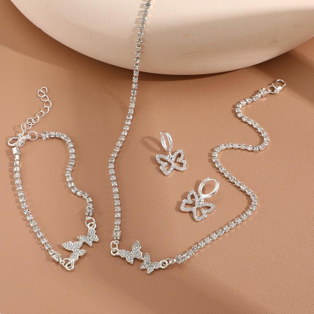 3 Pieces Silver Butterfly Necklace Bracelet Dangle Earrings Set,Butterfly Pendant Necklace White Plated Jewelry Set with AAA Cubic Zirconia,Rhinestone Cuban Necklace Bling Charm Butterfly Hoop Earrings for Women Product Details Package Dimensions : 5.79 x 4.02 x 0.35 inches; 0.32 ounces Department : womens Date First Available : September 12, 2023 Manufacturer : E EMZHOLE Brand, Seller, or Collection Name: E EMZHOLE Metal: Copper Material: Copper, Cubic Zirconia Gem Type: Zircon Chain: Cuban Clasp: Lobster Clasp Number of stones: 20