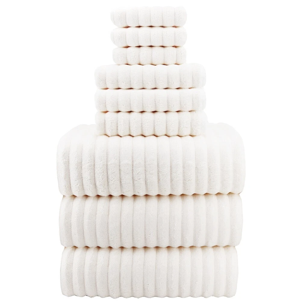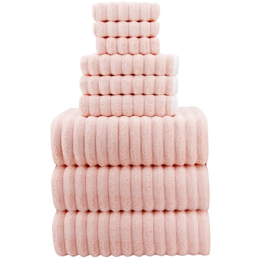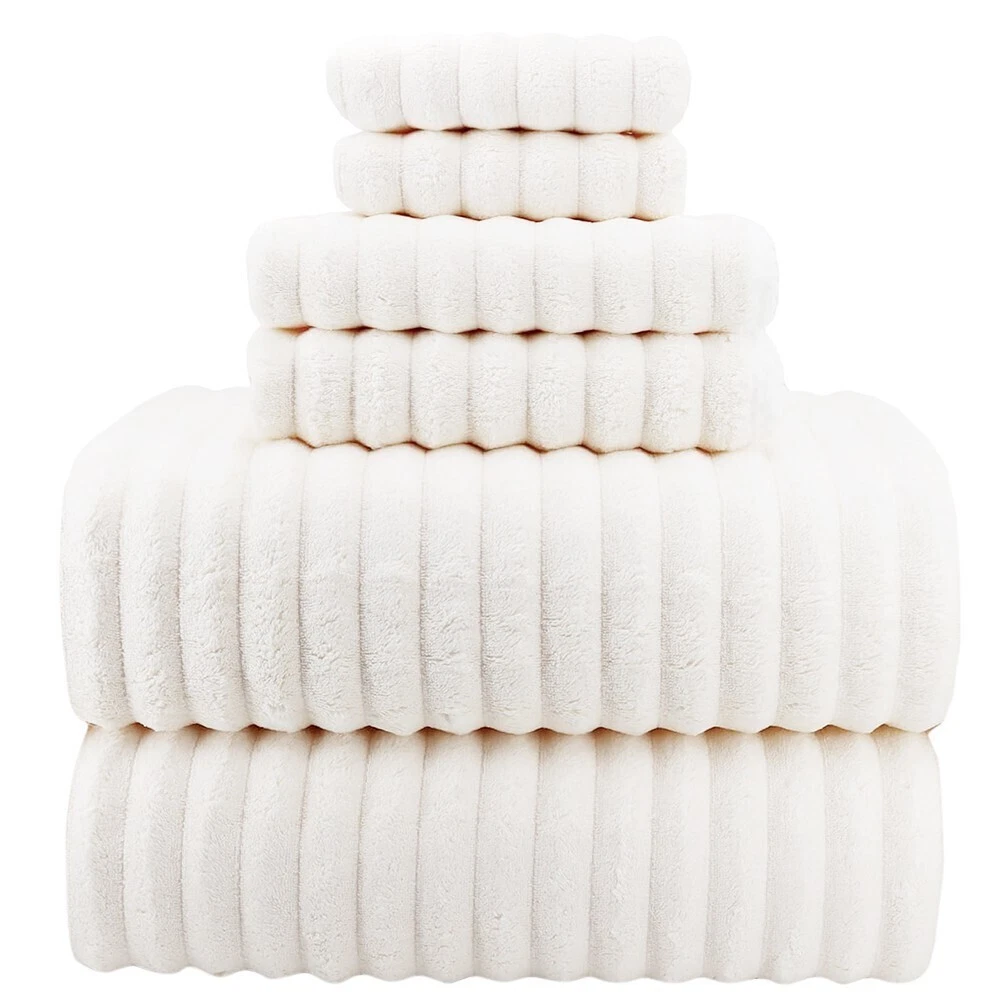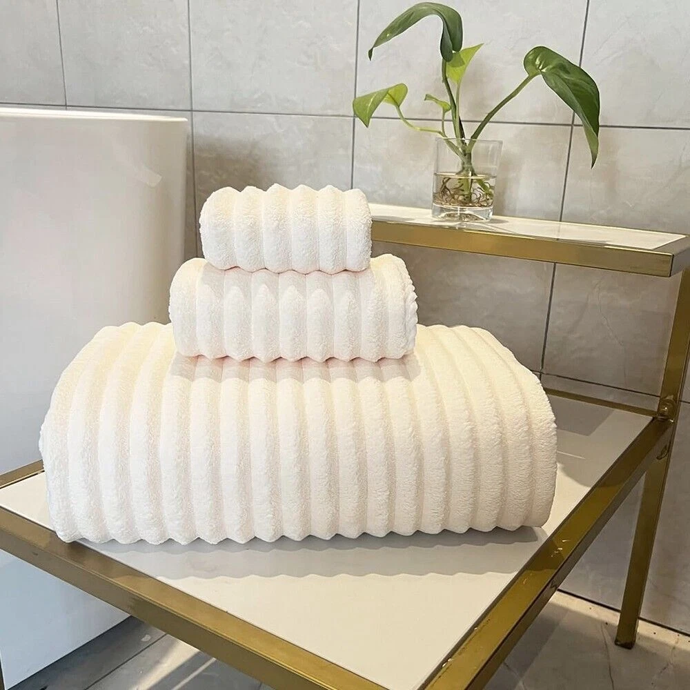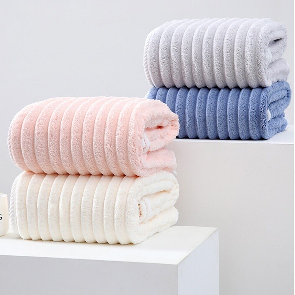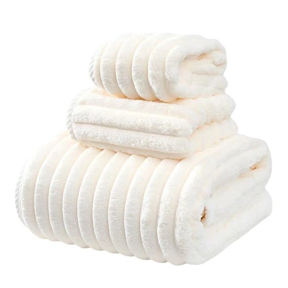 Set - 3-Piece Super Soft Candy Fleece Bath Towel Absorbent Square Towels Product name: Candy Fleece Towel 3-Piece Set Material: High-end Candy Fleece Weight: Approx. 16 oz (453g) 3 pcs Includes: 1x face towel (35 * 75cm) 1x dry hair cap (25 * 60cm) 1x bath towel (70 * 140cm) Premium Softness: Crafted from high-end candy fleece, offering an incredibly soft and skin-friendly touch, perfect for all family members, including those with sensitive skin. Superb Absorbency: Unique fiber structure ensures excellent water absorption, quickly drying your body and reducing the risk of catching a cold. Quick Drying: Designed to dry rapidly, keeping you comfortable and dry after every use. Stylish Design: Available in trendy colors like off-white, grey, blue, and pink, seamlessly blending into various home decor styles. Complete Set: Includes a face towel, hand towel, and bath towel, providing a versatile and stylish solution for your bathroom needs.