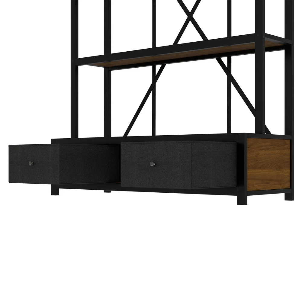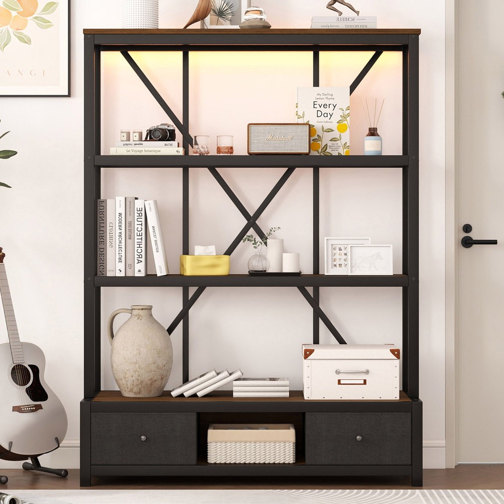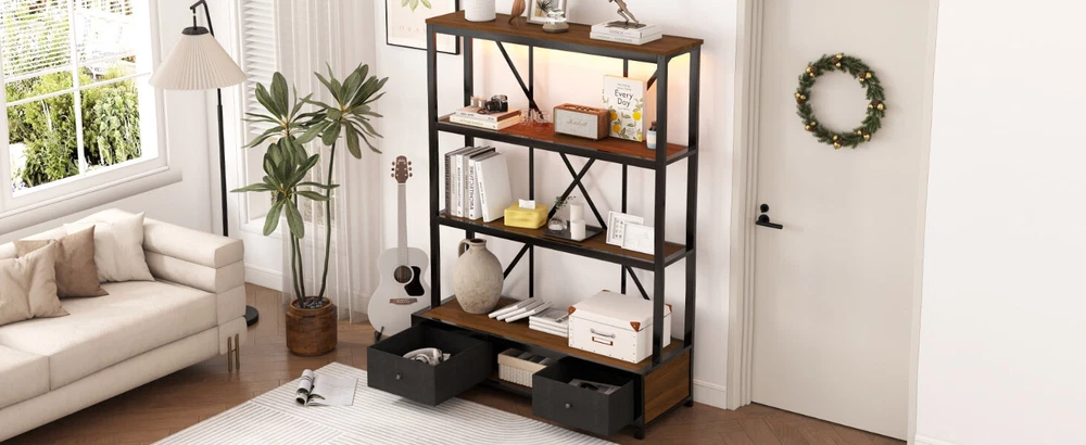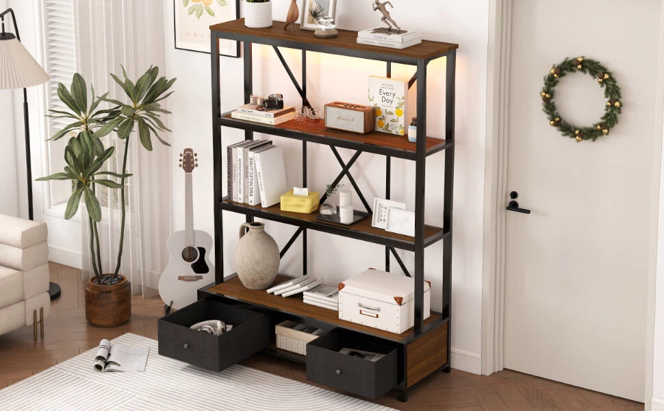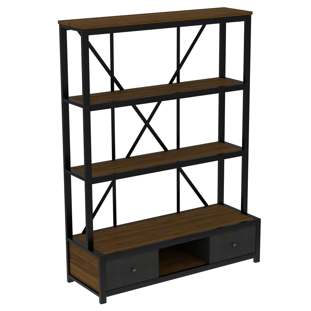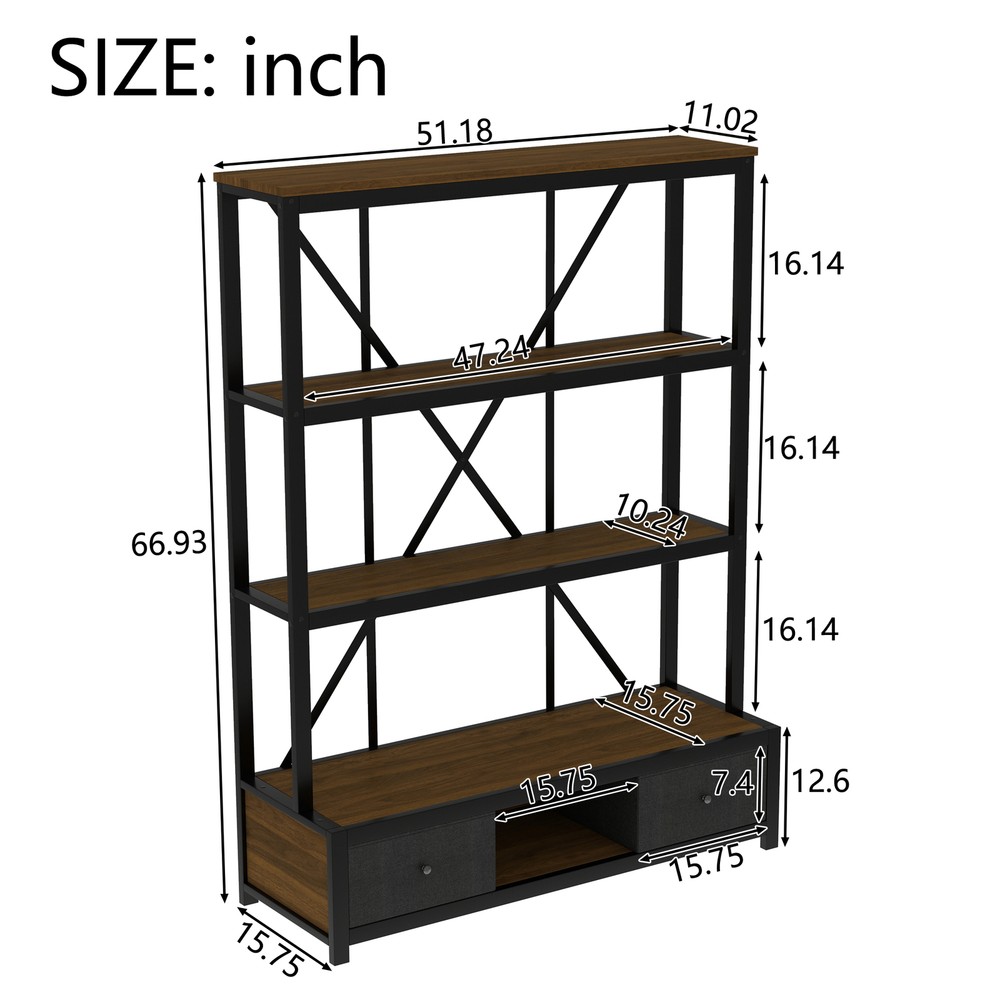 3-Shelf Metal Bookcase w/Drawers Bookshelf Open Storage Display for Home Office Features [Ample Storage] This bookshelf features an open design that blends the charm of minimalist and vintage furniture styles and provides ample space to display and store your books, decorations, plants and other daily items. [multi-purpose] The bookcase features 3 open shelves on the top, 2 non-woven drawers and an open shelving area on the bottom to organize your favorite reading material and collectibles; it can also be placed in your living room as a stylish shelf to display your framed family photos and potted plants. [Large Capacity] This bookshelf is made of high-density fiberboard, sturdy and durable, with a thick panel surface that is smooth and waterproof, convenient for daily cleaning, saving your mind and effort, providing you with storage needs and convenient life [Anti-tipping device] The product is equipped with an anti-tipping design that can be screwed to the wall to prevent tipping. In addition, each shelf features an upright design that prevents items from falling off. [Easy to assemble] To make assembling the bookshelf as easy as possible, we provide clear and detailed instructions and numbered parts. You can check the manual first and then follow the steps. Description Description The open design, a charming blend of minimalist and vintage furniture styles, provides plenty of space to display and store books, decorations, plants and other everyday items. 4 open shelving areas and 2 drawers for organizing your books or ornaments, etc. Description & Dimensions Product Type: Bookcase Overall Product Dimension: 51.18"L x15.75 "W x 66.93"H Color Walnut Color Numbers of Package 1 Overall Product Weight 79.37LBS Weight Capacity 80 lbs. weight capacity per shelf Product Material Metal+MDF Country of Origin China Note All the pictures are taken by actual samples, slight chromatic aberration may occur due to lighting or display