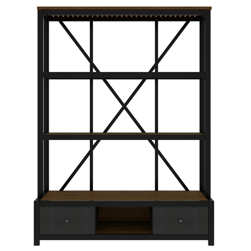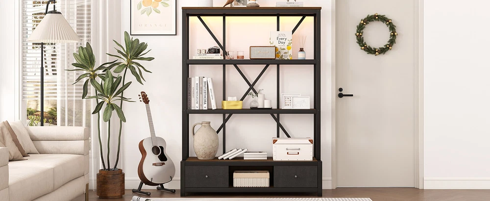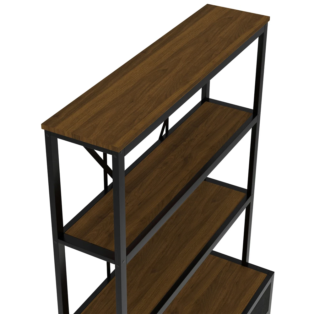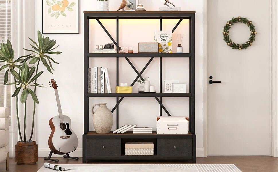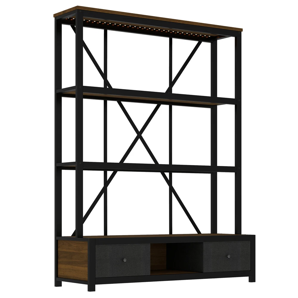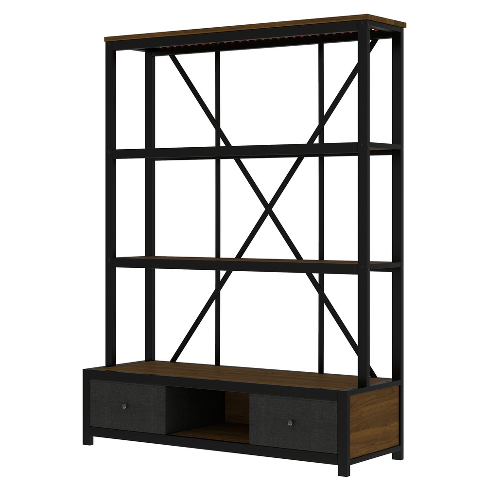 3-Shelf Metal Bookcase w/Drawers Bookshelf Open Storage Display for Home Office Features [Ample Storage] This bookshelf features an open design that blends the charm of minimalist and vintage furniture styles and provides ample space to display and store your books, decorations, plants and other daily items. [multi-purpose] The bookcase features 3 open shelves on the top, 2 non-woven drawers and an open shelving area on the bottom to organize your favorite reading material and collectibles; it can also be placed in your living room as a stylish shelf to display your framed family photos and potted plants. [Large Capacity] This bookshelf is made of high-density fiberboard, sturdy and durable, with a thick panel surface that is smooth and waterproof, convenient for daily cleaning, saving your mind and effort, providing you with storage needs and convenient life [Anti-tipping device] The product is equipped with an anti-tipping design that can be screwed to the wall to prevent tipping. In addition, each shelf features an upright design that prevents items from falling off. [Easy to assemble] To make assembling the bookshelf as easy as possible, we provide clear and detailed instructions and numbered parts. You can check the manual first and then follow the steps. Description Description The open design, a charming blend of minimalist and vintage furniture styles, provides plenty of space to display and store books, decorations, plants and other everyday items. 4 open shelving areas and 2 drawers for organizing your books or ornaments, etc. Description & Dimensions Product Type: Bookcase Overall Product Dimension: 51.18"L x15.75 "W x 66.93"H Color Walnut Color Numbers of Package 1 Overall Product Weight 79.37LBS Weight Capacity 80 lbs. weight capacity per shelf Product Material Metal+MDF Country of Origin China Note All the pictures are taken by actual samples, slight chromatic aberration may occur due to lighting or display
