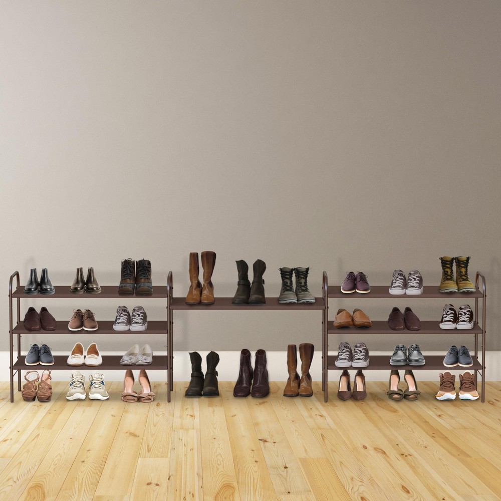 3-Tier Shoe Rack Storage Organizer, Bronze – Space-Saving Shoe Shelf, Holds 9–16 Pairs, Sturdy Metal Frame, Easy Assembly – Closet, Entryway, Bedroom Shoe Storage Solution Stores up to 9-16 pairs of shoes, additional bottom storage for more shoes. All shelves are height adjustable Sturdy metal construction with washable 600 D polyester fabric, each shelf holding up to 30 lbs Easy Assembly Personalized Storage: You can remove the panel to build into a 2-tier or 3-tier shoe rack to fit different kind of shoes Great solution to keep your entryway, closet, dormitory, patio, mudroom and garage away from mess Product Dimension: 11.2"D x 26.8"W x 20.9"H; Patent Pending