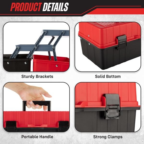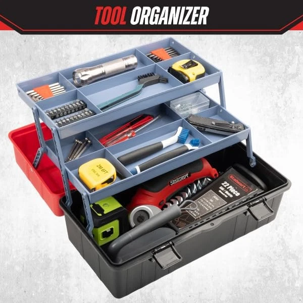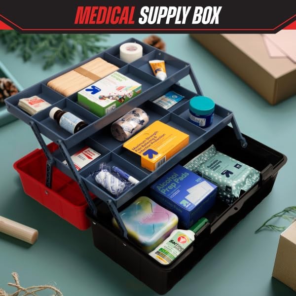 3-TIER TOOL ORGANIZER - This small tool box is big on storage capacity, with an open bottom and 2 storage trays divided into compartments that will make it easy to organize a variety of tools, hardware, and other items of different shapes and sizes. PORTABLE TOOL BOX - This travel-ready 15.94-inch-long tool organizer box weighs just 4.2lbs and has a built-in handle for easy carrying. Simply pack this empty tool box with all your essentials and you’re ready to complete repairs at home or on the go. DURABLE CONSTRUCTION - Our tough plastic organizer box is made from food-grade polypropylene with 2 secure latches, for a sturdy toolbox organizer that is water-resistant, dust-proof, and light-proof, with a stable base that resists tipping when open. MULTIPURPOSE USE - You can also use this small toolbox as craft box organizer or art supply storage case, as a medicine organizer box, nail supply organizer, tacklebox, hair accessory organizer, or hobby box for any other type of small items. PRODUCT DETAILS - Materials: Polypropylene. Dimensions: (L) 15.94” x (W) 8.46” x (H) 7.09”; Tray: (L) 14.25” x (W) 7.5” x (H) 1”; Bottom: (L) 15” x (W) 7.4” x (H) 4”; Capacity: 17.6lbs. Craft Box Trays Have 6 Fixed Compartments. Color: Black and Red.