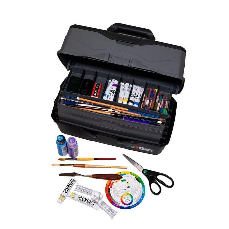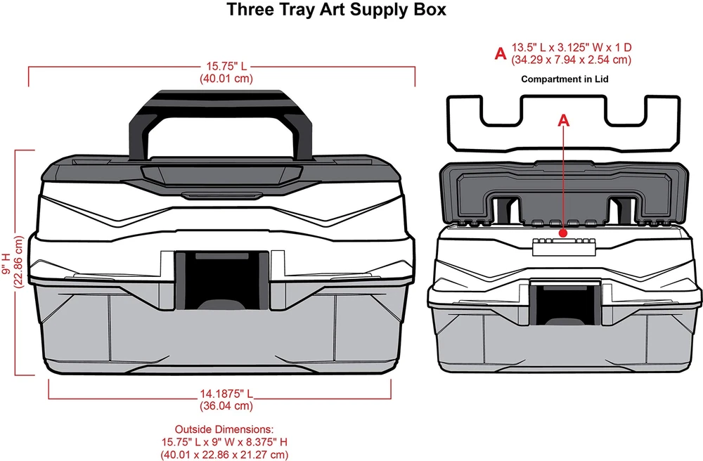 Introducing the 3 Tray Art Supply Box, an essential storage solution designed for art enthusiasts, students, and professionals alike. This functional supply box is tailored to organize and protect your valuable art tools, including paint brushes, pencils, and markers.Ideal for both seasoned artists and aspiring students, this art tool storage box boasts a cantilever tray with removable dividers, providing customizable compartments to accommodate various supplies. The spacious open area at the bottom of the box allows for convenient storage of bulkier art materials, ensuring you have everything you need at your fingertips.Efficiency meets accessibility with the in-lid storage area, offering quick and easy access to your essential tools. Crafted with durability in mind, this organizer is wear and tear-resistant, promising longevity even with frequent use. The tip grip tray with dividers ensures versatile storage, allowing you to tailor the space to your specific needs.The lockable latch adds an extra layer of security, keeping your art supplies safe and organized. Transporting your creative essentials is a breeze, thanks to the sturdy plastic handle that makes carrying the box effortless.Step up your art organization game with the NEW improved Three Tray Box. Featuring three cantilevered trays with removable dividers, this box provides enhanced storage options. The top tray is specifically designed for longer items such as paint brushes, pencils, and markers. The large open area at the bottom of the box remains perfect for storing bulkier supplies, catering to the diverse needs of both professional artists and art students alike.Elevate your artistic experience with the Tray Art Supply Box – the epitome of functionality, durability, and organization. Secure your creative essentials with this thoughtfully designed storage solution and enjoy the convenience of having everything you need right at your fingertips. Experience the perfect blend of practicality and versatility with the Tray Art Supply Box. Art Supply Storage Solution: 3 tray supply box for organizing various arts and crafts supplies, including paint brushes, markers, paints, stamps, glues, and more. Versatile and Accessible Design: Quick access in-lid storage for smaller items, spacious open area at the bottom for bulkier supplies like paint bottles, stamp pads, scissors, glues, and vinyl rolls. Durable Construction: Made from tough, wear-resistant hard plastic. Tip guard trays prevent liquid spills from art and craft supplies. Secure Closure and Convenient Transport: 3-Tray Art Supply Box with lockable latch for secure content storage. Sturdy plastic handle for easy and convenient transport. Wide-opening lid for effortless access to all your supplies. Product Specifications: 3 Tray Art Supply Box dimensions - 14.5 x 8 x 7 inches. Features 3 top trays with removable dividers.