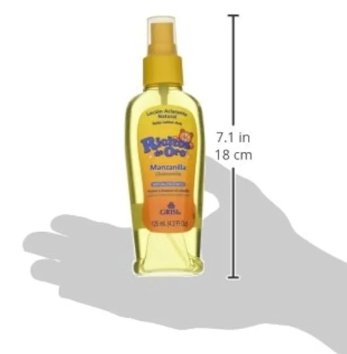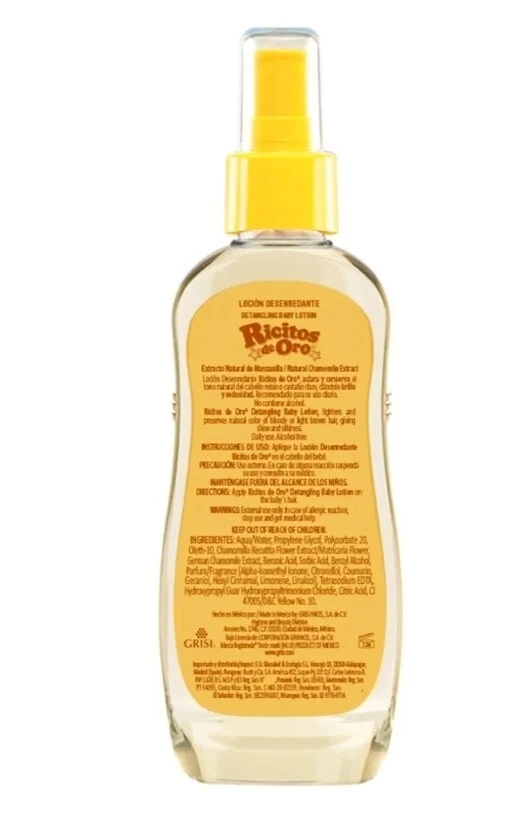 gtin13:Does not applyCustom Bundle:YesFormulation:SprayVolume:125ml eachType:HairsprayMPN:N/AScent:chamomileSuitable For:HairPeriod After Opening (PAO):36MProduct Line:Ricitos De OroColor:ClearHair Type:All Hair TypesBundle Description:3 packStyling Effect:Nourishing/Hydrating, Shine/GlossHold Strength:Light HoldUPC:Does not applyDepartment:UnisexFeatures:All Natural IngredientsBrand:Ricitos De OroSize Type:125 ml eachCountry/Region of Manufacture:Mexico