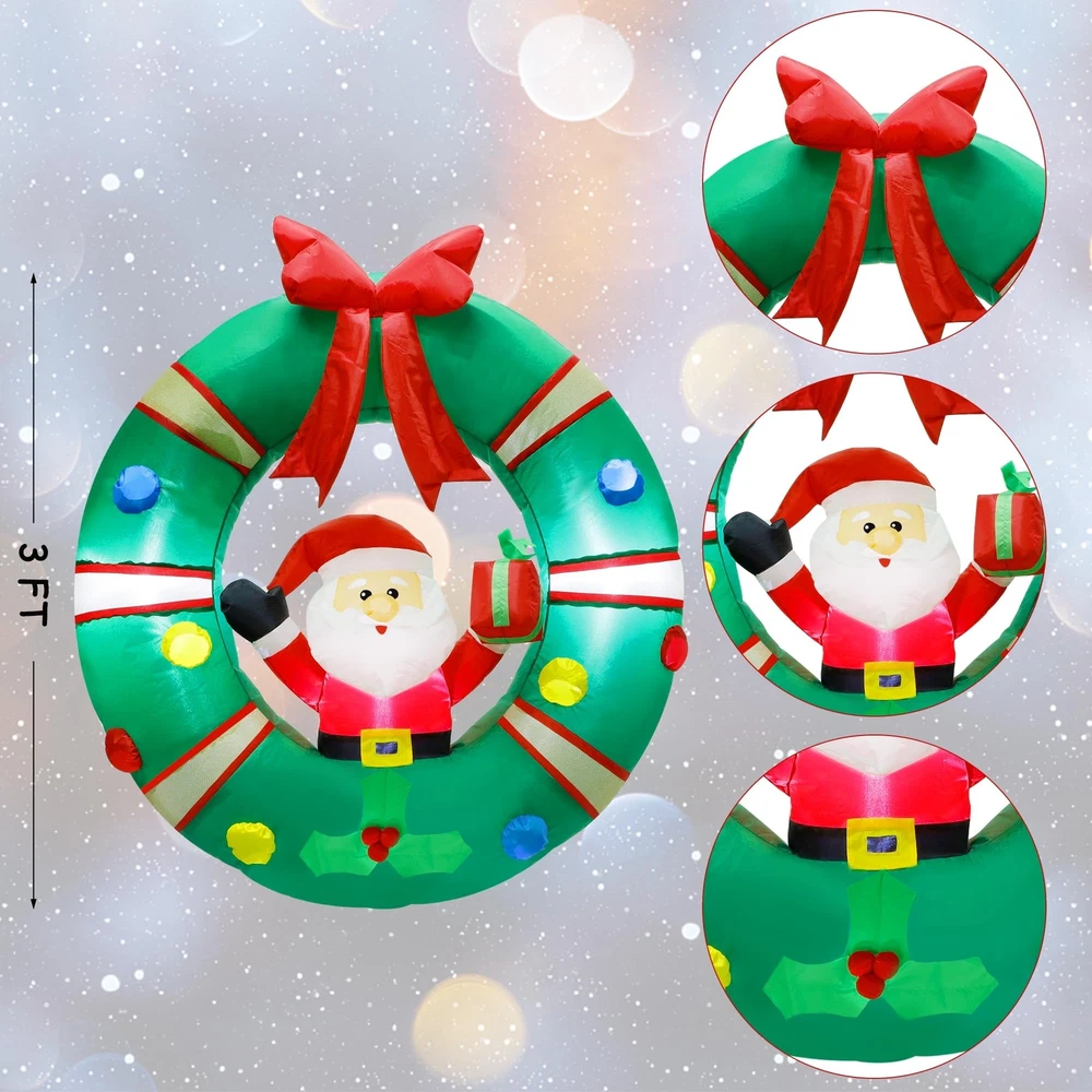 π Premium Materials: This inflatable Santa Claus sitting on the wreath is made of 100% polyester which is waterproof and sturdy enough so that you will never worry about any tears or holes. π Easy to Set Up: This blow up Santa Claus decorations with a built-in air blower, the inflatable wreath and Santa will blow up to about 3 foot tall within few minutes. This hanging Christmas wreath will come with 3.3 ft rope for hanging from door, porch, roofs, ceilings, trees, windows and so on. This wreath Christmas decoration will come with a drawstring storage bag, when not use, you can deflate it easily and store for next use without occupying much spaces. π Built-In LED Lights: The blow up yard decorations with 3 super bright pure white LED lights built inside that is realistic and sweet to light up your lawn or garden in the evening, create a Christmas festive atmosphere for the best attraction to kids, neighbors and guests, make your yard look perfect every Holiday night! π Perfect Christmas Yard Decoration: This 3ft Christmas wreath with a cute Santa Clause sitting on it, holding a Christmas gift box on his hand, it is the best choice as Christmas blow up yard decorations, it is the perfect size for Christmas outdoor garden yard decorations, will delight all your neighbors and guests. π Inflatable Christmas Decorations: This LED giant inflatable Santa is good to create a warm environment and increase the strong festive atmosphere, perfect for putting outdoors or indoors to dress up your Christmas Party. Ideal for Christmas outdoor, home, yard, garden, lawn, patio, porch decoration and more!