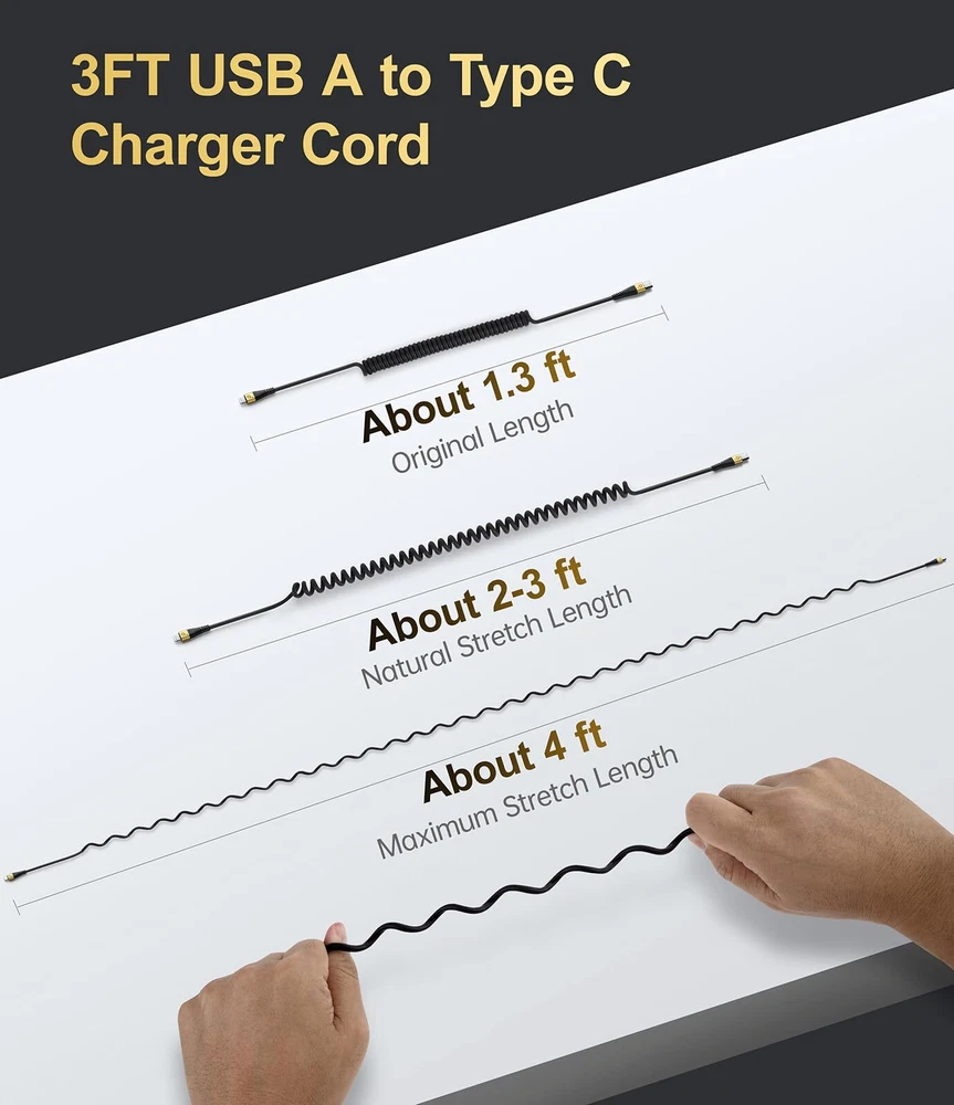 USB C Cable Fast Charging, 2Pack 3ft Coiled USB A to Type C Charge Cord for Car, USB-C Charging Cable Compatible with Samsung Galaxy S20 S10 S9 S8 Plus Note 10 9 8 and Other USB C Devices-Gold Elastic Coiled USB C Cable Made for Car: The USB Type-C cable is designed with stretchable, no tangle, no knot, and does not take up space. This coiled USB C charging cable is made of upgraded high quality PU material, which is flexible, easy to stretch, effortless, quick to rebound and not easily deformed. Length of Use: 1.3 Feet before stretching, maximum stretch length is 4 feet. Comfortable length of use is 2-3 feet and bounce back to normal length well. Convenient for charging your devices in the bedroom, on the sofa, in the office, while travelling. Easy to use for different occasions, perfect for your different needs. 66W Fast Charge & Data Transfer: PRAKIE USB a to USB c cord supports fast charge and sync fast data transfer, max current is 66W , speed of data transfer up to 480Mbps.This USB c charging has a built-in intelligent safety chip, intelligent thermostat, supports charging while playing, and automatically filters voltage fluctuations to effectively protect the device. Widely Compatibility: USB type-c cables charging cord compatible with Samsung Galaxy S10 S10e S10+ Plus 5G S8 S8+ S9 S9+ S8 Plus S9 Plus, Note 8 Note 9 Note10 Note10+ Plus 5G, A10e A20 A30 A40s A50 A60 A70 A80 M30s A9/9s A9 Star A8s(2018) A6s C9 C7Pro C5Pro. Google Pixel 2 2XL/Pixel XL/Nexus 5X/Nexus 6P. LG V30 V20 G6 G5, Power Bank、tablets and other type c devices. What You Get: 2PCS 3 feet USB a to USB c cable(66W) and 12-Month warranty. We have a professional customer service team that will do our best to provide you the satisfactory service and give you pleasant shopping experience. Elastic Coiled USB C Cable Made for Car: The USB Type-C cable is designed with stretchable, no tangle, no knot, and does not take up space. This coiled USB C charging cable is made of upgraded high quality PU material, which is flexible, easy to stretch, effortless, quick to rebound and not easily deformed. Length of Use: 1.3 Feet before stretching, maximum stretch length is 4 feet. Comfortable length of use is 2-3 feet and bounce back to normal length well. Convenient for charging your devices in the bedroom, on the sofa, in the office, while travelling. Easy to use for different occasions, perfect for your different needs. 66W Fast Charge & Data Transfer: PRAKIE USB a to USB c cord supports fast charge and sync fast data transfer, max current is 66W , speed of data transfer up to 480Mbps.This USB c charging has a built-in intelligent safety chip, intelligent thermostat, supports charging while playing, and automatically filters voltage fluctuations to effectively protect the device. Widely Compatibility: USB type-c cables charging cord compatible with Samsung Galaxy S10 S10e S10+ Plus 5G S8 S8+ S9 S9+ S8 Plus S9 Plus, Note 8 Note 9 Note10 Note10+ Plus 5G, A10e A20 A30 A40s A50 A60 A70 A80 M30s A9/9s A9 Star A8s(2018) A6s C9 C7Pro C5Pro. Google Pixel 2 2XL/Pixel XL/Nexus 5X/Nexus 6P. LG V30 V20 G6 G5, Power Bank、tablets and other type c devices. What You Get: 2PCS 3 feet USB a to USB c cable(66W) and 12-Month warranty. We have a professional customer service team that will do our best to provide you the satisfactory service and give you pleasant shopping experience. Shipping from the USA All of our products are shipped from the USA, ensuring quick delivery to your destination. Payment We offer the following payment methods: PayPal, credit card, bank transfer, and eBay's secure payment system. Free Shipping & Free Returns Shipping within the USA is FREE. Additionally, any return is absolutely free for you. Risk-Free Purchase You have the option to return an item within 30 days without any justification. We cover the return shipping costs! Fast Shipping We ship immediately upon receipt of payment. Generally, the package is delivered within 2-3 days in the USA. If it takes longer, we will contact you. Quality and Costs Made in Europe, USA, China No customs fees or additional charges Total satisfaction guarantee Invoice with declared VAT available upon request in .pdf format Feedback Your feedback is very important to us. After you pay for your purchase, you will automatically receive positive feedback from us.