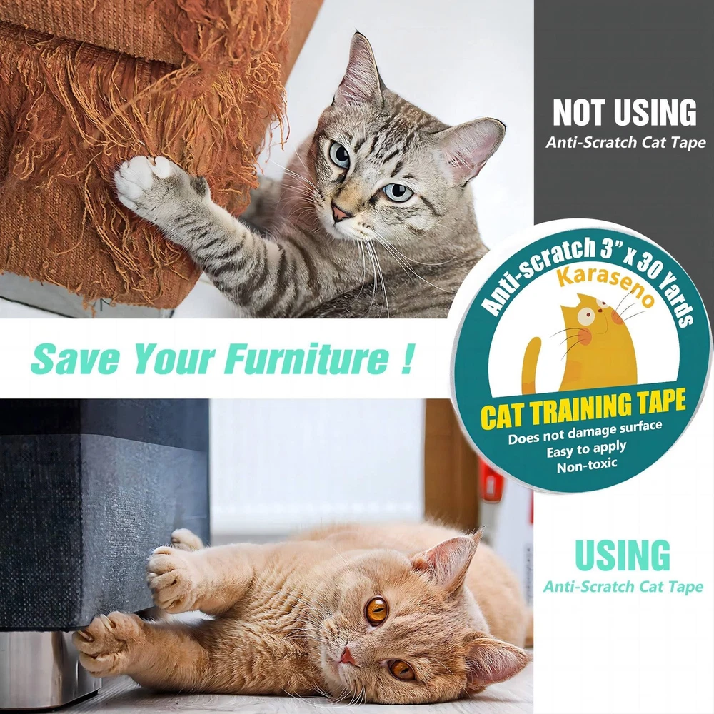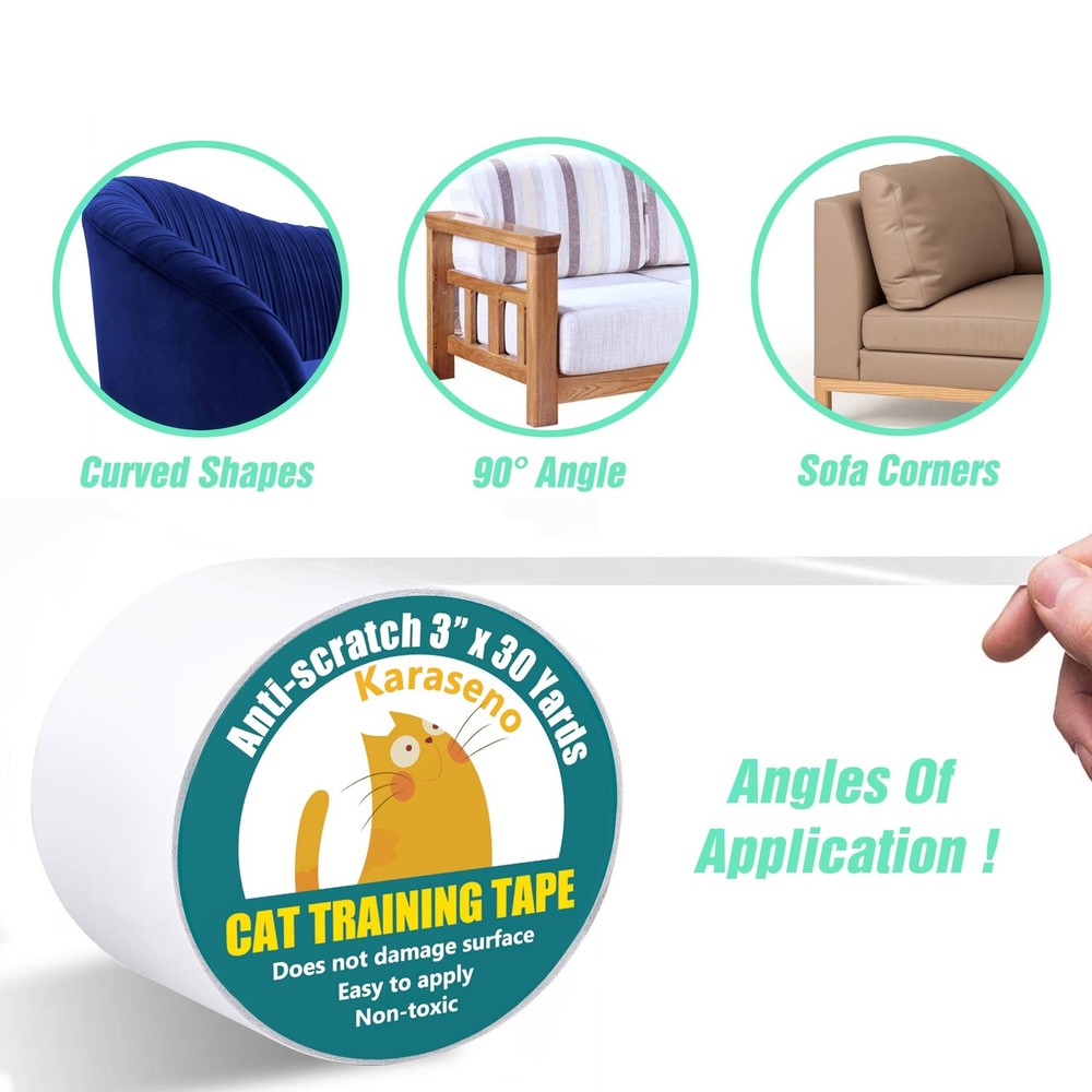 Anti Cat Scratch Tape, 3 inches x 30 Yards Cat Training Tape, 100% Transparent Clear Double Sided Cat Scratch Deterrent Tape, Furniture Protector for Couch, Carpet, Doors, Pet & Kid Safe Product Details Size: 3 inches x 30 Yards Brand: KARASENO UPC: 738627551857 EAN: 0738627551857 MPN: Does not apply Product Dimensions: 4.5"L x 4.5"W x 3"H Breed Recommendation: All Breed Sizes Specific Uses For Product: Climbing, Jumping Recommended Uses For Product: Indoor Material: Paper Product Dimensions : 4.5 x 4.5 x 3 inches; 15.8 ounces Date First Available : January 7, 2020 Manufacturer : Karaseno Country of Origin : China Best Sellers Rank: #3,508 in Pet Supplies (See Top 100 in Pet Supplies) #5 in Cat Scratcher Accessories & Parts #5 in Cat Scratcher Accessories & Parts Customer Reviews: 4.2 4.2 out of 5 stars 4,563 ratings Item Weight: 15.8 ounces Manufacturer: Karaseno Country of Origin: China Date First Available: January 7, 2020 Item Package Dimensions L x W x H: 4.53 x 4.49 x 2.99 inches Item Dimensions LxWxH: 4.5 x 4.5 x 3 inches Item Weight: 15.8 Ounces Brand Name: KARASENO Target Audience Keyword: house-cats Color: Green Size: 3 inches x 30 Yards Material: Paper Care Instructions: Hand Wash Only Number of Items: 1 Style: Safety Breed Recommendation: All Breed Sizes Included Components: Cat Training Tape Specific Uses for Product: Climbing, Jumping SAVE THE FURNITURE TRAIN THE CATS: This anti-scratch cat training tape helps to train your cat to stop scratching your couch by using cats natural hateness of sticky surface, and eventually develop the habit of not clawing your expensive furniture. NON-TOXIC & CLEAR: Made by environmental friendly material and the best glue this the industry. Your pets safety is the upmost priority, which it is guaranteed. And the crystal clear look of this tape, blends right in with your home decor style. PRECAUTION BEFORE USING: While using the latest adhesives technology, the product may react differently to various types of surfaces, it is highly recommended to test out a short strip to a small corner of the surface to verify how the furniture will react before taping all over the furniture. EASY INSTALLATION : Peel and adhere the product to where cat scratches, peel off the white backing paper. Then you got yourself a personal 24 hour protector of your furniture! Its the easiest way to save sofas, couches, leather, beds, tables, counters, doorways, screen porches and more! MULTIPURPOSE: This product will made a great double-sided tape for mounting things and on DIY projects. You and your pets satisfaction is our final goal. Every Karaseno product comes with 24 hours customer service.
