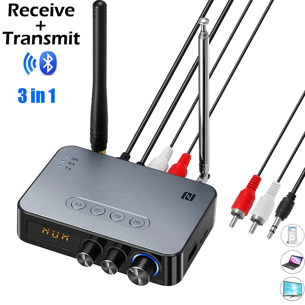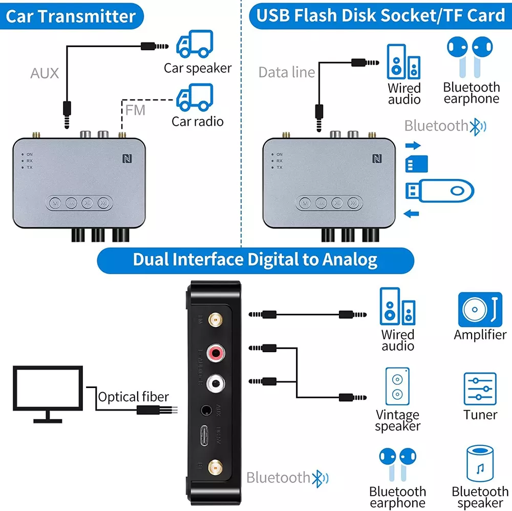 [Three-in-one design]: Support Bluetooth receiving (RX), Bluetooth transmitter (TX), FM transmitter mode. Equipped with HD LED display, working status and Bluetooth mode can be clearly seen. With multi-function keys, one - click switch mode, or play/pause music, easy to operate. Support wireless music listening, hands-free calling, navigation, make your driving safer 3in1 Bluetooth 5.1 Transmitter Receiver Wireless NFC to RCA Stereo Audio Adapter Bluetooth V5.1 Transmitter Receiver Audio Adapter - 3 In 1 Wireless Bluetooth Adapter NFC Bluetooth Receiver Transmitter HiFi with Low Latency 3.5mm AUX RCA Coaxial for Home Stereo, Car, PC, TV About this item: Dual Transmit Dual Receive: 3-in-1 Bluetooth Adapter support RX, TX and FM, support NFC wireless connection. As an audio Bluetooth transmitter, it stream audio from TV, PC, laptop to two Bluetooth headphones. Or use it as a receiver to stream your cellphone audio to home stereo as well as any device with a 3.5mm audio jack. Enjoy the wireless tech life High-fidelity Surround Sound: Built-in Bluetooth V5.1 chip, equipped with aptX lossless transmission technology and intelligent noise reduction system, DSP digital audio processing chip, you can manually adjust the treble and bass to make the sound clearer and enhance the surround sound Long-Range Wireless Connection: The latest version 5.1 Bluetooth wireless communication standard is adopted, external Bluetooth signal gain transceiver antenna and FM radio antenna. Bluetooth receiver can achieve 100 feet (30m) range, stable transmission, audio is not easy to cut in/out Multiple Interface Options: built-in digital to analogue chip, supports 3.5 mm jack AUX, RCA, coaxial, USB flash drive , TF interface, 6.5mm audio line microphone can be connected. Comes with AUX cable, RCA cable, USB charging cable, it can meet all your connection requirements and meet different audio devices with Bluetooth and non-Bluetooth function Rechargeable & Long Playtime: Built-in with 1200mAh battery that supports the receiver for non-stop streaming up to 8-10 hours, long standby time of 30 days. Can be used while charging. Compliance with safety certification, longer service life Product Description Built-in FM Radio Unlock A Rich Music World Support Microphone Equipped with a professional karaoke-level chip, the remote control can realize operations such as microphone volume/mixing/cancelling original sound Old speakers/amplifiers/DVD players can easily upgrade Bluetooth 5.1 function Upgrade old-fashioned active speakers, built-in DSP sound chip, stereo sound quality is more pleasant Equipped with Bluetooth 5.1 + DSP dual upgrade chip, quick response Fast transmission of Bluetooth signals, reject delays, and have no lag 1200mAh Lithium Battery Low power consumption design, listen to music for 8 hours, and experience long-lasting music journey Supports simultaneous charging and playback, unlimited indoor and outdoor use 30 Meters Long-Distance Transmission External 2.4G Bluetooth antenna, 30 meters signal transmission without barriers Payment Delivery details Terms of sales About us Contact us Payment - We only accept payment via PayPal. Please kindly check if you can do the payment via PayPal before placing an order. If you do not have PayPal account. - Payment must be received within 7 days after auctions ended. Unpaid dispute will be filed to eBay for the non payable bidders. Delivery details - We will ship all orders within 2 business day of payment. - The shipment usually takes 1-5 business days (Saturday and Sunday excluded). - If you need the item urgently, please contact us for detail before purchase. - Local pick up is not available. Terms of sales 1 .Our items come with our warranty. 2.Our warranty does not extended to any products that are physically damaged or that are not under normal operating conditions as a result of misuse or improper installation on the buyer/user's part. 3.This product comes with 30-Day Money Back Guarantee. 4.We stand behind every product we sell. If you're not pleased with your purchase, we'll be happy to make an exchange or refund. 5.For all returned products, please contact us for the returning address. About us 1.Your better comments will be an encouragement for us as a new and honest seller to offer the better quality and the better service in future. 2. If you are not satisfied with them, please contact us first via "Contact Seller" before leaving any Negative feedback or open any dispute ,we will reply you within 1-2 working days and We shall try our best to solve your problem to your satisfaction.Thanks for your trust and understanding in advance. Contact us 1. Please contact us in time if there is any further question or suggestion, we will reply you within 1-2 working days. 2. Hope you have a good shopping experience in my store.Thank you so much for your support!