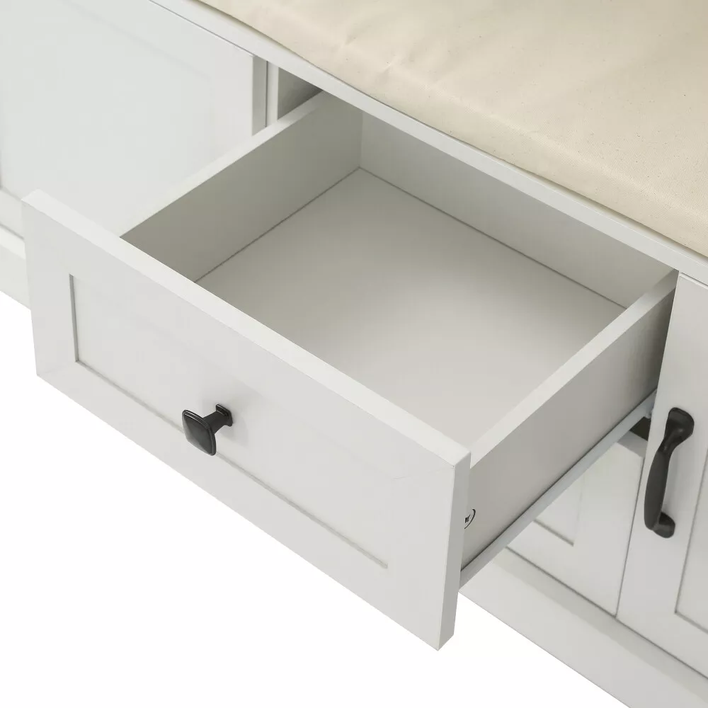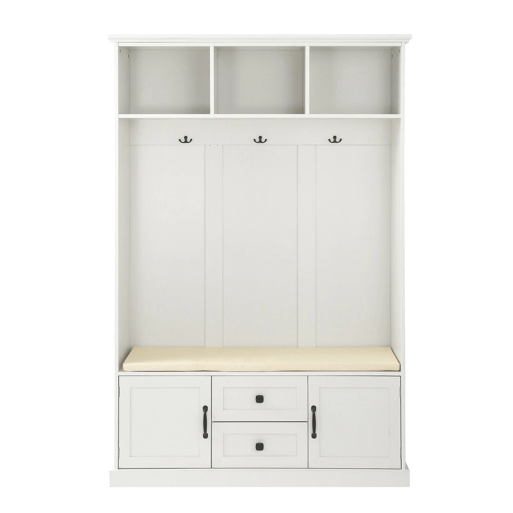 Product Features A hall tree which decorate your entryway and organize your coat, shoes and any other belongings, make your entryway tidy and become a good helper for your home life. Three open storage shelves, 3 metal double hooks, with shoes bench and shoes storage space in the bottom, maximize storage function of your entryway,avoid clutter in the home,at the same time save your space of your home. Including assembly manual and all necessary hardware and fasteners. Components are pre drilled and pre cut for assembly. Description Classic details give our Storage Locker a traditional look, but clean lines and a modern finish bring this hall tree into the now. Generous, sweeping crown molding accents the top of the case; 3-open cubbies lie below it, awaiting your display items, books, accessories and more. The open area beneath the cubbies features elegant beaded-board paneling, 3-double hooks for coats and bags, and a comfortable seat with cushion. The grand finale of this mudroom storage piece, 2-drawers and 2-doors that allow you to store away even more necessitie. Weights & Dimensions Hall Tree 70.9'' H x 15.74'' D x 47.24'' W Top Weight Capacity 22 lbs Top Cabinets Capacity 11 lbs Cabinets Capacity 44 lbs Table Top Thickness 1.37'' Clearance-Floor to Bottom 2.75'' Hook Weight Capacity 6 lbs Cabinets Size 14.3'' H x 13.37'' D x 14.3'' W Cushion Size 1.18'' H x 13.38'' D x 43.7'' W Specifications Pieces Included 1 Hall Tree Top Shape Rectangle Product Material Particle board Purposeful Distressing Type NO Shelves Included Yes Number of Shelves 3 Drawers Included Yes Number of Drawers 2 Cabinets Included Yes Number of Cabinets 2 Country of Origin China Level of Assembly Full Assembly Needed Suggested Number of People for Assembly/Install 2 Estimated Time to Set Up 1h Adult Assembly Required Yes
