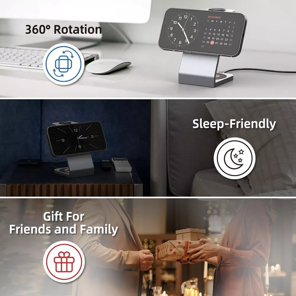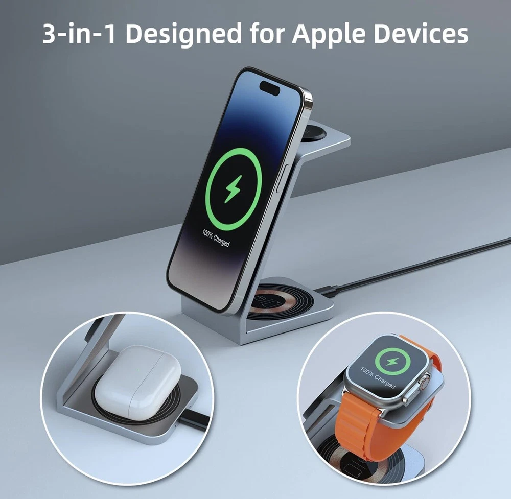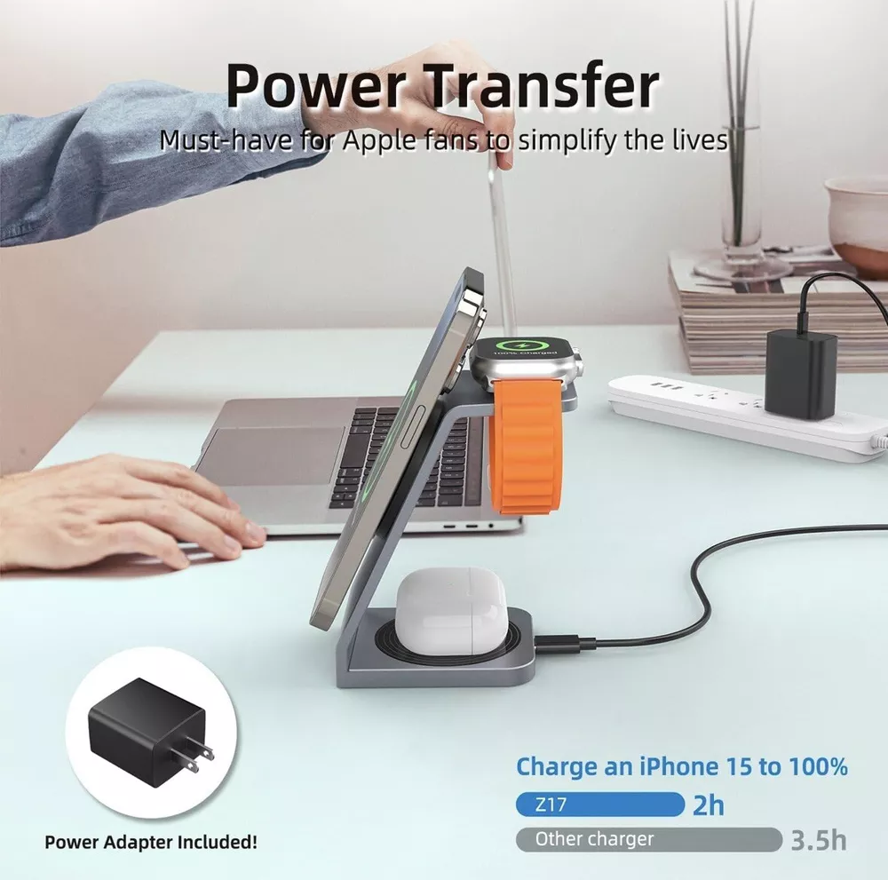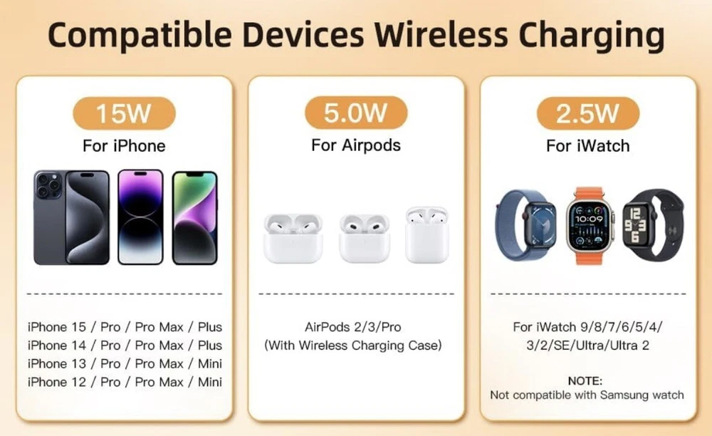 What's in the box Wireless Charging Station 18W Wall Adapter USB-C Charging Cable User Manual Compatible phone models: iPhone 13/13 Mini/13 Pro/13 Pro Max, iPhone 12/12 Mini/12 Pro/12 Pro Max, iPhone 15/15 Plus/15 Pro/15 Pro Max, iPhone 14/14 Plus/14 Pro/14 Pro Max Compatible devices: iPhone 15/14/13/12 Series, AirPods Pro 1, AirPods Pro 2, Apple Watch Ultra/9/8/7/6/5/4/3, AirPods 3/2