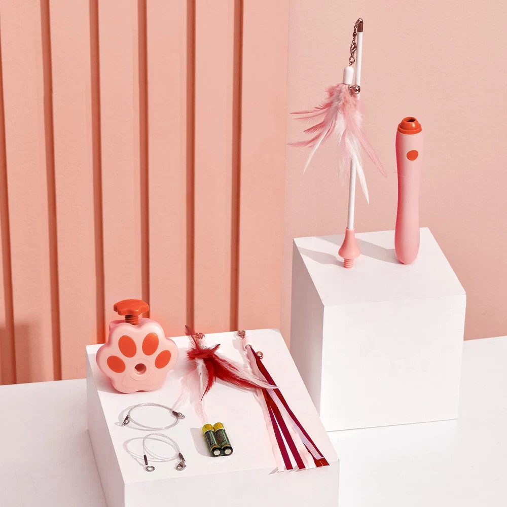 NEW VERSION Wand & Pointer Chasing Combo Cat Toy You Cat Can't Wait to Get Its Paws On -Activates your cat’s hunting instinct to get him physically active and mentally engaged with colorful wigglers and removable bell. -Stands up to daily, heavy-duty playtime thanks to the carbon fiber and break-resistant fiberglass pole. -Pole features a super strong tip with reinforced eyelet, and the string is made of rope-like nylon that won’t strain or fray. -Easy-to-use clasp so you can swap the wigglers as needed to help keep your pal excited, and is made with all pet safe materials. Multiple play ways: -Clear pointer in the base allows you to project a re.d dot onto the floor and encourage your cat to chase her mysterious prey. -Can be used as a standard cat wand with the two included attachments. - Can fix the cat wand on table, cat litter board, cat tower or door with a thickness of no more than 1.1 inch to attract cat -Made from ABS plastic and fiberglass for flexibility and durability. Natural feathers & Replaceable toy accessories Cats love feathers, and there is hardly anything more entertaining than watching a cat flip around in the air trying to catch them. Specification: Size: 9X9X6.2cm/3.54x3.54x2.45inch Certification: CE, ROHS, FCC, FDA Packing Content: 1*Toy 2*Feather 1*Color ribbon 2* String 2*Batteries Not just a cat feather wand toy. Get your cat moving and keep them entertained. 【3 IN 1 INTERACTIVE CAT TOYS】The fun cat toy has 3 ways: a fishing rod with feathers or ring ribbon, fix installation on your table and chasing toys. Bring double fun to your pet cat`s hunting instinct and pursuit all around. Keep cats feeling fresh all the time. Reduce destructive behavior. 【MULTIPLE PLAY WAYS】①Used as a standard cat wand with the two included attachments. ②Can fix the cat wand on table, cat litter board, cat tower or door with a thickness of no more than 1.1 inch to attract cat. ③Allows you to project a red dot onto the floor and encourage your cat to chase her mysterious prey.(Batteries included) 【RETRACTABLE FISHING ROD】This telescoping wand can reaches out a maximum of 30’’ and shrink it down 16.5’’ for storage. The rod itself is made from ABS plastic and fiberglass for flexibility and durability. The end of the rod has a comfortable handle for extended play sessions. 【RETRACTABLE FISHING ROD】This telescoping wand can reaches out a maximum of 30’’ and shrink it down 16.5’’ for storage. The rod itself is made from ABS plastic and fiberglass for flexibility and durability. The end of the rod has a comfortable handle for extended play sessions. 【REAL COLOR FEATHER】Cats love feathers. Nothing more entertaining than watching a cat flip around in the air trying to catch them. The feathers of this pet toy are genuine and many cats like them better than synthetic options. Two feathers are included, saving your cost to buy .