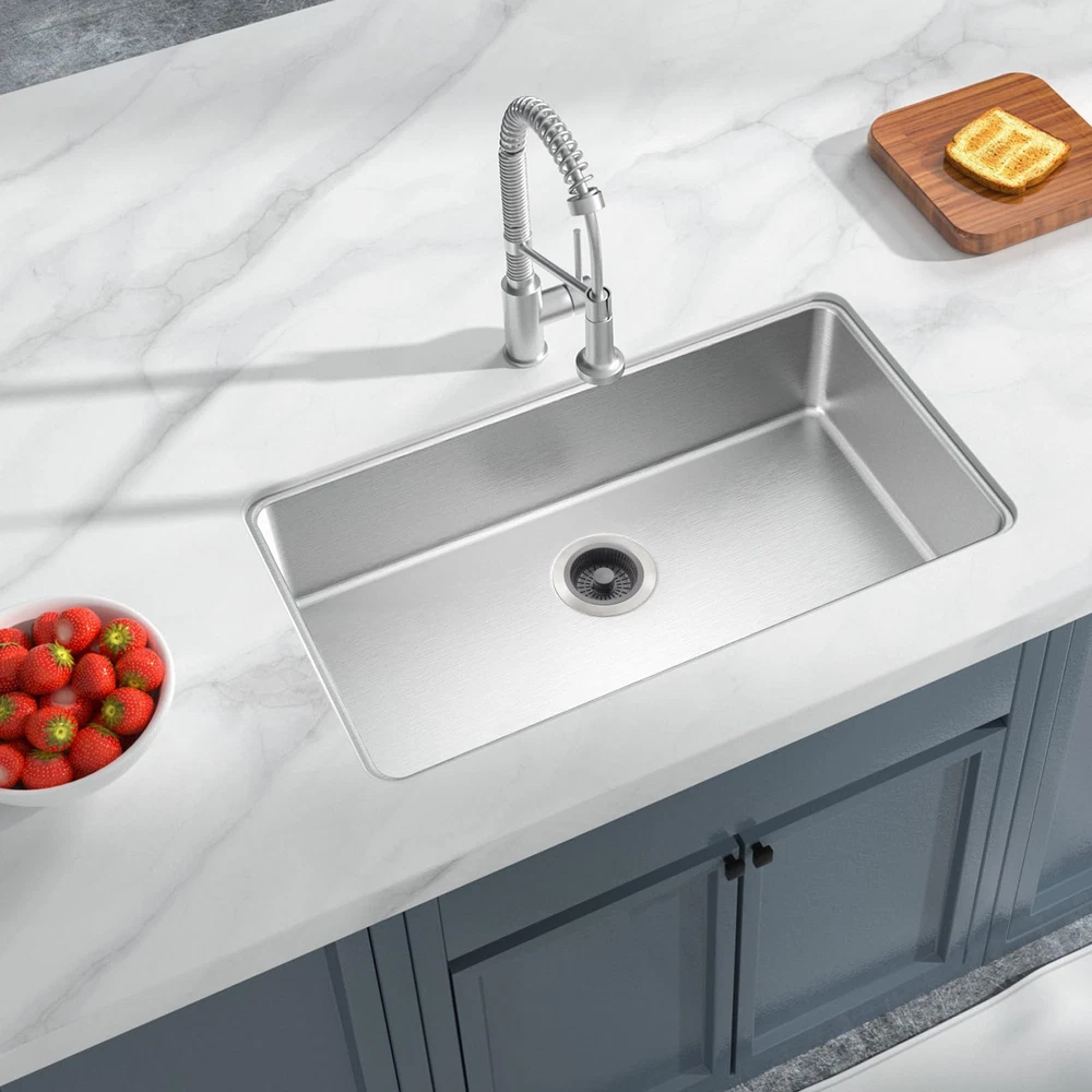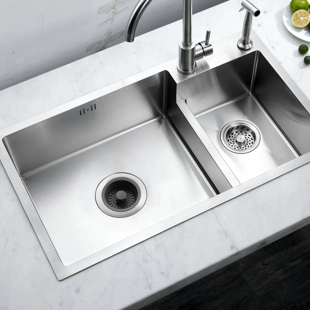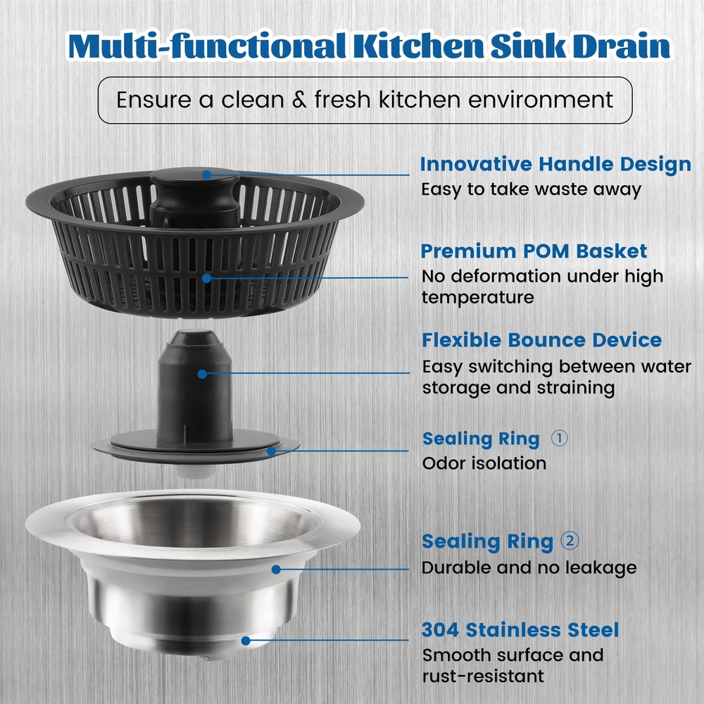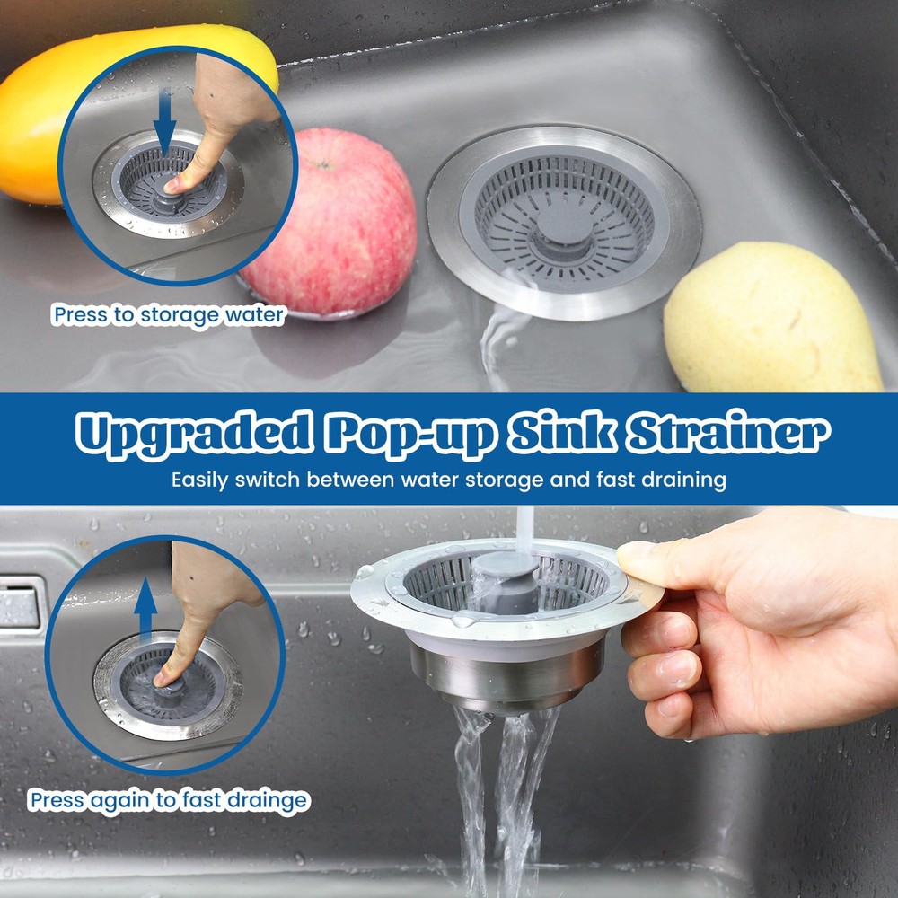 【Upgraded 3 in 1 Kitchen Sink Strainer and Stopper】The Kitchen sink drain strainer is designed with a pop-up device that combines 3 functions: water storage, clogging and odor features. Compared to other single-function kitchen sink strainers, it simplifies your kitchen work while ensuring high performance. 【Suitable for US Standard Kitchen Sink】kitchen sink drain strainer fits for most US standard sink sizes with a width of 2.76 "-3.38 ", depth >1.77 " opening sink hole. Please measure the diameter and depth of the sink drain before purchasing. 【Durable Quality Material】Our kitchen sink stopper is made of high quality 304 stainless steel and ABS material, which can withstand high temperature and highly resistant to deformation, rust, and scratches. Ensures long life and reliable performance. 【Anti Clogging & Prevent Odors】The kitchen sink drain stopper has 2mm diameter multi-filter allows small impurities to be passed, and effectively catch food waste and prevent clogging. Our sink drain strainer has sealing washer at the bottom to effectively isolate odors and foreign matter. 【Fast Drainage & Easy to Clean】The stainless steel body of our sink stopper kitchen drain is designed with three large drain holes for fast and efficient drainage, preventing slow draining and clogging. The ABS strainer basket is very easy to clean and won't cling to light food waste like traditional metal sink strainers.