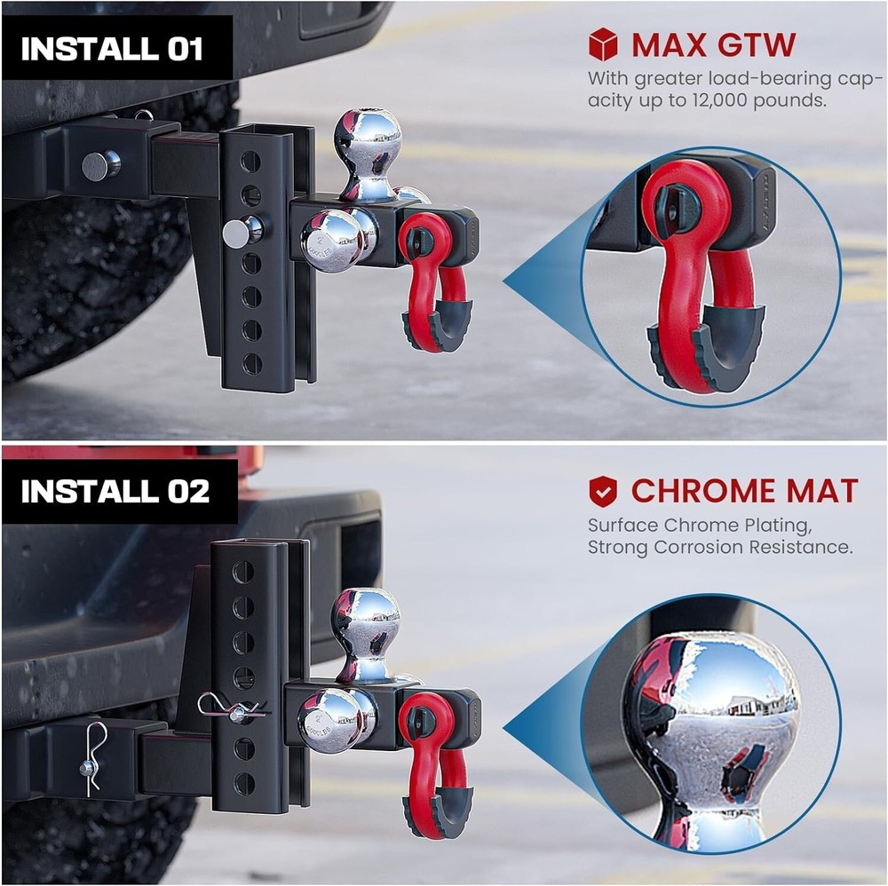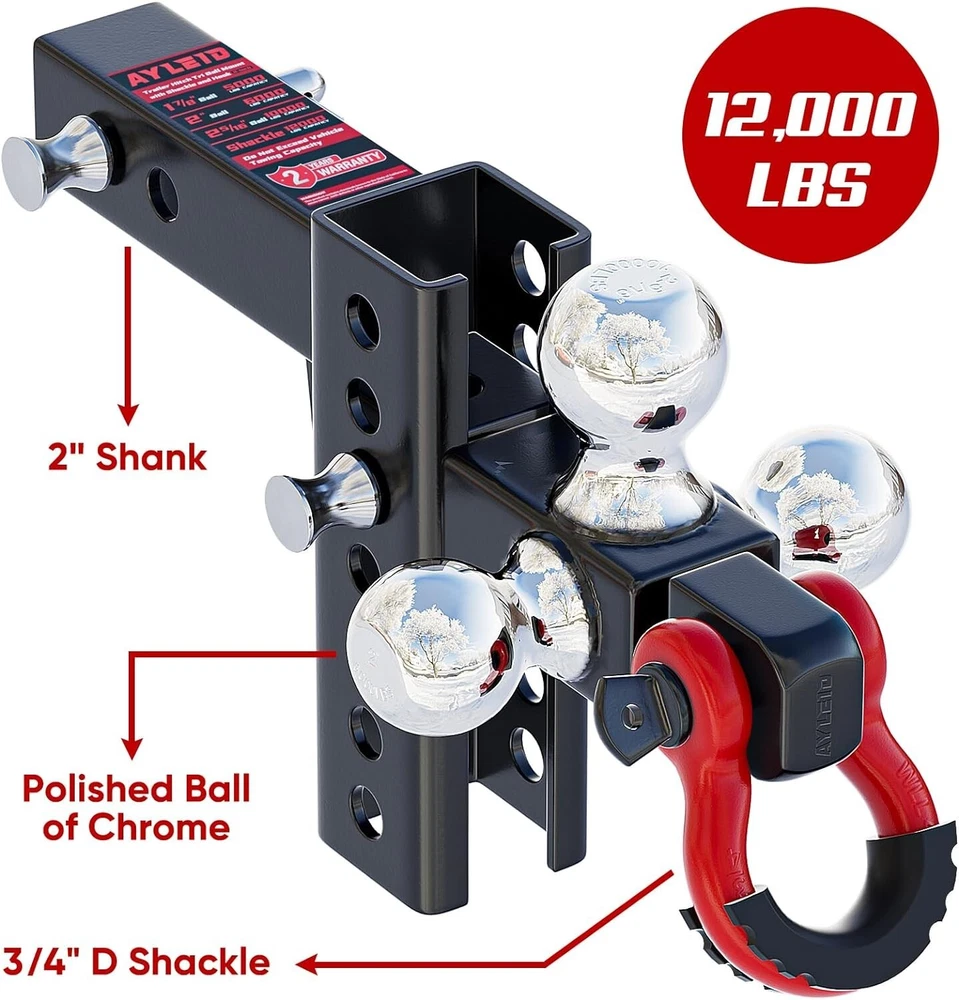 Trailer Hitch Tri-Ball Mount with Hook&Pin&Rotatable Tow Shackle,Fits 2-in Receiver with 1-7/8-in,2-in,2-5/16-in Hitch Ball C-Adjustable with Shackle [ Hitch ball size ] 1-7/8 inch , 2 inch , 2-5/16 inch , Tow Hook , 3/4 inch D Ring Shackle [ Receiver size ] 2-inch [ Weight rating ] 5000 LBS / 6000LBS / 10000LBS / 12000LBS [ Quality ] Heavy duty black powder coat finish, Silver hitch ball [ satisfaction ] satisfaction ! Adjustable Trailer Hitch Tri-Ball Mount with Hook&Pin&Rotatable Tow Shackle,Fits 2-in Receiver with 1-7/8-in,2-in,2-5/16-in Hitch Ball