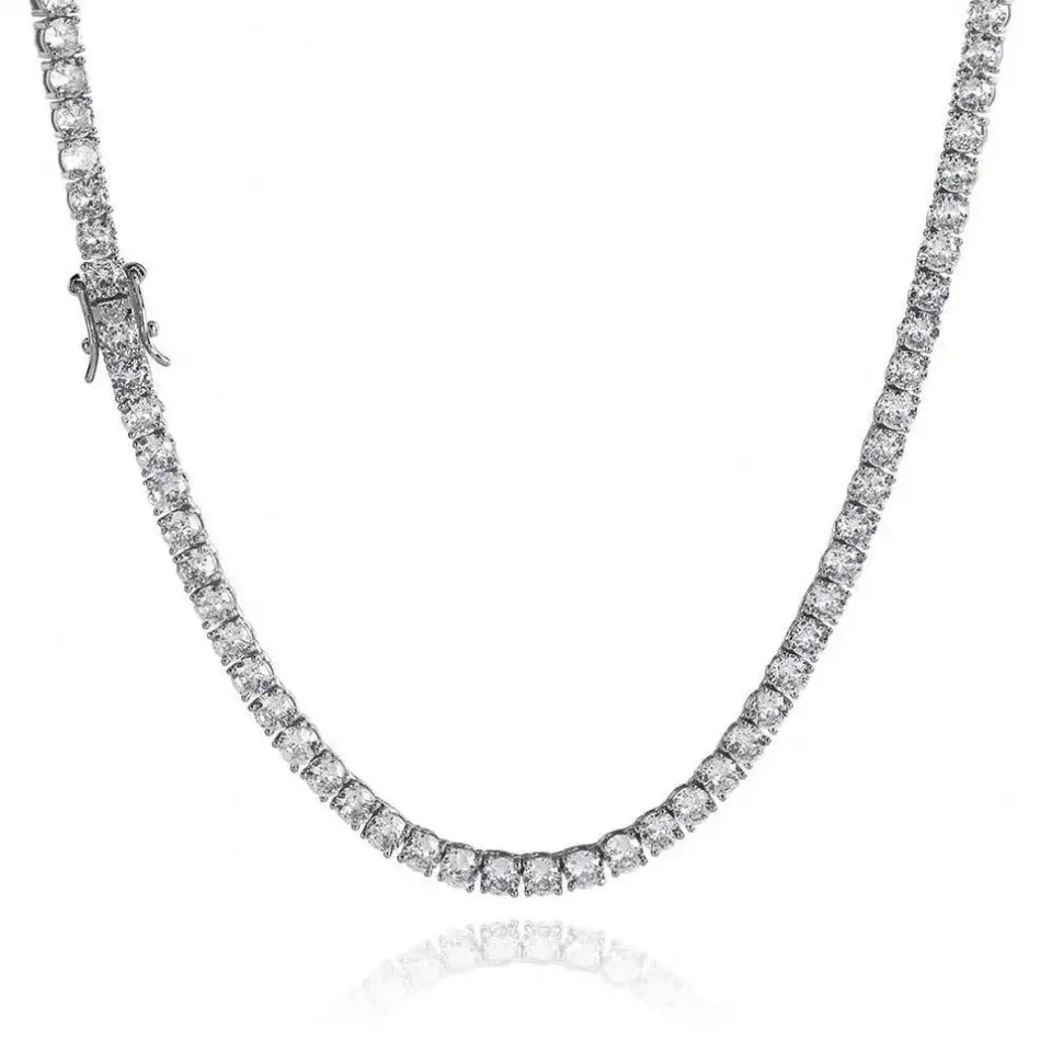 This product is a 3mm, 4mm, or 5mm wide Silver Moissanite Single Row Tennis Chain Bracelet, designed with a hip hop inspired style. The bracelet is made of sterling silver and features a row of sparkling moissanite stones, adding a touch of luxury and bling to the wearer's accessory collection. Perfect for men looking to make a statement with their jewelry, this bracelet is a stylish and bold choice for any outfit or occasion.