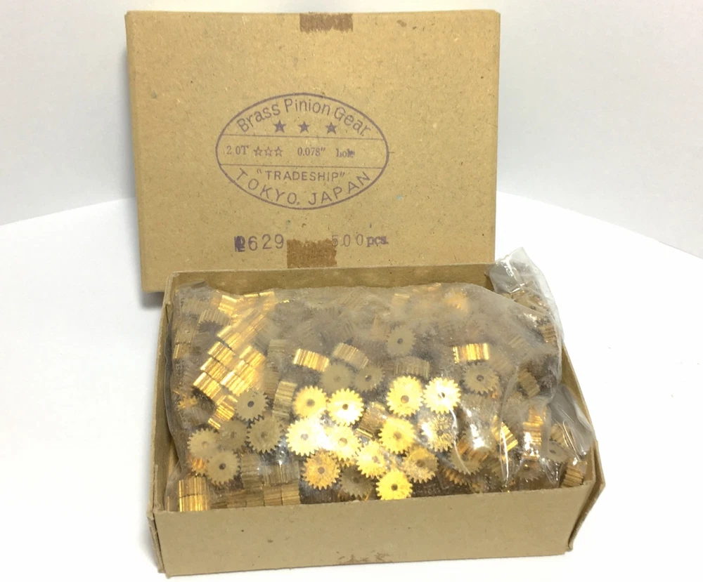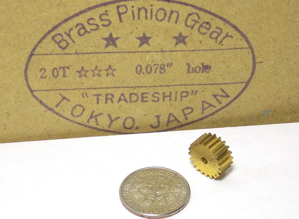 This listing is for THREE (3) pieces of, Vintage 1960's 1/24th 1/32nd Scale Slot Car AXLE SHAFT 20 TOOTH BRASS PINION GEAR made by TRADESHIP USA! Unused after 50 years! Sold by Tradeship Manufacturing, San Francisco, CA. Tradeship was a free trade zone company that came about as a result of the burgeoning Larger Scale slot car participation. Sold BULK, no packaging. BOX AND BAG PHOTO SHOWN FOR REFERENCE ONLY AND ARE NOT INCLUDED. Sold as is. Buy with confidence & please check out my other offbeat slot car related items. Descriptions are very accurate; No Returns. PLEASE ASK BEFORE YOU BUY IF YOU ARE UNSURE. We ship promptly & professionally. We happily combine orders & refund any excess s/h immediately upon shipping. We can always provide tracking. ************** From Ebay I Only ship U. S. Postal Service PRIORITY MAIL TO THE USA due to previous 'lost' packages. ******************* I charge $2 for expert handling/packaging, & actual shipping. I ship out of the country almost daily. Please refer to my feedback, rating or time selling HO slots for assurances of a good honest deal. happy motorin' & thanks S'lots from Bob. We Know H.O.