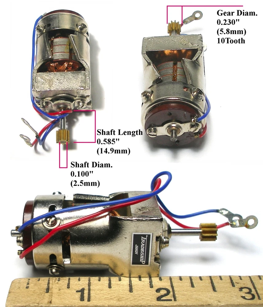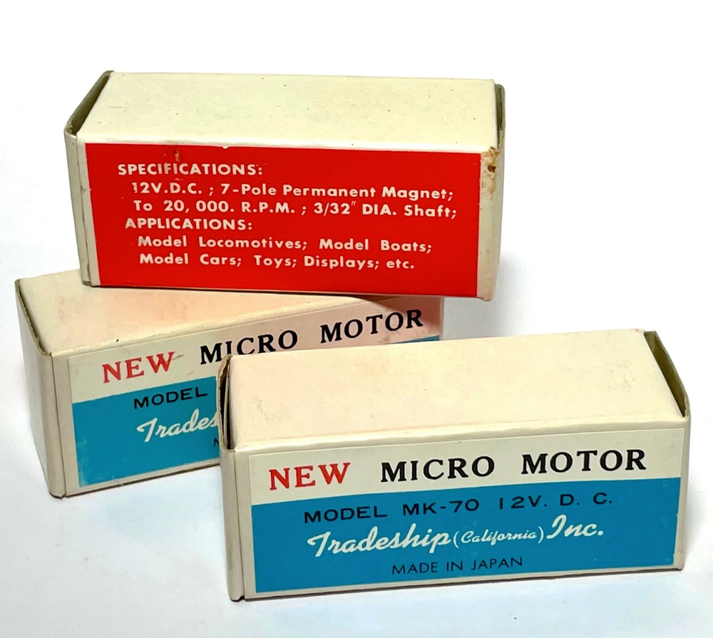 This listing is for THREE (3) Vintage 1960's 1/24th Scale Slot Car, Train, Boat or Toy, 3/32 inch Shaft, 20,000 RPM, 7 Pole, 12V DC MICRO MOTOR made by TRADESHIP USA! Unused BOXED after 50 years! Beautiful & Made In Japan. Originally sold by Tradeship Manufacturing, San Francisco, CA. A great addition to any large scale vintage slot car collections or displays. Tradeship was a free trade zone company that came about as a result of the burgeoning Larger Scale slot car participation. Revell, Riggen, Cox, Champion, Classic, K&B, Garvic, AMT, Russkit, BZ, MPC, Atlas. These motors can be used in a wide variety of toys including trains, boats and many other mechanical toys. Very versatile and absolutely Very High Quality! 'Model Locomotives, Model Boats, Model Cars, Remote Radio Control, Projectors, Toys, Cordless Electric Housewares and Tools, Displays, etc." Sold as is. Buy with confidence & please check out my other offbeat slot car related items. I will pack your item(s) well & try to ship promptly. Descriptions are very accurate; No Returns. PLEASE ASK BEFORE YOU BUY IF YOU ARE UNSURE. Glad to combine shipping when practical. We ship promptly & professionally. We happily combine orders & refund any excess s/h immediately upon shipping. We can always provide tracking. * ************** From Ebay I Only ship U. S. Postal Service PRIORITY MAIL TO THE USA due to previous 'lost' packages. ******************* * I apologize for any inconvenience, but; Due to previously lost packages: ALL INTERNATIONAL SHIPMENTS ONLY SHIP BY GLOBAL EXPRESS. NOT CHEAP, Very Fast Delivery & Absolutely, Positively Guaranteed to arrive. I charge $2 or less for expert handling/packaging, & actual shipping. I ship out of the country almost daily. Please refer to my feedback, rating or time selling HO slots for assurances of a good honest deal. happy motorin' & thanks S'lots from bob at SlotCarCentral. com 2201 Teall avenue Syracuse, NY 13206. Questions or issues gladly taken care of. phone 8 days a week, 25 hours a day. We Know H.O. WE HAPPILY COMBINE ORDERS FOR S/H. PLEASE ASK US TO COMBINE ITEMS WHEN YOU ARE THROUGH SHOPPING. We Refund Any Excess S/H. CALL OUR CUSTOMER SERVICE WITH ANY QUESTIONS OR ISSUES; 25 HOURS A DAY . SORRY, WE DO NOT ACCEPT RETURNS, so PLEASE ASK QUESTIONS NOW. Please wait for COMBINED SHIPPING INVOICE; PLEASE DO NOT OVER PAY SHIPPING & HANDLING