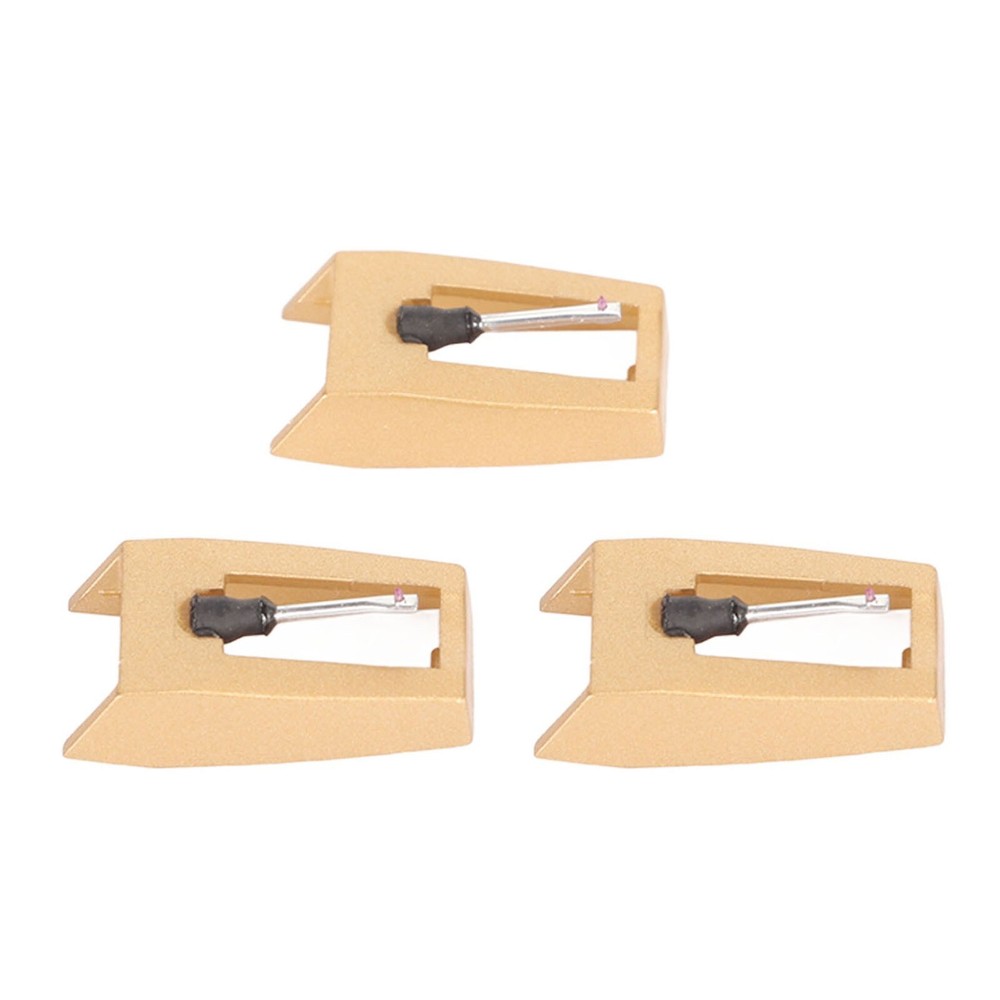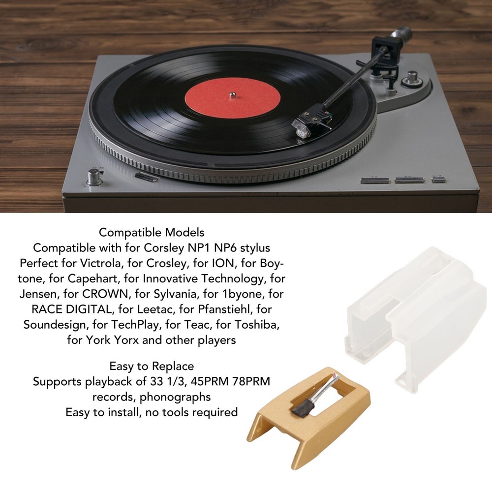 Feature: 1. WITH BRUSH: Record player needle and cleaning brush set, designed for music lovers, gold plated. The premium cleaning brush will help you care for your needles regularly and keep them working for a long time. 2. HIGH SOUND PERFORMANCE: With the tapered needle tip, premium ABS case and aluminum arm, this record stylus gives a cleaner, smoother sound when playing classical, rock, jazz or other music, enjoy more detailed music. 3. WIDE COMPATIBILITY: This record player stylus fits for Victrola, for , for ION, for Boytone, for Capehart, for Innovative Technology, for , for CROWN, for Sylvania, for , for GRACE DIGITAL, for Leetac, for Pfanstiehl, for Soundesign, for TechPlay, for , for , for York Yorx and more. 4. EASY TO REPLACE: Replacement turntable record stylus supports playback of 33 1/3, 45PRM records, easy to install. You can easily replace (remove and install) the record stylus at any time without any tools. 5. THOUGHTFUL PACKAGING: Each turntable needle comes with a sturdy plastic protective cover that guards it from any damage when not in use, and is packaged in a box for transportation. Specification: Item Type: Record Player Stylus Material: ABS, Aluminum Alloy Stylus Sizes: Length: Approx. 18mm / 0.71in Front Width: Approx. 9mm / 0.35in Rear Width: Approx. 10mm / 0.39in Front Height: Approx. 3mm / 0.12in Rear Height: Approx. 4mm / 0.16in Color: Gold Needle Pressure: 5.0g Output Voltage: 200mv-300mv (1K Hz = 3.54cm/sec) Channel Distortion: (1k Hz) ≤ 3dB Channel Separation: (1k Hz) ≥ 15 dB Frequency Response: 80-10000Hz (±7dB) Compatible: Over 90 percent of record players, turntables Package List: 3 x Record Player Stylus 1 x Brush Note: Manual measurement, please allow some errors.