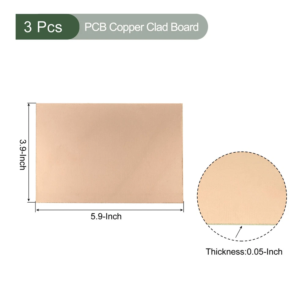 Document MULTIPURPOSE - Our blank circuit boards are great for your various electronic hobbies, such as etching, making models, testing, circuit projects, etc.WHAT YOU GET - The package comes with 3 Pcs copper clad board that measures 150mmx100mmx1.2mm(L*W*H).RELIABLE MATERIAL - The PCB board is made of FR4 glass fiber, copper-plated surface, durable and stable, with good adhesion of the copper to the fiberglass (no peeling or chipping).SPECIAL DESIGNED - The blank PCB is specially designed for making your own PCB circuit boards or making signs for your business.KINDLY NOTE - The boards may come with surface marks or scratches but don't affect performance. 3xPCB Copper Clad Board FR4 Single-Sided Blank Circuit Boards 150mmx100mmx1.2mm MULTIPURPOSE - Our blank circuit boards are great for your various electronic hobbies, such as etching, making models, testing, circuit projects, etc. WHAT YOU GET - The package comes with 3 Pcs copper clad board that measures 150mmx100mmx1.2mm(L*W*H). RELIABLE MATERIAL - The PCB board is made of FR4 glass fiber, copper-plated surface, durable and stable, with good adhesion of the copper to the fiberglass (no peeling or chipping). SPECIAL DESIGNED - The blank PCB is specially designed for making your own PCB circuit boards or making signs for your business. KINDLY NOTE - The boards may come with surface marks or scratches but don't affect performance. Hot Item Payment 1.We accept eBay payment . 2.Payment must be received within 7 business days of auction closing. Shipping 1.We ship to your eBay or Paypal address. Please make sure your eBay and Paypal address is correct before you pay. 2.Items will be shipped within 1-3 business day when we received payment. 3.Delivery time depends on destination and other factors. Description Policy 3xPCB Copper Clad Board FR4 Single-Sided Blank Circuit Boards 150mmx100mmx1.2mm MULTIPURPOSE - Our blank circuit boards are great for your various electronic hobbies, such as etching, making models, testing, circuit projects, etc. WHAT YOU GET - The package comes with 3 Pcs copper clad board that measures 150mmx100mmx1.2mm(L*W*H). RELIABLE MATERIAL - The PCB board is made of FR4 glass fiber, copper-plated surface, durable and stable, with good adhesion of the copper to the fiberglass (no peeling or chipping). SPECIAL DESIGNED - The blank PCB is specially designed for making your own PCB circuit boards or making signs for your business. KINDLY NOTE - The boards may come with surface marks or scratches but don't affect performance. Hot Item Payment 1.We accept eBay payment . 2.Payment must be received within 7 business days of auction closing. Shipping 1.We ship to your eBay or Paypal address. Please make sure your eBay and Paypal address is correct before you pay. 2.Items will be shipped within 1-3 business day when we received payment. 3.Delivery time depends on destination and other factors.
