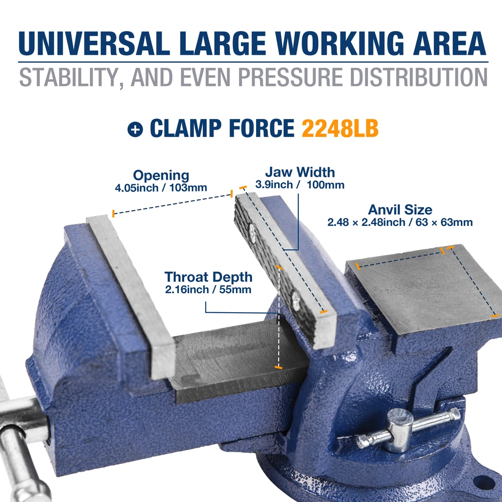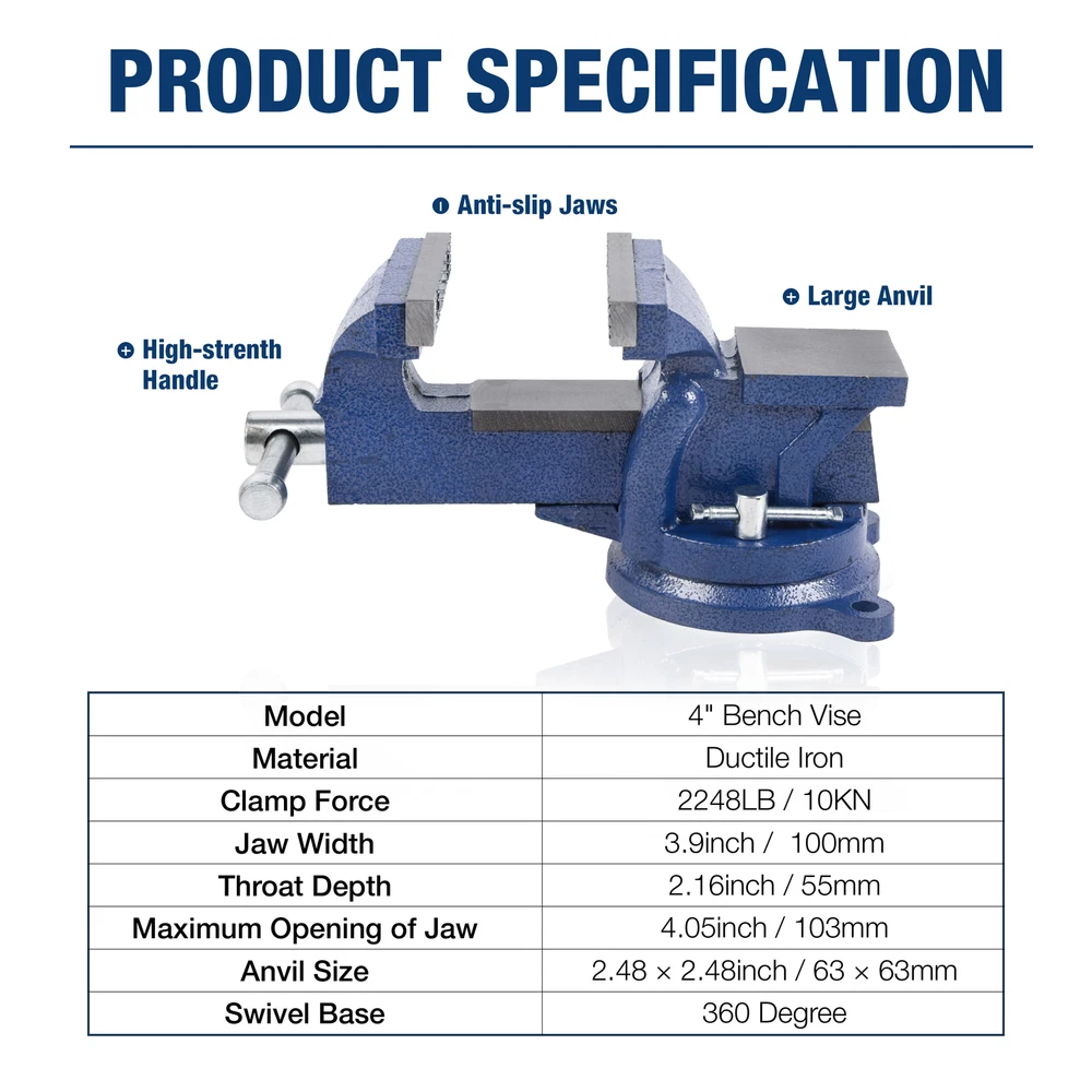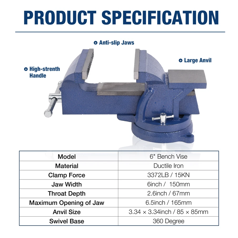 4" / 6“ Multipurpose Vise Bench Vise Heavy Duty Multi-Jaw Vise 360-Degree NEW Details: 【Durable and Sturdy】 : our bench vise is made from high-strength Ductile iron 60,000 PSI. 【Technical Specs】 : Jaw Width: 6" x Jaw Opening: 6.5" x Throat Depth: 2.6",Clamp force: 3372lbs, Equipped with a large 1.7" x 1.9" anvil work surface. 【Swivel Base】: With a 360-degree swivel design and swivel base, our bench vise allows for greater accuracy and ease of use. 【Multifunctional】: This bench vise that can securely hold both flat materials,great for woodworkers, fitters, etc., and this bench vise can hold wood, aluminum alloy, steel, plastic and other materials. 【Stable and Easy to Install】: Whether you're a beginner or a seasoned pro, our bench vise is incredibly easy to install and provides a stable base for all your projects. Perfect for home use or small workshops. Whether you are working with wood or metal at home or in the shop, the 6" heavy duty workshop bench vise provides the maximum clamping and holding power needed to get the job done with confidence. Specifications: Model: 6" Bench Vise Material: Ductile Iron Clamp Force: 3372LB Jaw Width: 6" Throat Depth: 2.6" Maximum Opening of Jaw: 6.5" Anvil Size: 1.7" x 1.9" Swivel Base: 360 Degree Item Size: 13.6 × 6.1 × 6.8" Weight: 25.57 lbs Package Size: 13.7 × 6.7 × 7" Weight: 26.5 lb Sturdy and Durable Constructed with high-strength forged steel(60,000PSI), this bench vice can withstand high clamping pressure without breaking. Large jaw working surface The anvil working surface is solid and wide, which is convenient for machining various parts. Swivel Base With a 360-degree swivel locking base design, our swivel vise allows for greater accuracy and ease of use. No need to constantly insert and remove your workpiece. Stable and Easy to Install Whether you're a beginner or a seasoned pro, our bench vice is incredibly easy to install. Non-slip jaws The jaws are forged with 45# steel and then heat-treated, with a fish scale jaw surface and a high hardness pressure plate for anti-slip treatment. Use in multiple scenarios The smooth and dependable action bench vise is ideal for professional use, home, workshop, educational institution use, providing clamping for light applications, such as cutting conduit, drilling, gluing, woodworking, metalworking, sanding or planing, sawing and so on. FAST SHIPPING WARRANTY EASY RETURNS CONTACT US FAST SHIPPING We only ship to US mainland 48 states and worldwide via ebay international shipping program. We don't offer direct international shipping. Consult us if you live in Hawaii, Alaska or Virgin Islands. Also we don't ship to any APO/FPO/PO BOX address. We offer FedEx Ground or Home delivery in optional which can make it faster, charge additional shipping fee. Delivery is any day from 1-5 business days (Monday through Friday, excluding weekends and holidays) WARRANTY This item is covered by our 12 months unlimited mileage warranty. Any customer may use the same outlets to facilitate a return or warranty claim. Any item must be returned within 30 days of the original purchase for refund; item(s) retaining a warranty may be returned beyond 30 days but within the remaining warranty period. Returns that are not subject to warranty may accrue a restocking fee and should be returned at the customers cost. We reserves the right to request proof of purchase and mechanical failure in the event of any warranty claim; any returns or claims that violate Ebay's Online Return policies will be reported. We holds no responsibility or liability for additional repairs, damages (punitive or non-punitive), loss of time, or any other extraneous circumstances created by a purchase made from said party. EASY RETURNS We understand that sometimes you need to make a return or an exchange. All we ask is you send it back in the same condition it was received - new and un-used. If the product you receive is not the one you ordered, please take photos of any visible of visual reference and contact us directly; photos must be CLEAR and VISIBLE. Logistical claims must be filed within 30 days of received the product; exchanges in these cases will be handled promptly and at?no cost to the customer. In order to process a return or exchange, please call us or send us a message through eBay and we will be happy to assist you immediately. However,any return that is NOT defective or NOT received in error, is the responsibility of the customer. We DO NOT cover any shipping costs and/or additional fees associated with the transaction. CONTACT US We are open Monday to Friday 8am to 5pm Mountain Standard Time, and Saturday 9am to 1pm MST. Our friendly staff are available during these hours. Please feel free to call us, or send us a message via eBay. We aim for complete customer satisfaction and repeat business; we will be more than happy to help you feel 100% comfortable with your purchase.