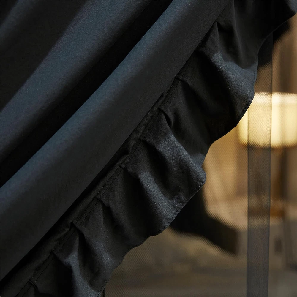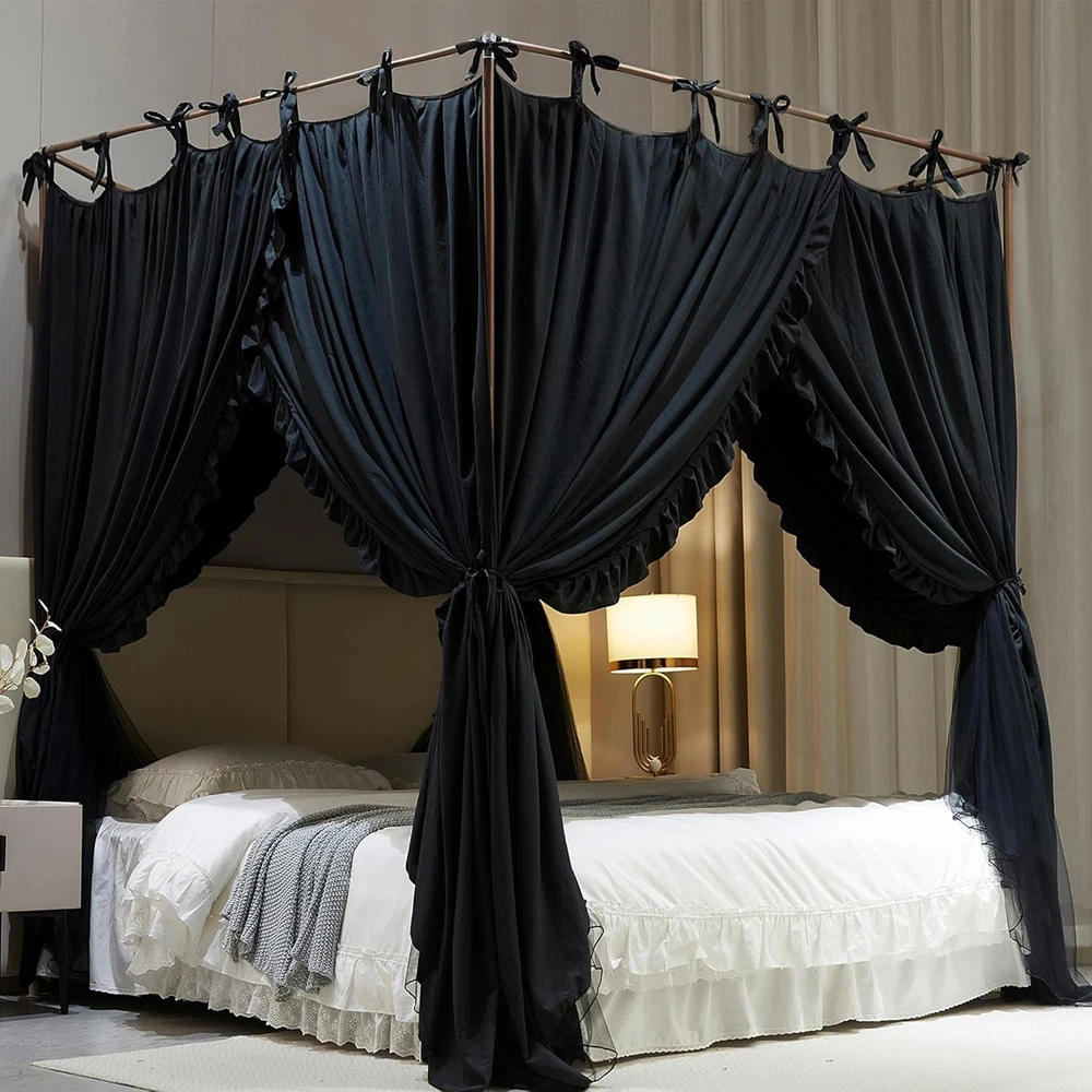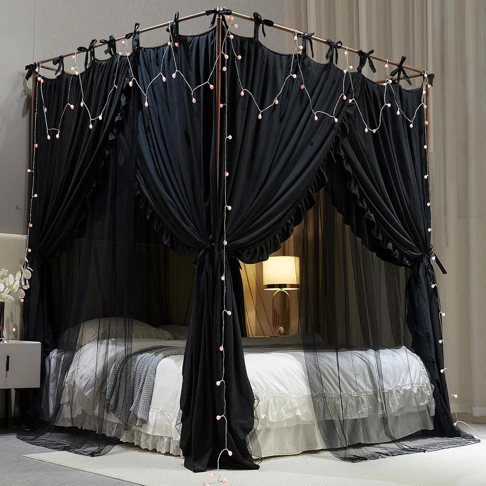 1❤️:Canopy Package Includes--Double Layer Bed canopy*1+ Ribbons*4 (LIGHTS And POLES IN THE PICTURE ARE NOT INCLUDED) 2❤️:Material and Size--It contains Multiple sizes. Please choose what you need. (LIGHTS And POLES IN THE PICTURE ARE NOT INCLUDED). The double-layer mosquito net can not only effectively prevent mosquitoes, but also block the light and naturally protect your deep sleep.It is made of high-quality polyester fiber and feels soft and cozy . 3❤️:Fashionable Design--The top is designed with straps, suitable for various bed awning brackets,Clever 4 openings double bed curtain design makes your bed full of romantic atmosphere. Realize every lady's fantasy of the princess.Practical and beautiful,making your bed canopy full of Princess flavor. Please note (The lights and poles in the picture are not included). 4❤️:Perfect Gift--Every girl has a princess dream. This Ruffle double bed curtain makes the girl's room full of romance and fulfilled all your fantasies about the princess.It is a perfect gift for family and female friends. It is suitable for birthdays, anniversaries, Christmas, mother's day, etc. 5❤️:100% Satisfied Service--If there is any questions please feel free to contact with us, our customer service team will response in 24 hours. If there is any part missing or damaged during shipping, please contact us first, we will solve the problem as the way you want. Product Description AIOOO 4 Corners Post Princess Curtain Bed Canopy Black AIOOO 4 Corners Post Princess Curtain Bed Canopy Black Unique lacing design,suitable for all kinds of beds,make your room full of romantic atmosphere. Double bed net design can not only effectively prevent mosquitoes,but also block the light, to provide you with a comfortable sleeping environment. Available in a variety of sizes,suitable for all types of beds. Available in a variety of sizes,suitable for all types of beds. Our products come in a variety of sizes. The Full size are 53inch wide and 78inch length and 82inch high. The Queen size are 59inch wide and 82inch length and 82inch high. The Queen size are 64inch wide and 82inch length and 82inch high. The King size are 78inch wide and 86inch length and 82inch high. Suitable for all types of beds. The double-layer design creates a romantic atmosphere. Fine detail is a sign of quality. Our bed canopy workmanship is meticulous and very durable,the selection of high quality polyester fiber,feel soft and comfortable,pretty details are symbols of high quality. The double-layer design creates a romantic atmosphere. The unique lace-up design is the best choice for your decoration. Clever 4 openings double bed curtain design makes your bed full of romantic atmosphere. Realize every lady's fantasy of the princess.Double bed canopy can be very good shade,give you a comfortable sleeping environment,let your room full of dream color.
