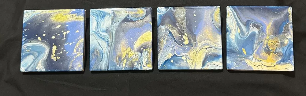 4 Cosmic Swirls Coasters 4” Blue Golden Hand Crafter Resin By Linda Burcel Water Good used condition. Minimal signs of wear and tear. Please study pictures carefully before purchasing Feel free to ask any questions. Thank you for visiting our store! 10