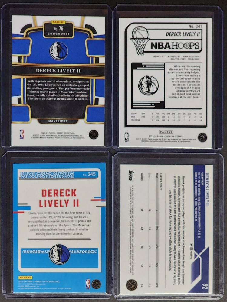 Elevate your basketball card collection with this exclusive $4 Derreck Lively II Lot, featuring four stunning cards that capture the essence of the rising Dallas Mavericks star. Each card is meticulously crafted by Panini, ensuring high-quality imagery and long-lasting durability. The set includes cards from the 2023-24 Panini Donruss Optic, Select, Topps Chrome, and NBA HOOPS collections, providing a diverse range of designs to celebrate Lively's impactful season. With an array of features such as the base set, rookie identification, and short print parallels, these cards are a must-have for enthusiasts and fans alike. The cards are printed in the United States on standard-sized card stock and come in English. Celebrate the 2022-24 NBA season and add a touch of Mavericks' magic to your collection with this exquisite Derreck Lively II card lot.