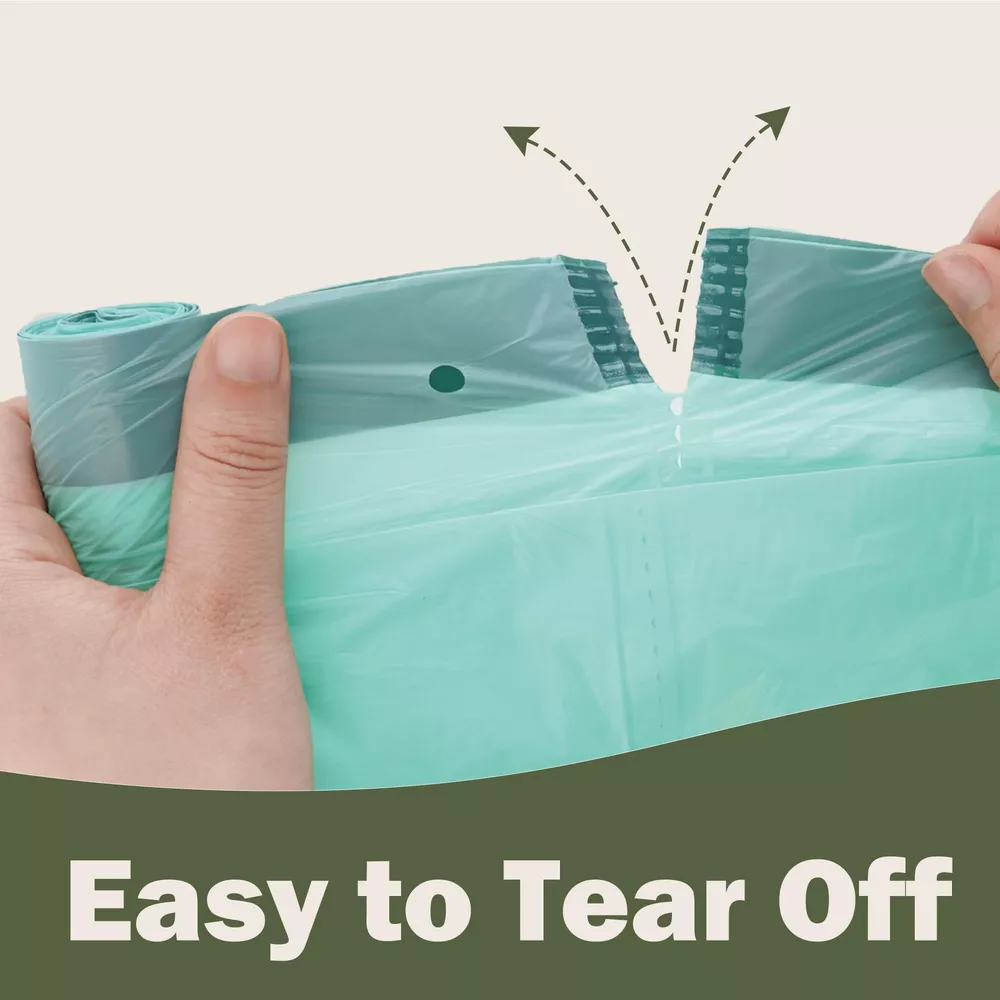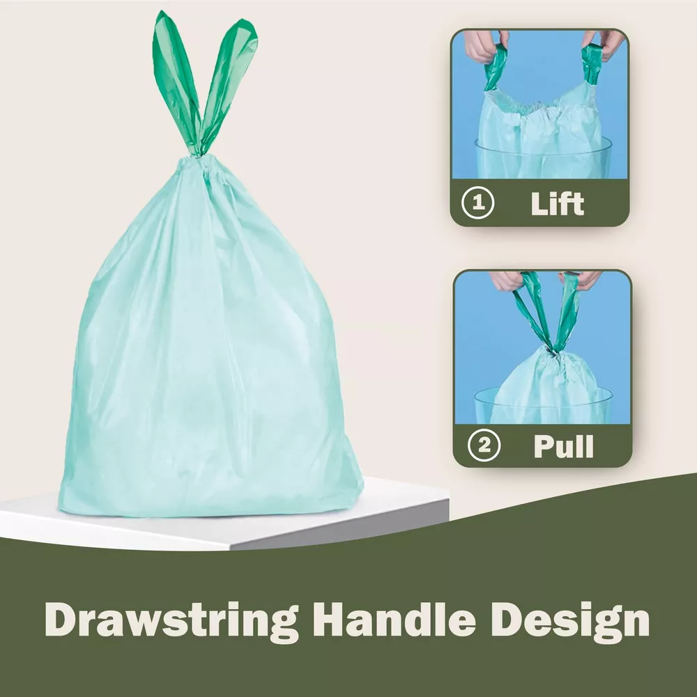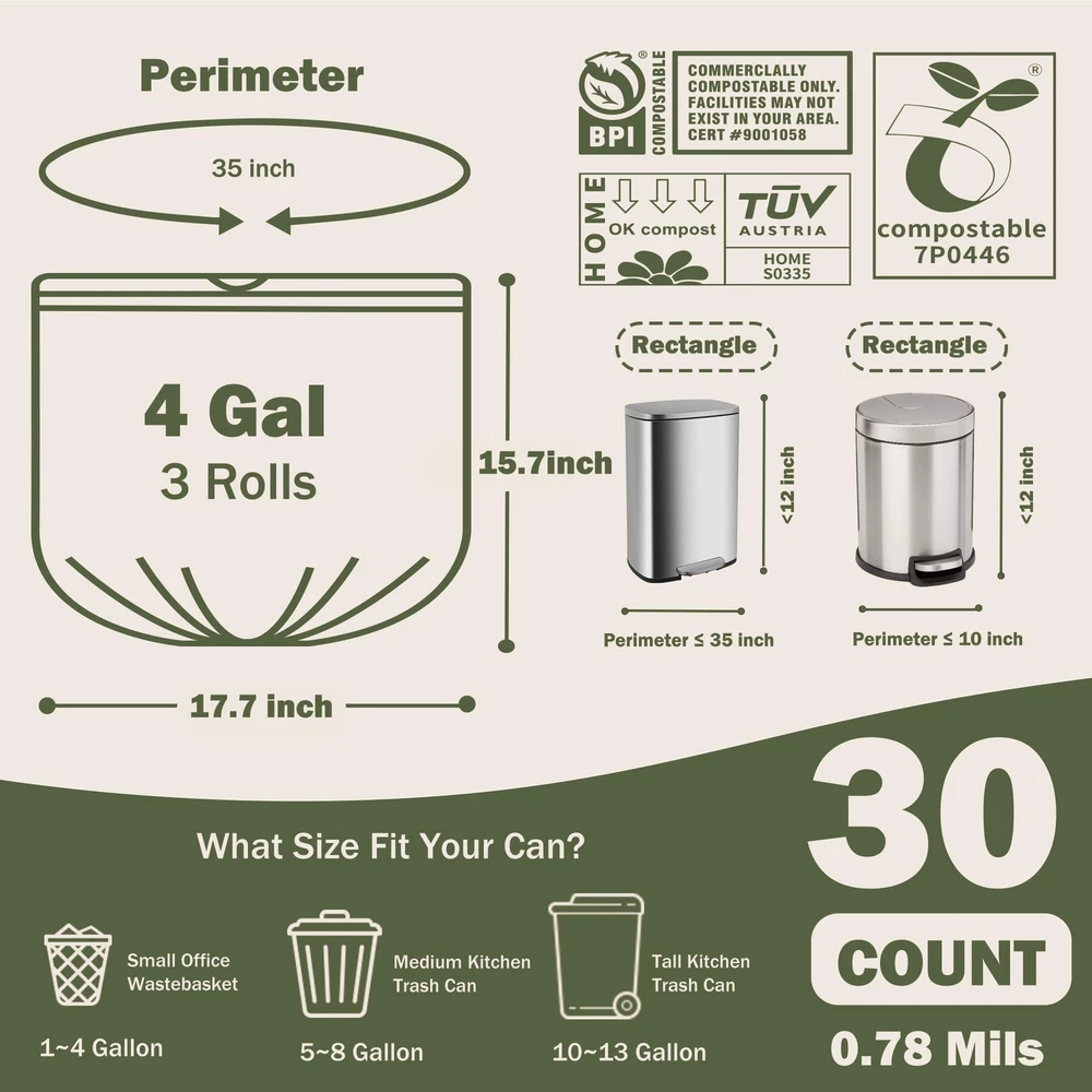 THE SIZE OF THE 100% COMPOSTABLE TRASF BAGS: 4-5 gallon/15-20 liter: 17.7'' * 15.7 inch '' (45*40cm), 0.78 Mils; 10 counts per roll x 3 rolls = 30 counts (Green). Fit most of small trash cans CERTIFIED COMPOSTABLE IN U.S. & EUROPE: Our compost garbage bags are certified to american standard ASTM D6400 (BPI) and european standard EN 13432 (ok compost home), guaranteed to be 100% compostable in home composting facilities Multipurpose: Our compostable waste bags unscented leak-proof, drawstring, strong.They provide the perfect fit for kitchen food waste, office trash, bathroom, bedroom, use for cat litter bags, baby poop bags INSTRUCTIONS FOR USE: Our organic garbage bag are made of starch-based materials. Avoid overheating, place the compost bag in a cool and dry place and use it up within one year after purchase. Let's work together to make our home better and better and give our next generation a more comfortable environment. Replacing plastic with our sustainably manufactured, compostable bags. Let's make Earth a better place.