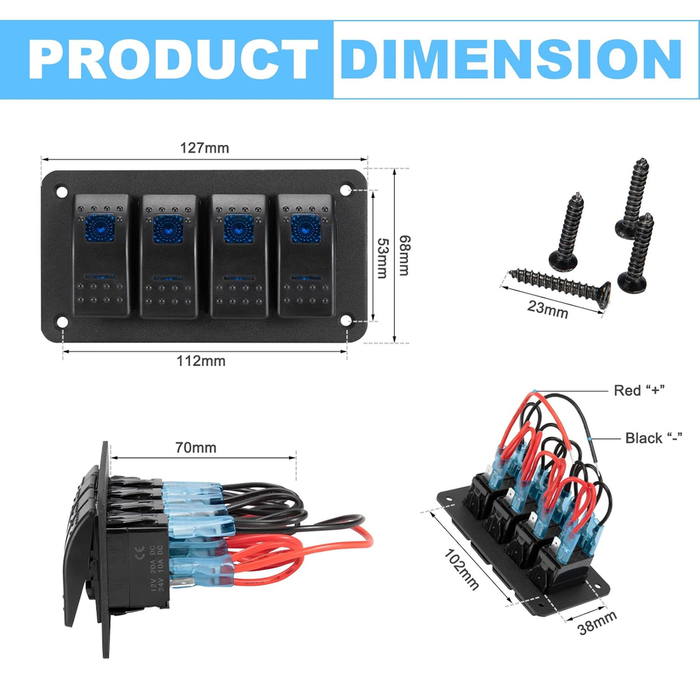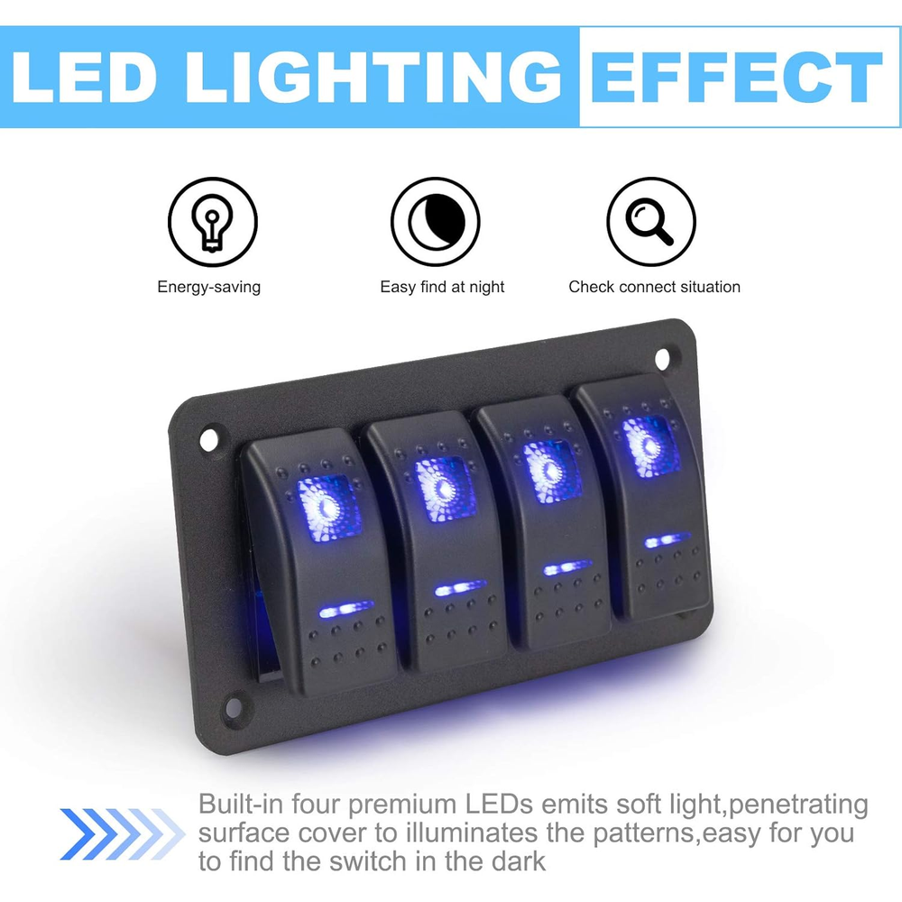 BETTER CONTROL DIFFERENT ACCESSORIES: 4 gang switch panels are perfect for controlling LED light pods,fog lights,headlights,taillights and auxiliary lamps,etc.Come with DIY sticker, you can define the name and assign switches according to your needs BLUE LED LIGHT DESIGN: Built-in four premium LEDs emits soft light,penetrating surface cover to illuminates the patterns,easy for you to find the switch in the dark SUPERIOR DESIGN: Durable aluminum panel and well-conductive 5 pins,effective waterproof and dustproof,ensure long lasting durability WIDE APPLICATION: With pre-wired wiring harness for you to easily install in both 12V and 24V vehicles, SUV,UTV, ship, caravan, caravan, etc PACKAGE INCLUDES: 1x 4 gang switch panel, 1x screw sets, 1 set of DIY stickers Product Description