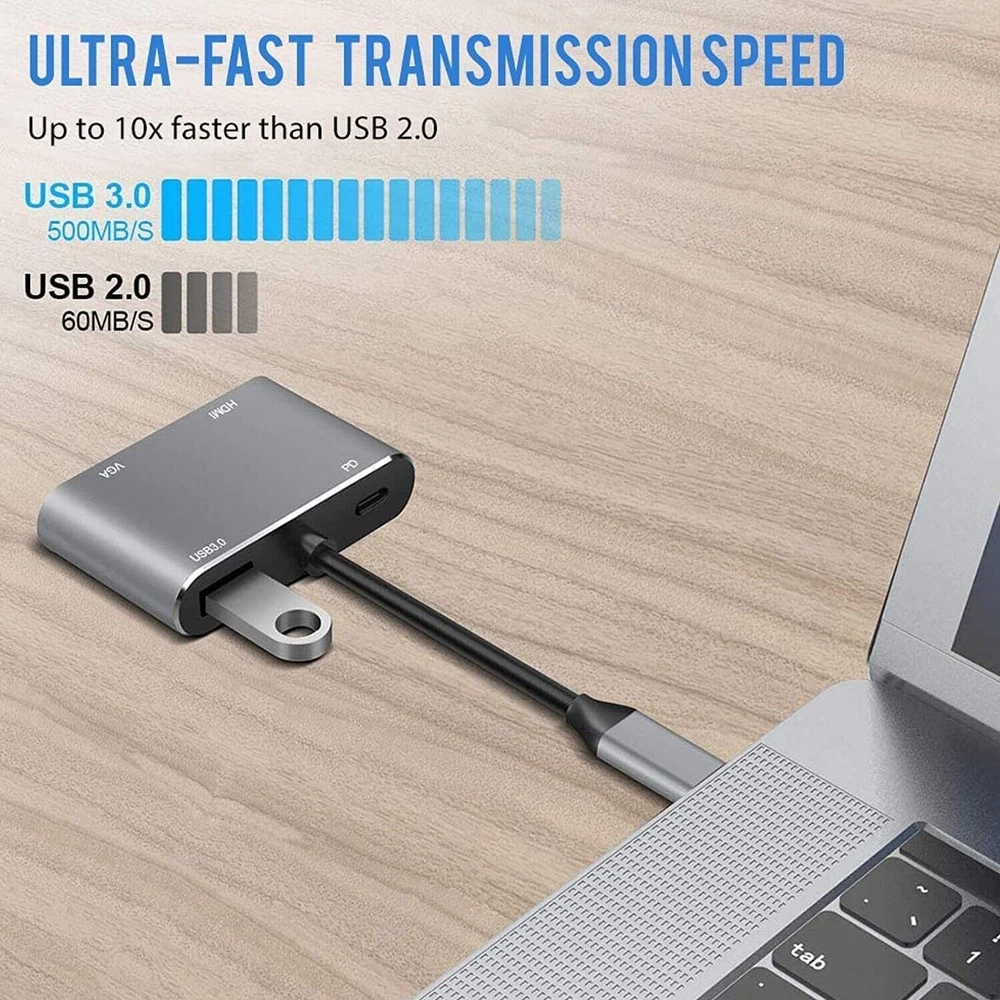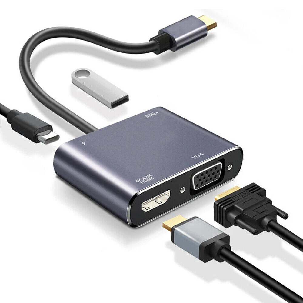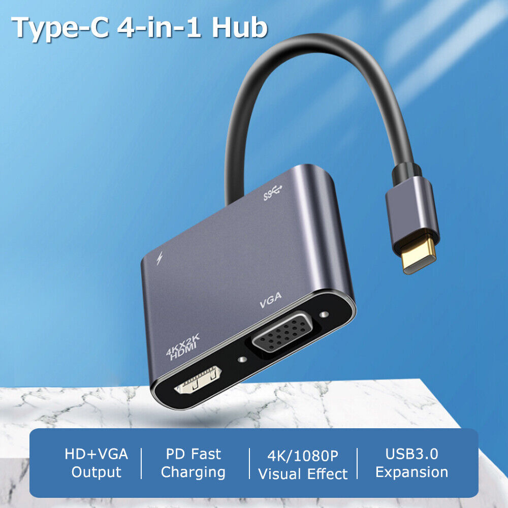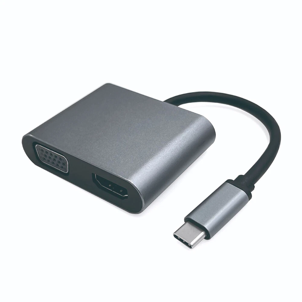 About this item: 【Plug and Play】Right out of the box this USB C to HDMI VGA adapter has no external software drivers required or power adapter needed 【Dual Monitors Setup simultaneously】HDMI and VGA ports can work simultaneously, and you can use USB C to HDMI and VGA at the same time. ⚠️ Note: Under extend mode, you can only get two screen images, not three 【Vivid 4K Resolution】this VGA to USB C HDMI port supports resolutions up to 4k*2k@30HZ, 4 times clearer than 1080P, HD and VGA signals output simultaneously, the resolution is 1080P. 【Port Compatible】This Type C to VGA can be connected a device equipped with a USB-C or Thunderbolt 3 port to the monitor or display. ⚠️Before purchasing, please make sure your USB C host device must support video output or DP Alt Mode. Not all USB C device is compatible. USB C to VGA Adapter doesn't compatible with iPad Pro 2021 11" and iPad Pro 2021 12.9" Support 100W PD fast charging, to meet your daily office needs. Support replication mode and expansion mode to meet your different needs. Aluminum alloy shell, shockproof, wear-resistant and scratch-proof, efficient heat dissipation, stable and durable. Specification: Type: 4-in-1 Type-C hub Material: ABS+Aluminum alloy Expansion port: 1*USB3.0, 1*USB-C PD, 1*HD, 1*VGA USB3.0 theoretical transmission rate(max): 5Gbps PD power: Up to 100W HD resolution: Up to 4K VGA resolution: 1080P Packing list: 1 * Hub Support Mirror & Extend Dual Mode: -- Mirror and Extend Mode Settings: For MacOS, Top left corner Apple icon-->System Preferences-->Displays-->Mirror or Extend Displays; For Windows 10, press Windows key + P combination command-->choose Duplicate or Extend. For Windows system laptop, if the external monitor could not work, please update the BIOS and graphic card driver from laptop official website. -- Stereo Settings: For MacOS, Please go to Apple icon-->System Preferences-->Sound-->Output, choose your TV as the sound output. For Windows 10, please click right bottom of your sound icon-->choose your TV as the sound output. For Sony TV, if you are running MacOS, you probably need to go to Launchpad-->Other-->Audio MIDI Setup-->DisplayPort-->Output-->Please choose 2 ch 16-bit integer. If the resolution of your laptop is higher than the external monitor. For windows: Windows Menu--> Setting--> Display--> Advanced Display Settings, set your laptop's resolution same as or lower the resolution of external monitor. For MacOS: Left-upper Apple icon-->System Preferences-->Displays-->Mirror displays. Then your HDMI & VGA monitor would mirror your Mac. However here you have two choices. One is "Optimize For" your built-in Retina Display, the other is "Optimize For" your HDMI monitor. You can choose which one you like. Compatible Devices(not a full list): * MacBook Pro 2020 / 2019 / 2018 / 2017 / 2016 / Mac Pro / iPad Pro 2018 2020, NOT compatible with iPad Pro 2021 11" and iPad Pro 2021 12.9" * iMac (Mid 2017) and newer / iMac Pro * Mac Mini (Late 2018) and newer * MacBook (Early 2015) and newer / MacBook Air (Late 2018) and newer * New Chromebook Pixel / Pixelbook 2-in-1 / Pixel Slate 2-in-1 / Chromebook Pixel (2015) * XPS 15 / 13 / 12 * EliteBook Folio G1 / HP Spectre 13 laptop / Spectre x360 2-in-1 * Thinkpad E580 / T470 / T480 / X1 Carbon (2017) / A485 / A285 / E485 / E585 / Yoga 900 / 910 / 920 * Asus Zen AIO All in One PC * Surface Book 2 / surface go * Galaxy S20 / S20+ / S20 Ultra / S8 / S8+ / Note8 / S9 / S9+ / Note9 / S10 /S10e / S10+ / Note 10 and Tab S4. * LG G5 / G7 / G7+ / Q8 / V20 / V30 /V30+ / V35 / V35+ / V40 / Exodus 1 * HTC 10 / HTC U Ultra / U11+ / HTC U12+ * Mate 10 / Mate 10 Pro / Mate 20 / Mate 20 Pro / Mate X / P20 / P20 Pro / P30 / P30 Pro / Honor Note 10 / Honor View 20 If your laptop not included in the list, please feel free to let us know ,we are very gladly to help you to check if your device can work with the adapter.