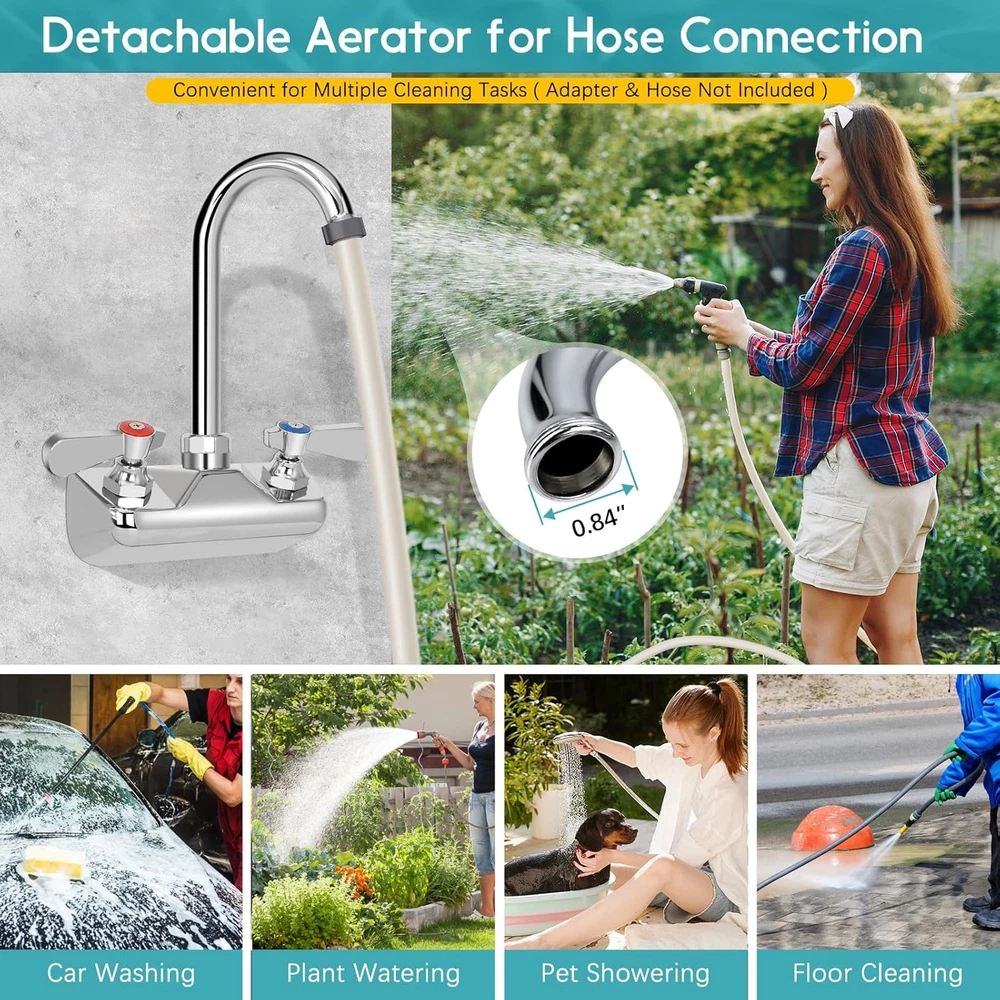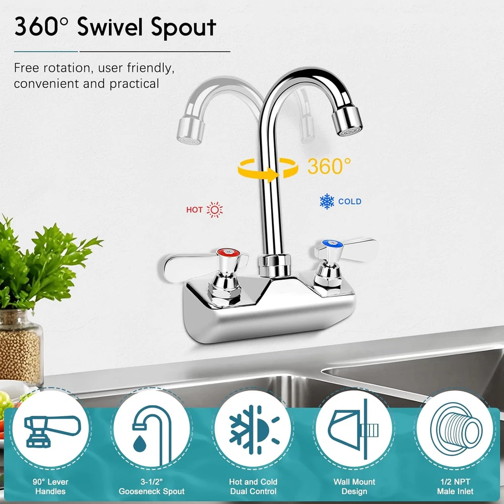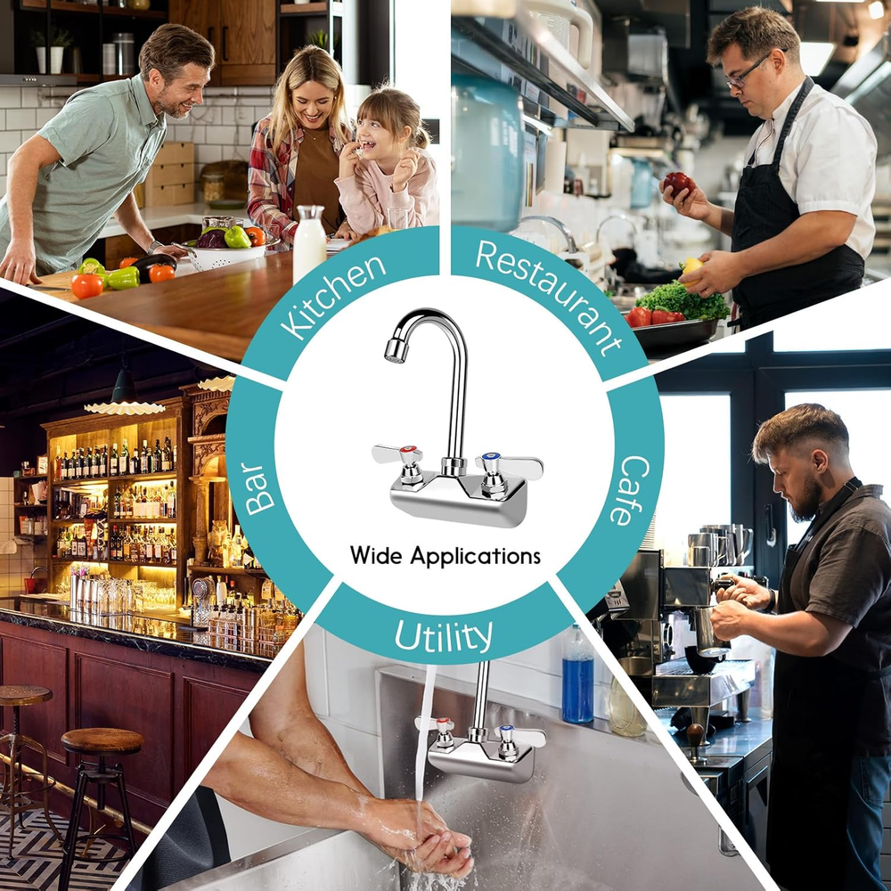Store New Arrivals Add to Favorite View Feedback 4 Inch Center Commercial Sink Faucet Wall Mount Kitchen Hand Sink Faucet, 1/2" NPT Male Inlet, Brass Constructed & Chrome Polished, with 3-1/2" Gooseneck Spout & Dual Lever Handles Description Item model number ZKD-WKG35L Spout Height 6 Inches Hole Count 2 Spout Reach 3.5 Inches Country of Origin China Is Electric No Maximum Flow Rate 2 Gallons Per Minute Batteries Included? No Handle Location Center Batteries Required? No Finish Chrome Material Brass Installation Type Wall Mount Model Name ZKD-WKG35L Finish Type Chrome Package Dimensions 8.54 x 4.72 x 2.83 inches Item Package Quantity 1 Spout Design Gooseneck Number of Handles 2 Item Weight 2.23 pounds Special Features 360 Swivel Special Feature 360 Swivel Mounting Type Wall Mount Color Chrome Handle Material Brass Recommended Uses For Product Sink, Kitchen Included Components 2 lock nuts,2 ribbed washers,seal tape Handle Type Lever Size 4" center 3.5" gooseneck 4 Inch Center Faucet - Our Wall Mount kitchen faucet with 4" spread center wall mounts are perfect for most commercial kitchen or bar, 3-1/2" Gooseneck Spout and 1/2" NPT male inlet make it ideal to use (If you need luxury style with the Ceramic Cartridge, please search "B0CN38NKTR" in our store to meet your requirement) Commercial High Quality - Sturdy brass construction and polished chrome body for extra durability and longevity. This item also includes reinforced double O-ring valves and ceramic cartridges that ensure that leaks are prevented. Super good choice for commercial duty. Convenient & User-Friendly Design - This faucet features dual temperature lever handles and a double O-ring 3-1/2 inch gooseneck spout which swivels 360 degrees. The dual handles can direct hot or cold water to anywhere you desire. High-Pressure Faucet - Max flow rate is 2 GPM. The faucet comes with an aerator which produces a larger and whiter stream that is SOFT TO TOUCH and NON-SPLASHING. Easy & Hustle Free Installation - We have included the mounting kit of 2 lock nuts and 2 ribbed washers so that you can easily install your faucet. Simply apply seal tape (included) to the inlet of the faucet, and attach supply lines to the inlet. Why Choose Us: ZKDAUSDO specializes in one-stop commercial sink faucets for bar, RV, restaurant, kitchen, laundry, outdoor, and more. We offer luxury models with ceramic valves for a smoother experience and economic options without ceramic valves for everyday use. Visit our ZKDausdo storefront to find the optimal faucet to meet your needs and enjoy quality and affordability Product Description Premium Commercial Sink Faucet for Your Bar Sinks (Click it for deck mount style) Premium Commercial Sink Faucet for Your Cafe Sinks (Click It for 10" Swivel Spout Style) A polished chrome faucet will add a sleek, professional touch to any juice or coffee bar. It creates a clean and inviting space that leaves a memorable impression on customers. In the bustling back kitchen of a restaurant, ZKDAUSDO brass-mounted wall faucet becomes an essential—built to withstand daily use and keep operations running smoothly with reliability and style. ZKDAUSDO specializes in one-stop commercial sink faucets for bars, restaurants, RVs, kitchens, laundry, and outdoor spaces. We offer luxury models with ceramic valves for smoother operation and economical options without ceramic valves for cost-effective and easy maintenance solutions. Learn more↓ One-Stop Shop for ZKDAUSDO Commercial Grade Hand Sink Faucets Add to Cart Add to Cart Add to Cart Add to Cart Add to Cart Add to Cart Add to Cart Customer Reviews 4.4 out of 5 stars 62 4.4 out of 5 stars 190 4.4 out of 5 stars 102 4.5 out of 5 stars 146 4.5 out of 5 stars 130 4.5 out of 5 stars 130 4.4 out of 5 stars 102 Price $54.99 $ 54 . 99 $56.99 $ 56 . 99 $59.99 $ 59 . 99 $56.99 $ 56 . 99 $59.99 $ 59 . 99 $59.99 $ 59 . 99 $59.99 $ 59 . 99 With Ceramic Cartridge? ✔ ✘ ✔ ✘ ✔ ✔ ✔ Installation Type wall mounted wall mounted wall mounted deck mounted deck mounted deck mounted wall mounted Installation Center Distance 4 inches 4 inches 4 inches 4 inches 4 inches 4 inches 4 inches Handle Type 90° quick-turn 90° quick-turn 90° quick-turn 90° quick-turn 90° quick-turn 90° quick-turn 90° quick-turn Spout Reach? 3.5" Reach 3.5" Reach 3.5" Reach 3.5" Reach 3.5" Reach 6" Reach 10" Reach 360° Swivel ✔ ✔ ✔ ✔ ✔ ✔ ✔ Water Flow 1.8 GPM 1.8 GPM 1.8 GPM 1.8 GPM 1.8 GPM 1.8 GPM 1.8 GPM ABOUT US We offer the best prices around on high quality products. Our E-store includes media such as books, movies, music and games while offering electronics, toys, sporting apparel, clothing, tools, general home, garden items and more. SHIPPING We are always working hard to ensure your package arrives as soon as possible. Please understand that some factors like weather, high postal traffic, and the performance of shipping companies are outside of our control. We offer free shipping to the lower 48 states and ship within 2 business days of payment, usually sooner. We do not accept P.O. Boxes. Please provide a physical address. RETURNS We offer a 30-Day Return Policy on items which you are not completely satisfied with. You have the option for a full-refund or an exchange of the item. No returns are available on items shipped outside of the USA. PAYMENT We accept PayPal. CONTACT US This page content is yet to come Please ad us to your favorite seller and visit again later Thank You