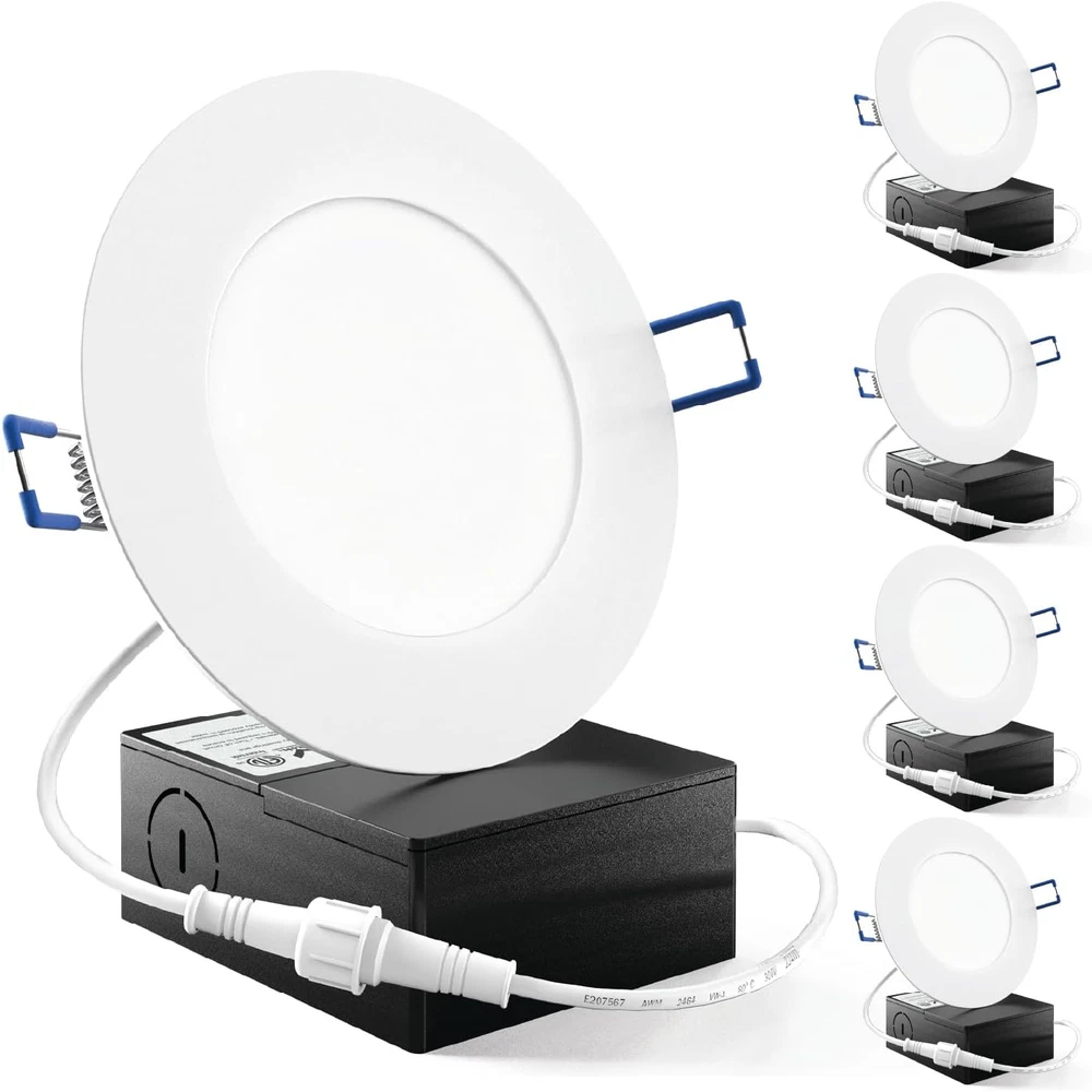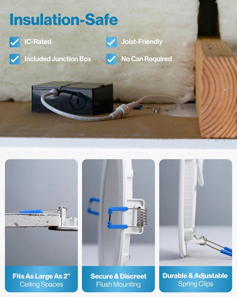 4 Inch Slim LED Downlight with Junction Box and Smooth Trim IC RATED - Sunco's slim downlights are IC rated, meaning they are thermally protected and won’t overheat or ignite surrounding insulation in the roof or overhead joist space. Both the light and its junction box are safe for direct contact with ceiling insulation. SIMPLE INSTALL - Our LED slim downlights come equipped with a junction box which means they do not need a can. Spring-loaded brackets fit any ceiling type: double drywall, single drywall, and soffit. DIMMABLE - Seamless dimming capabilities (10%-100%) to fit any mood or décor. Our slim downlights give off sunlight-like quality for true color rendering. SUNCO BENEFITS - 7 Year Protection! Sunco is proudly based in the USA, offering quality products at affordable prices backed by industry-leading warranties and knowledgeable support specialists. Product Description Similar Products Add to Cart Customer Reviews 4.3 out of 5 stars 2,152 4.4 out of 5 stars 1,535 4.6 out of 5 stars 1,571 4.4 out of 5 stars 123 4.7 out of 5 stars 1,144 Price — $99.99 $ 99 . 99 — $54.99 $ 54 . 99 $24.99 $ 24 . 99 Lumen Count 650 Lumens 650 Lumens 650 Lumens 750 Lumens - Wattage 11W 10W 10W 12W - Equivalency 60W 60W 60W 75W - Dimmable ✓ ✓ ✓ ✓ - Junction Box Included ✓ ✓ Integrated ✓ - Color Rendering - - - CRI 90+ - Voltage 120V 120V 120V 120V - Moisture Rating Damp Rated Damp Rated Damp Rated Damp Rated - IC Rated ✓ ✓ ✓ ✓ - Can Required No No No No -