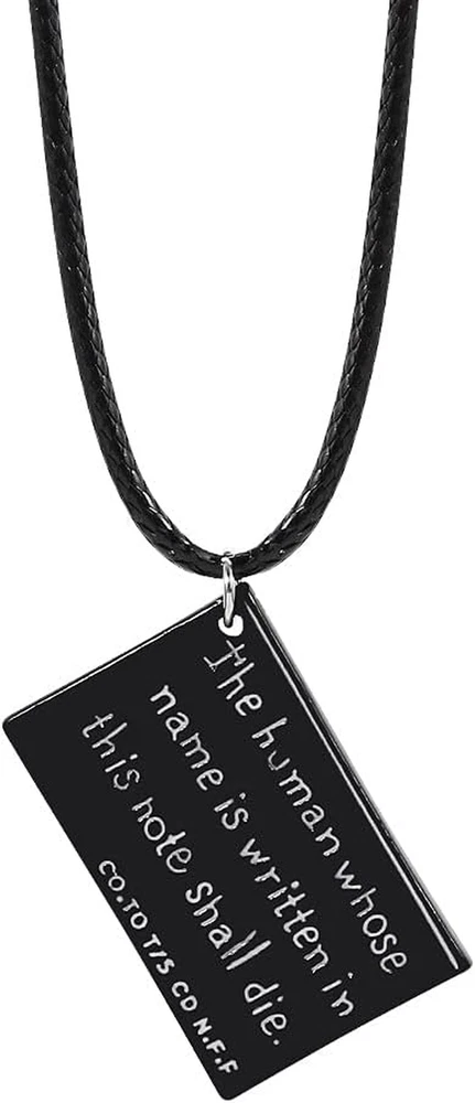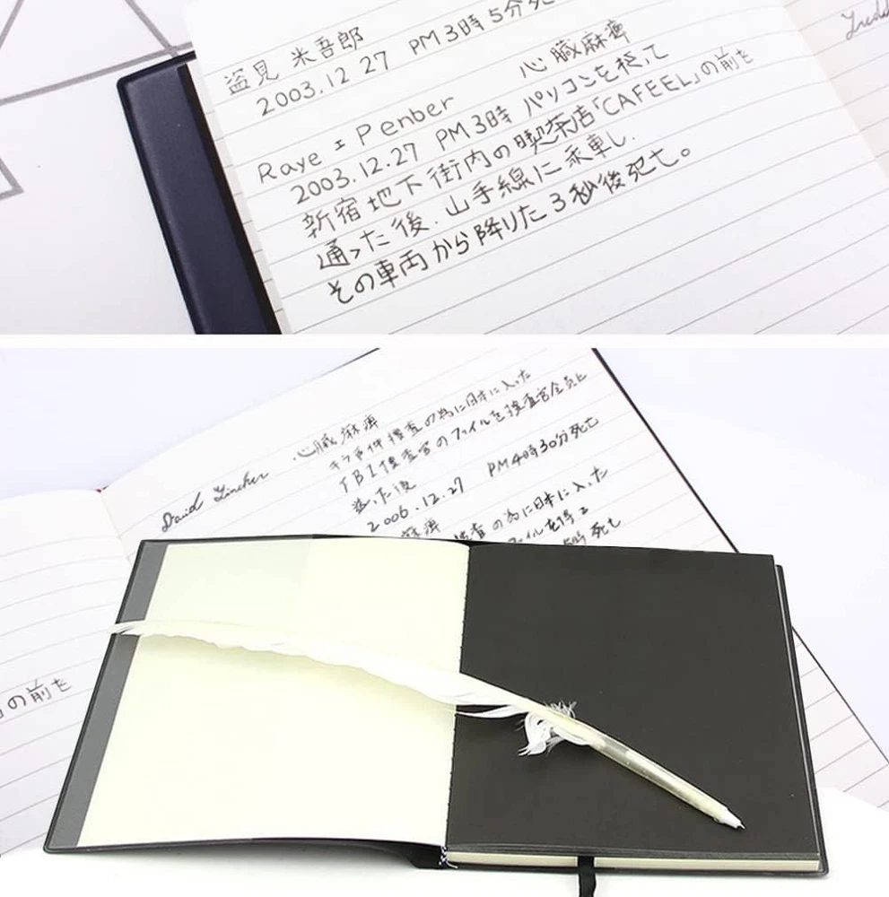 Package includes 1 anime note , 1 feather pen, 1 L necklace, 1 book pendant chain necklace and 1 bookmark The notebook measures: 5.9x8.2 inches, 74 sheets (148 pages), Feather pen: length 11 inches, Notebook pendant: 1.18 x 0.75 inches, L pendant: 1.2 x 1.2 inches, Necklace: chain length19 inches, L Keychain: 1.2 x 3.8 inches Cover Material: PVC Leather Cover-The premium leather hard cover make the anime notebook more durable and touched comfortably, meticulous workmanship, it can be used for a gift to friends It is perfect for cosplay, anime notebook anime theme party, Halloween Costume or daily use Cosplay anime notebook, anime books, cosplay accessories, 100% Brand New, great gift for animie fans as collection Package included: 1 notebook, 5.9*8.2 inches, 74 sheets(108 pages ). 1 feather pen, length 11 inches. 1 L necklace, length19 inches. 1 Book pendant chain necklace, length19 inches. 1 bookmark. It is perfect for cosplay, notebook anime theme party, Halloween Costume or daily use. Great gift for animie fans as collection.