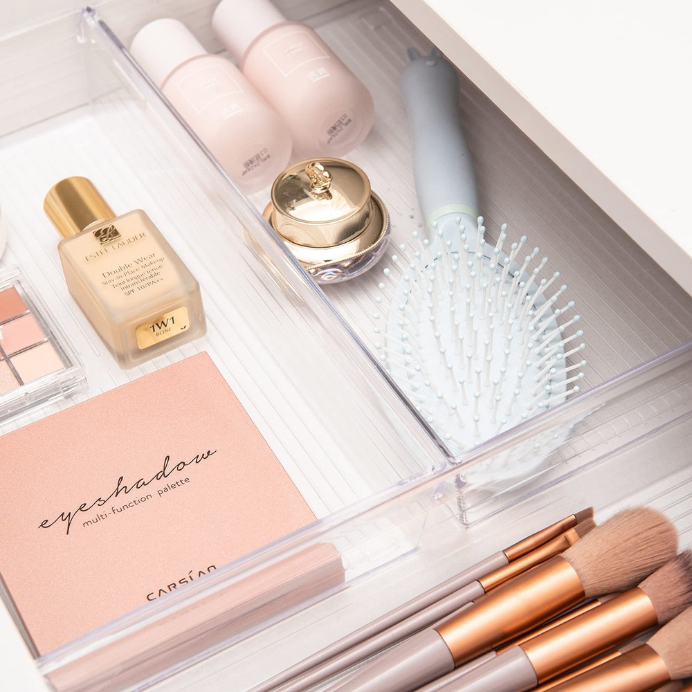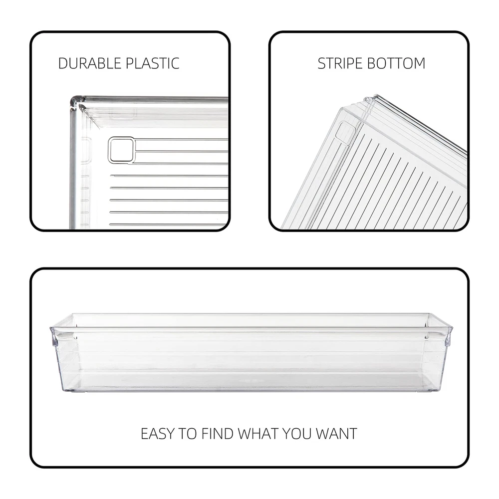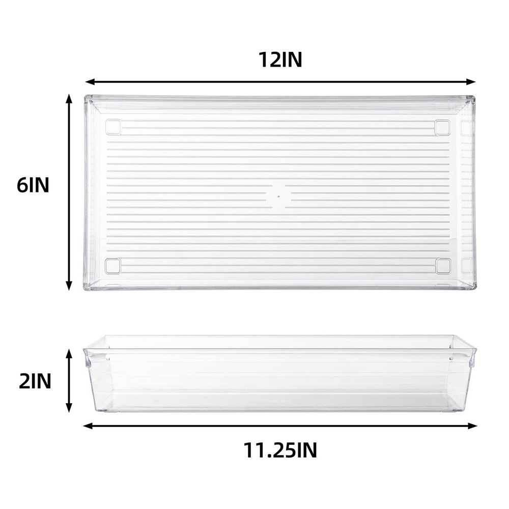 Material: Made of sturdy plastic. Include:4pack-12"x6"x2" drawer organizers. Storage:perfect for office/bathroom/kitchen drawer;organizing eye-shadow palettes,make up tools, cosmetics,nail supplies,hair accessories,Toothpaste comb,office supplies,silverware. Organized:A great storage option for your drawers, makes everything look neat and organized. EASY TO CARE - Only requires a damp warm soapy sponge or cloth for fast and effortless cleaning.