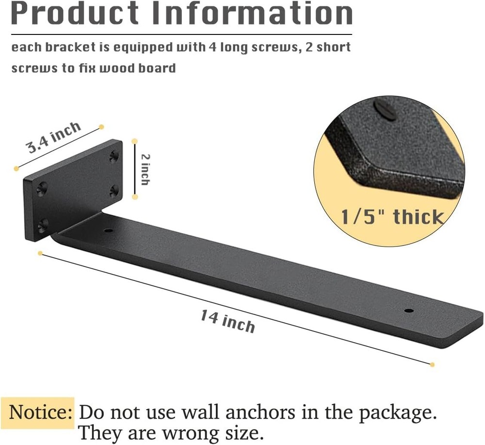 4 Pack Shelf Brackets 14 Inch Floating Shelf Bracket 1/5 inch Thick Heavy Dut... High Value of 8-Pack Shelf Brackets: Our product includes a set of 8 high-quality shelf brackets, which is made from high quality iron steel to ensure long lasting performance, making it a complete solution for your shelving needs. With this pack, you'll have ample brackets to support multiple shelves or create a versatile shelving system in your home or office. ✰Heavy-Duty Weight Capacity: the thickeness of our floating shelf bracket is 1/5 inch. Designed to withstand heavy loads, each pair of our shelf brackets can support up to 150lbs, ensuring a secure and reliable shelving solution. You can confidently store and display a wide range of items, from books and collectibles to kitchenware and electronics. ✰Perfect 12-Inch Length with sleek surface: Measuring 12 inches in length, our brackets offer optimal size for various shelving projects. The brackets feature a sleek black powder coat finish that not only adds a touch of elegance to your space but also provides enhanced durability. The finish acts as a protective layer, guarding against scratches, chips, and corrosion, ensuring long-lasting performance. ✰ two ways of installation with Included Screws: our floating shelf bracket have two different installation ways for you to choose. We've included all the necessary screws for a hassle-free installation experience. Simply align the brackets, secure them using the provided screws, and you'll have sturdy shelves ready to use in no time. Our user-friendly design ensures quick and efficient installation for DIY enthusiasts and professionals alike. ✰Wide application and no risk policy. With compatible design, our shelf brackets can blend well with different decoration style and creat a rustic look for your bedroom, dining room, kitchen room and so on.if you have any questions about our brackets, you are free to return or apply refund for your order any time. We always stand behind our product. Shipping We offer FREE shipping on all orders! We ship within Three business days of payment, usually sooner. Local pickups and combined shipping options are not provided at this time. Return You can return a product for up to 30 days from the date you purchased it. Any product you return must be in the same condition you received it and in the original packaging. Please keep the receipt. Payment We accept payment by any of the following methods: PayPal Please pay as soon as possible after winning an auction, as that will allow us to post your item to you sooner! Feedback Customer satisfaction is very important to us. If you have any problem with your order, please contact us and we will do our best to make you satisfied. Contact Us If you have any queries, please contact us via ebay. We usually respond within 24 hours on weekdays. Please visit our eBay store to check out other items for sale! Thank you for shopping at our store.