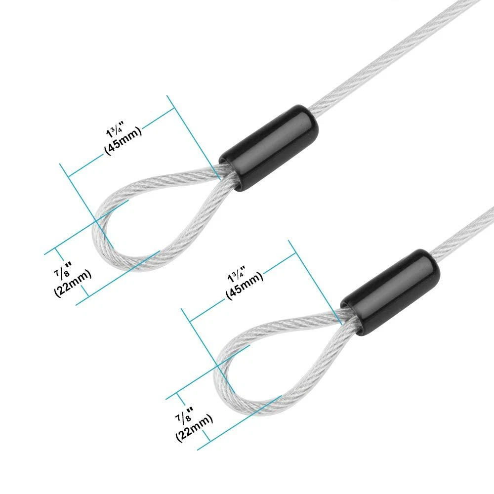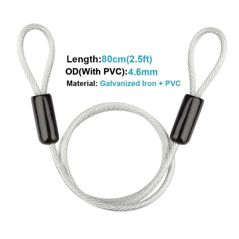 4 Pack 2½ ft (80 cm) Luggage Lock Safety Cable Wire. Diameter: 4.6 mm (including the PVC Coated) Braided Iron Galvanized and PVC Coated Security Cable, breaking force 220 lb ( 100 Kg) Made with 7 strands with 7 wires in per strand offering flexibility and durability PVC covering protect the cable to non rust and avoid pricked your hand of accidentally The Cable with Double Looped, suitable all pad-locks, u-locks, or disc-locks, lock Luggage and so on