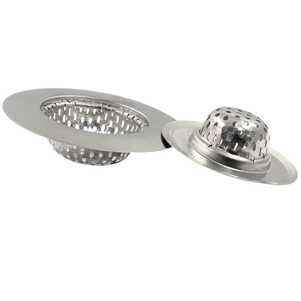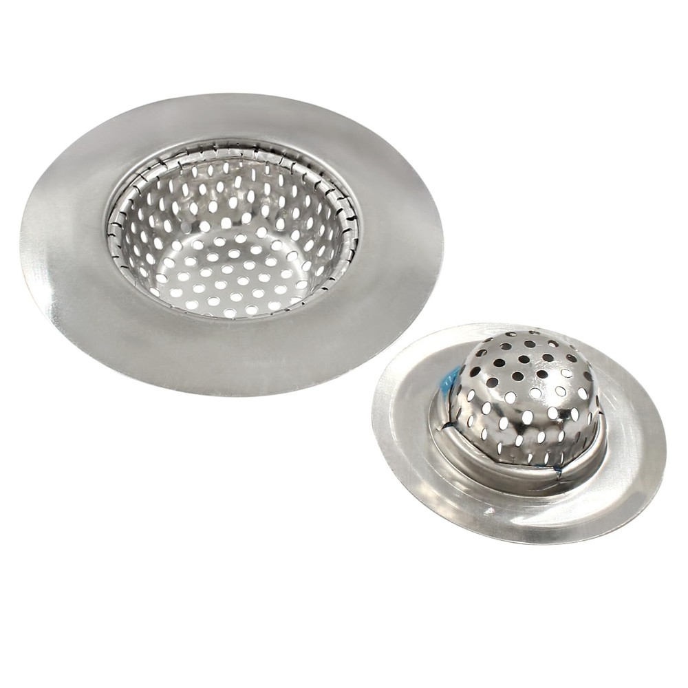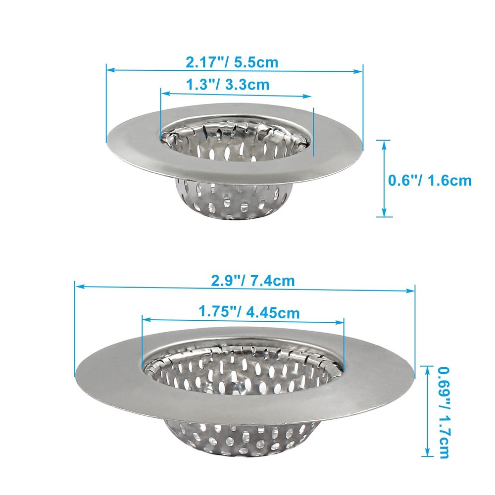 4 Pack Sink Strainer Basket Drain Cover, 2.17''~2.9'' Stainless Steel Hair Catcher Drain Filter for Bathroom Wash Basin Laundry Utility Sink, Silver Feature: 1. Our sink strainer effectively prevents debris from clogging the drain, while the larger holes allow for fast draining particles, keeping your sink clean and free-flowing. 2. The overall thickening of the material ensures its sturdiness and prevents deformation, providing long-lasting protection for your drainage system. 3. Stainless steel drain strainer fit most sinks, such as kitchen, bathroom, laundry tub, utility, and lavatory sinks, and anywhere you want to catch hair and other small particles. Specification: Product Name: Sink Strainer Material: Stainless Steel Color: Silver Size: As the Picture Shown Package Include: 4 x Sink Strainer Value Pack: Each package includes 4 sink drain strainers in 2 sizes, 2pcs/size. Size: M: Top 2.9”, filter 1.75”, depth 0.69”; S: Top 2.17”, filter 1.3”, depth 0.6”. Durable Construction: Constructed from premium stainless steel, our drain strainer is rust-free and built to last, providing long-lasting protection for your drainage system. Efficient Drainage: With its high-density mesh and small drain holes, the sink drain filter efficiently traps debris, food particles, and hair without impeding water flow. Easy Maintenance: Unlike silicone alternatives, our bathtub drain cover is easy to clean. Simply wash it with warm soapy water to maintain its shine and functionality. Universal Fit: Our sink strainer is designed to fit most sinks, including kitchen, bathroom, utility, and lavatory sinks, and wherever you want to catch small debris.
