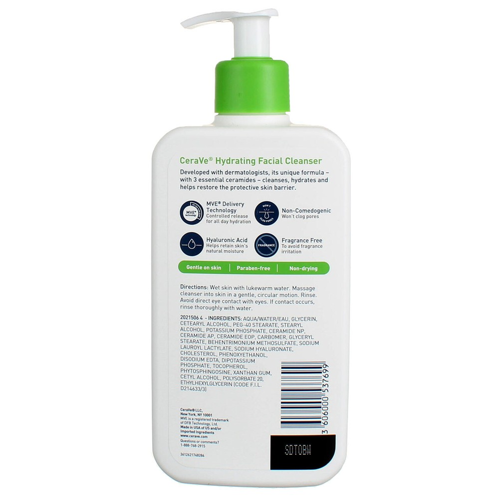 Product Description CeraVe Hydrating Facial Cleanser has a unique formula that cleanses, hydrates and helps restore the protective skin barrier with three essential ceramides (1, 3, 6-II). The formula also contains hyaluronic acid to help retain skin's natural moisture. CeraVe Hydrating Facial Cleanser removes dirt, oil and makeup and is gentle on skin. The cleanser is fragrance-free, non-comedogenic, non-drying and non-irritating. Suitable for use on the face, body, even hands. Hydrating face cleanser removes face makeup, dirt, and excess oil without stripping the skin of essential moisture Provides 24-hour hydration and leaves skin feeling soft and comfortable with a non-greasy feel Gentle lotion-based facial cleanser is suitable for the face, body and hands Helps restore the skin's protective barrier with ceramides Helps attract moisture to the skin with hyaluronic acid Accepted by the National Eczema Association Non-drying and non-irritating Non-comedogenic, fragrance-free, paraben-free and soap-free Key Ingredients: Ceramides help restore and maintain the skin's natural barrier Hyaluronic acid attracts hydration to the skin's surface and helps dry skin retain moisture MVE Technology, a patented delivery system, continually releases moisturizing ingredients Brand Story: CeraVe is the #1 dermatologist recommended skincare brand*. Whether you need products for your sensitive, oily, acne-prone, combination or normal skin, need a soothing moisturizer for your baby, have specific skin concerns, like eczema or psoriasis, or just want a hydrating serum or anti-aging cream, CeraVe can help. The CeraVe story began in 2005 after experts noticed that many skin conditions such as acne, eczema, psoriasis and dry skin all had one thing in common: a compromised skin barrier. Developed with dermatologists, CeraVe offers a complete line of skincare products that contain three essential ceramides enhanced with a revolutionary delivery system to help restore the skin's natural protective barrier. *IQVIA, ProSource Survey, Q1-Q4 2020 Made in United States(of US and/or imported ingredients) Ingredients AQUA/WATER/EAU, GLYCERIN, CETEARYL ALCOHOL, PEG-40 STEARATE, STEARYL ALCOHOL, POTASSIUM PHOSPHATE, CERAMIDE NP, CERAMIDE AP, CERAMIDE EOP, CARBOMER, GLYCERYL STEARATE, BEHENTRIMONIUM METHOSULFATE, SODIUM LAUROYL LACTYLATE, SODIUM HYALURONATE, CHOLESTEROL, PHENOXYETHANOL, DISODIUM EDTA, DIPOTASSIUM PHOSPHATE, TOCOPHEROL, PHYTOSPHINGOSINE, XANTHAN GUM, CETYL ALCOHOL, POLYSORBATE 20, ETHYLHEXYLGLYCERIN Instructions 1. Wet skin with lukewarm water 2. Massage hydrating face cleanser into skin in a gentle, circular motion 3. Rinse Product Description CeraVe Hydrating Facial Cleanser has a unique formula that cleanses, hydrates and helps restore the protective skin barrier with three essential ceramides (1, 3, 6-II). The formula also contains hyaluronic acid to help retain skin's natural moisture. CeraVe Hydrating Facial Cleanser removes dirt, oil and makeup and is gentle on skin. The cleanser is fragrance-free, non-comedogenic, non-drying and non-irritating. Suitable for use on the face, body, even hands. Hydrating face cleanser removes face makeup, dirt, and excess oil without stripping the skin of essential moisture Provides 24-hour hydration and leaves skin feeling soft and comfortable with a non-greasy feel Gentle lotion-based facial cleanser is suitable for the face, body and hands Helps restore the skin's protective barrier with ceramides Helps attract moisture to the skin with hyaluronic acid Accepted by the National Eczema Association Non-drying and non-irritating Non-comedogenic, fragrance-free, paraben-free and soap-free Key Ingredients: Ceramides help restore and maintain the skin's natural barrier Hyaluronic acid attracts hydration to the skin's surface and helps dry skin retain moisture MVE Technology, a patented delivery system, continually releases moisturizing ingredients Brand Story: CeraVe is the #1 dermatologist recommended skincare brand*. Whether you need products for your sensitive, oily, acne-prone, combination or normal skin, need a soothing moisturizer for your baby, have specific skin concerns, like eczema or psoriasis, or just want a hydrating serum or anti-aging cream, CeraVe can help. The CeraVe story began in 2005 after experts noticed that many skin conditions such as acne, eczema, psoriasis and dry skin all had one thing in common: a compromised skin barrier. Developed with dermatologists, CeraVe offers a complete line of skincare products that contain three essential ceramides enhanced with a revolutionary delivery system to help restore the skin's natural protective barrier. *IQVIA, ProSource Survey, Q1-Q4 2020 Made in United States(of US and/or imported ingredients) Ingredients AQUA/WATER/EAU, GLYCERIN, CETEARYL ALCOHOL, PEG-40 STEARATE, STEARYL ALCOHOL, POTASSIUM PHOSPHATE, CERAMIDE NP, CERAMIDE AP, CERAMIDE EOP, CARBOMER, GLYCERYL STEARATE, BEHENTRIMONIUM METHOSULFATE, SODIUM LAUROYL LACTYLATE, SODIUM HYALURONATE, CHOLESTEROL, PHENOXYETHANOL, DISODIUM EDTA, DIPOTASSIUM PHOSPHATE, TOCOPHEROL, PHYTOSPHINGOSINE, XANTHAN GUM, CETYL ALCOHOL, POLYSORBATE 20, ETHYLHEXYLGLYCERIN Instructions 1. Wet skin with lukewarm water 2. Massage hydrating face cleanser into skin in a gentle, circular motion 3. Rinse Disclaimer The product descriptions and instructions provided by vitabox.com are for informational purposes only and are qualified in their entirety by the information available from manufacturers of the products. You should carefully read all product packaging, and contact the manufacturer with any questions before using a product. While we endeavor to ensure that product descriptions are current, manufacturers sometimes change their products. We are not liable for inaccuracies or misstatements about products. We do not provide medical advice or recommendations. You should not use the information provided by vitabox.com for diagnosing or treating a health problem or disease. If you 