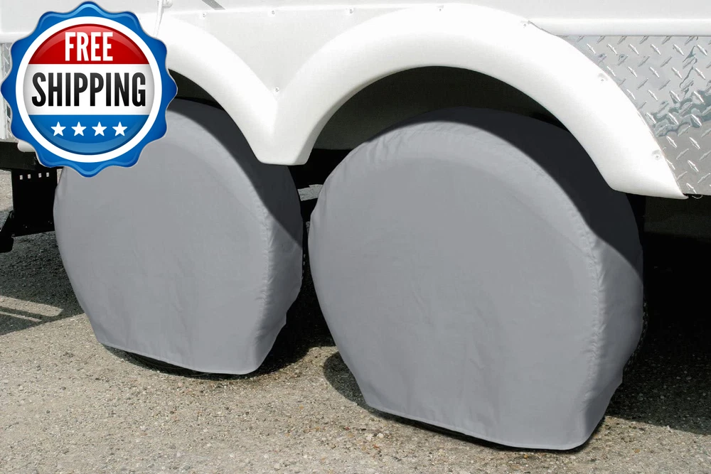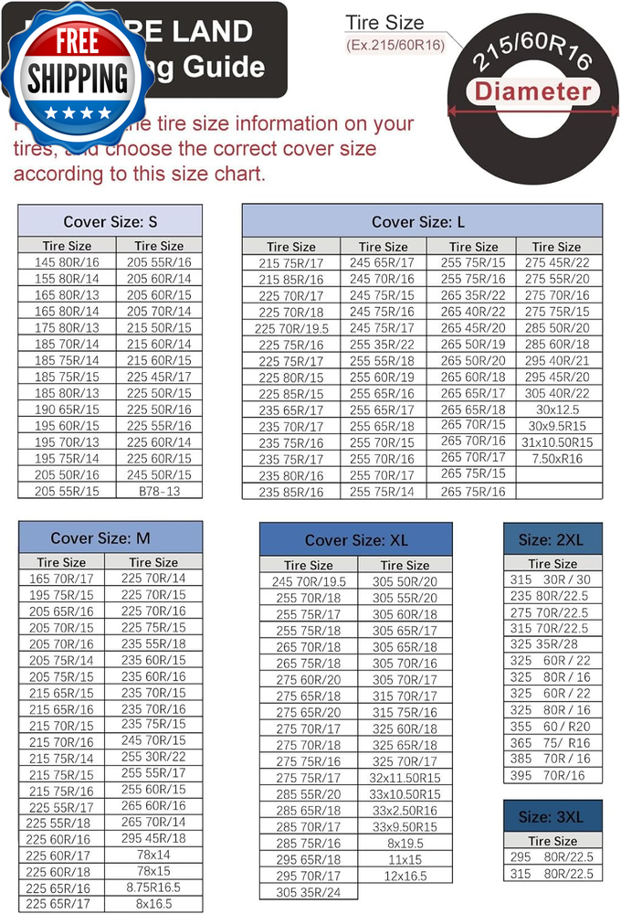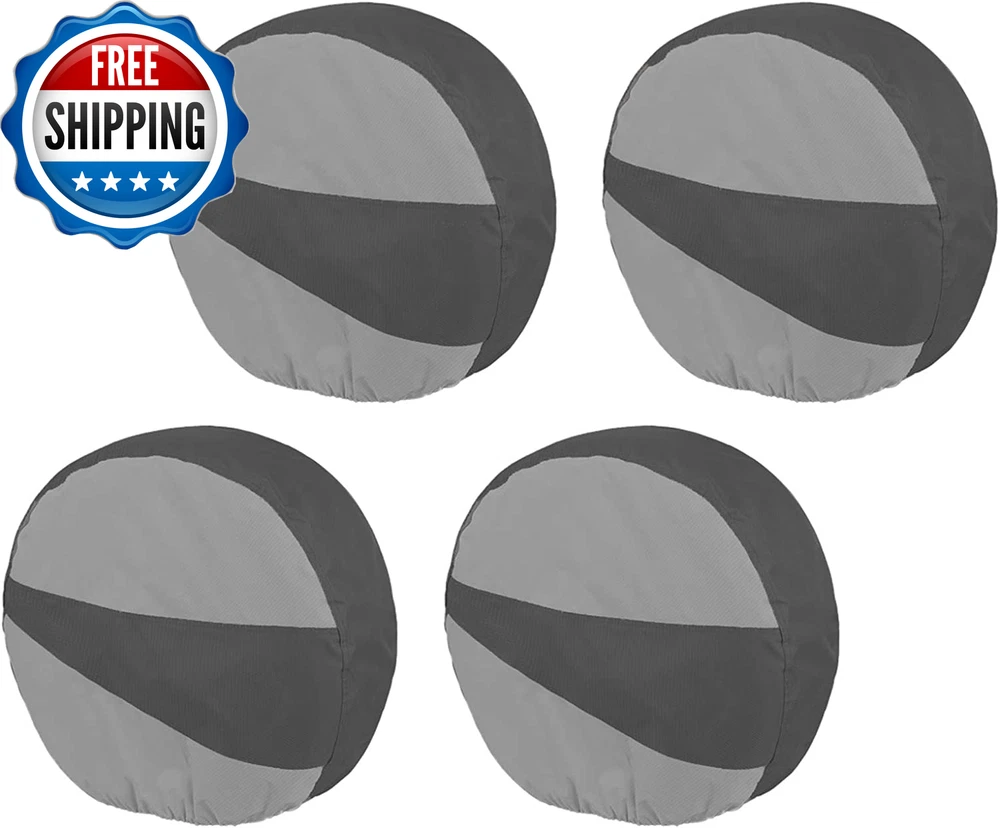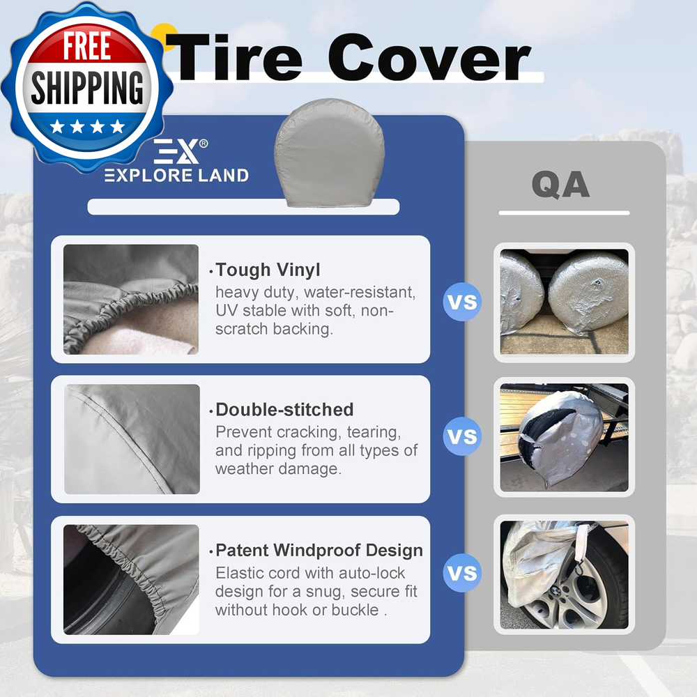 Tire Covers 4 Pack - Tough Wheel Protector for Truck, SUV, Trailer, Camper, RV Universal Fits Tire Diameters 26-28.75 Inches, Charcoal Universal Fit - Refer to our fitting guide picture for size selection, set of 4 covers fits entire tire diameter up to: 26''-28.75'', it’s NOT the rim size. Any questions can seek solution from us by email. Tough Material - Heavy duty vinyl with water resistant coating and UV stabilized treatment, long-lasting and tough enough as a tire cover, bonded with soft, non-scratch backing. Wide Range of Application - Ideal for use on Jeep, car, truck, SUV, trailer, camper, motor home and RV, or anything with the correct tire size. Fully Protection - It's a perfect all-season cover, 4 covers in 1 set. Protects tires and wheels from sun damage, rust and dirt when your vehicle is parked. And the tire cover is easy to clean, wipe only with clean water. Unique Windproof Design - Elastic cord with auto-lock design easily makes a snug-fitting installation within seconds. Our design has remarkably raised the wind resistance capacity and we don't need ties or holes anymore to stay in high wind. Product Description Explore Land Tough Tire Covers Explore Land has been committed to the field of protective covers for camping auto accessories, which can resist the damage of bad weather to products, such as 4 pack / 2-pack tire covers, spare tire covers, golf cart covers, motorcycle covers, jack covers, etc. How to choose the suitable cover? Tough tire covers with 3 color options Refer to our Tire Fitting Guide There are significant marks on the back edge of the tire. You can easily determine the size and then refer to our fitting guide picture for size selection. Measure After check-in the tire diameter by tape measuring, select against tire diameter data. The video showcases the product in use. The video guides you through product setup. The video compares multiple products. The video shows the product being unpacked. Tire covers made of different materials have different properties. Color Option/Heavy Duty Black Charcoal Off-white Color Option/Lightweight Silver Color Option/Lightweight Black & Gay Tan & Khaki Package Included 4 Packs or 2 Packs Package Included 4 Packs Package Included 4 Packs or 2 Packs Product Feature Durable, Softer cotton liner , Windproof, Dustproof. Waterproof Product Feature Lightweight, UV-proof , Windproof, Dustproof, Waterproof Product Feature Lightweight , Personalized color schemes , Windproof, Dustproof, Waterproof Explore Land Tough Tire Covers More high-quality auto parts products from Explore Land Add to Cart Add to Cart Add to Cart Add to Cart Add to Cart Add to Cart Customer Reviews 4.7 out of 5 stars 5,634 4.5 out of 5 stars 48 4.5 out of 5 stars 351 4.5 out of 5 stars 2,516 — 4.6 out of 5 stars 657 4.7 out of 5 stars 2,401 Color Options 4 Color Options Black, Charcoal Black, Charcoal Black, Off-white Black Black 4 Color Options Compatibility Fits tire diameter23-42 inch Fits tire diameter 26-32 inch Fits tire diameter 23-35 inch Fits tire diameter 20-33 inch Fit electric/power tongue jack Fits winches up to 17500 lbs Fits 2/4/6 Seats Golf Cart Weatherproof ✔ ✔ ✔ ✔ ✔ ✔ ✔ Durability ✔ ✔ ✔ ✔ ✔ ✔ ✔ How many pieces in a set Set of 2 Set of 2 (≈ 4 tires covers) Set of 4 Set of 1 Set of 1 Set of 1 Set of 1 Shipping Fast shipping is very important for us. Our standard US shipping service is FREE. Your order will be shipped within 2-3 business days upon full payment received. Your order will be delivered within 2-3 business days after the handling time. We only ship to the confirmed PayPal address. We reserve the right to cancel any order for any reason at any time. We are not responsible for undeliverable addresses. Returns and payment We offer a 30 days return policy from checkout winning date. We allow only PayPal as payment method FeedBack Your feedback very important to us, after you get your package and you are satisfied with our service please leave us positive feedback If you have any problem with your order / any questions please before leave any type of feedback For any questions, using eBay contact system Please visit our eBay store to check out other items for sale! Thank you for shopping at our store.