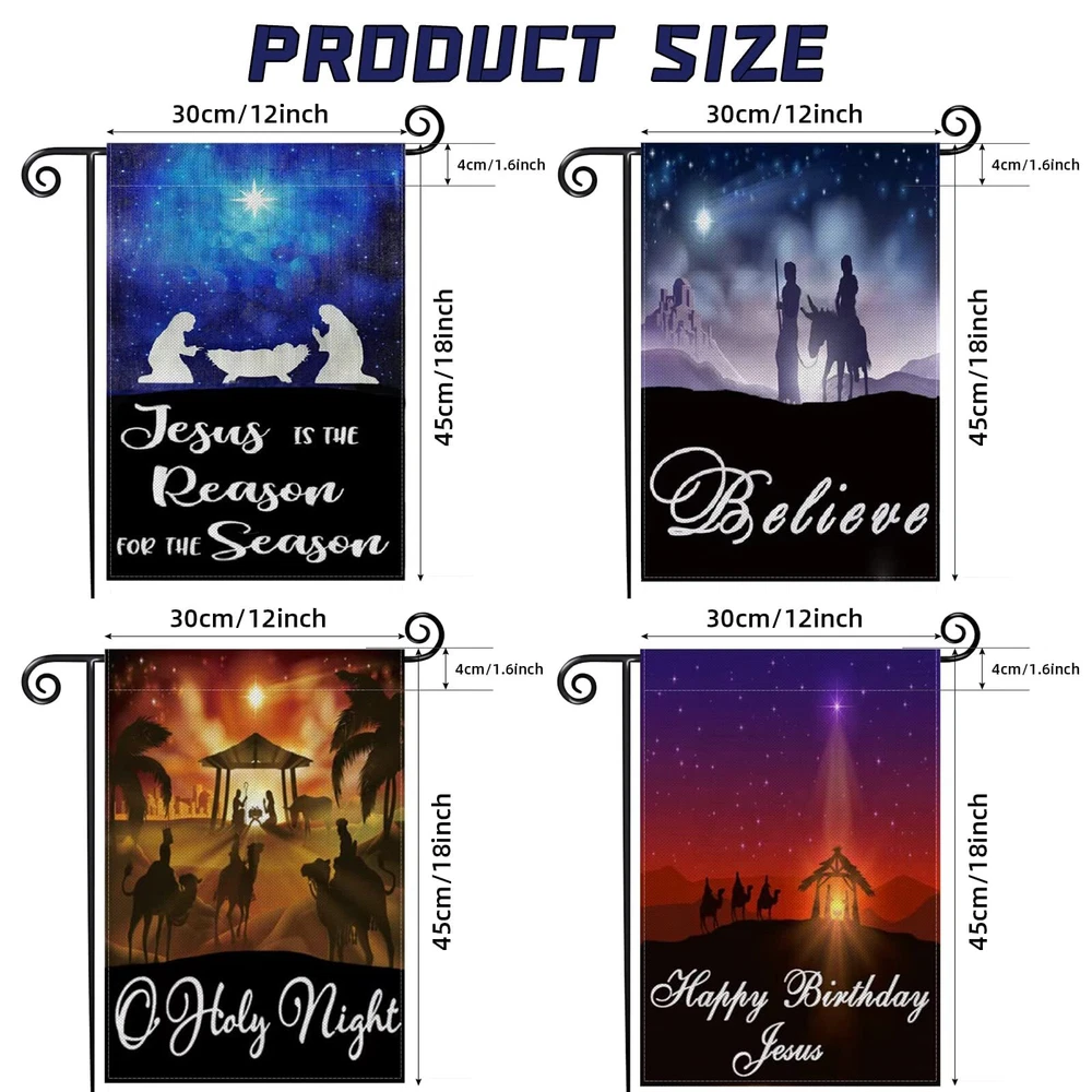 Feature: Fall for jesus he never leaves garden flag. We choose the thickest burlap material for our jesus garden flags which makes it more durable and more attractive, weather-resistant as well as fade-resistant, the durable material to save you costly replacements year afteryear. You will immediately notice how amazing the print is. The color and image are very sharp and vivid. Weather Resistant,Our seasonal garden flags are resistant to any amount of rain, snow, pollen, or harsh sunlight, it stayed perfectly intact even in a bad storm, suitable for outdoor use. Specification: Material: Durable Burlap Cloth Use: Indoor and outside decor. Style: Nativity Scene Burlap Flag Type :hocus pocus party supplies Occasion:Thanksgiving Day, Christmas, Nativity Scene, Easter Size:12 x 18 Inch Package included: 4 * Garden flag(Not include a flag stand or pole). Notes: Manual measuring, please allow 1-2cm error. 【Yard Decoration】: 12x18 inchs.This O Holy Night Christmas garden flag perfect for any deck, patio, porch or and make charming decorative statements for any backyard, lawn or garden. 【Quality Material】: Outdoor nativity scene yard flag is made of premium quality burlap looking machine washable Spun Polyester, which is weather resistant as well as UV / fade-resistant. 【Double Sided】: This Christmas Winter Believe Jesus Garden Flag patterns on both sides are different.The letters and image are correctly visible and readable from both sides.You can see our craftsmanship spirit in every decorative welcome buffalo check plaid rustic burlap garden flag. 【Classic Designs】: 4 Different styles of nativity scene garden flags, different copywriting can best meet your needs, you can hang them anywhere you want.(FLAG STAND NOT INCLUDED). 【Quality Service】: If you are not satisfied with our products, 100% money back guaranteed. Please us for any issues, we will solve it in time. We are here for you and happy to help!