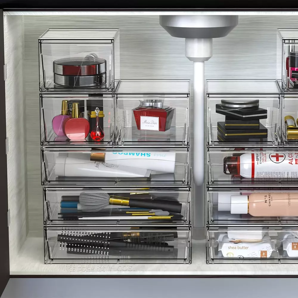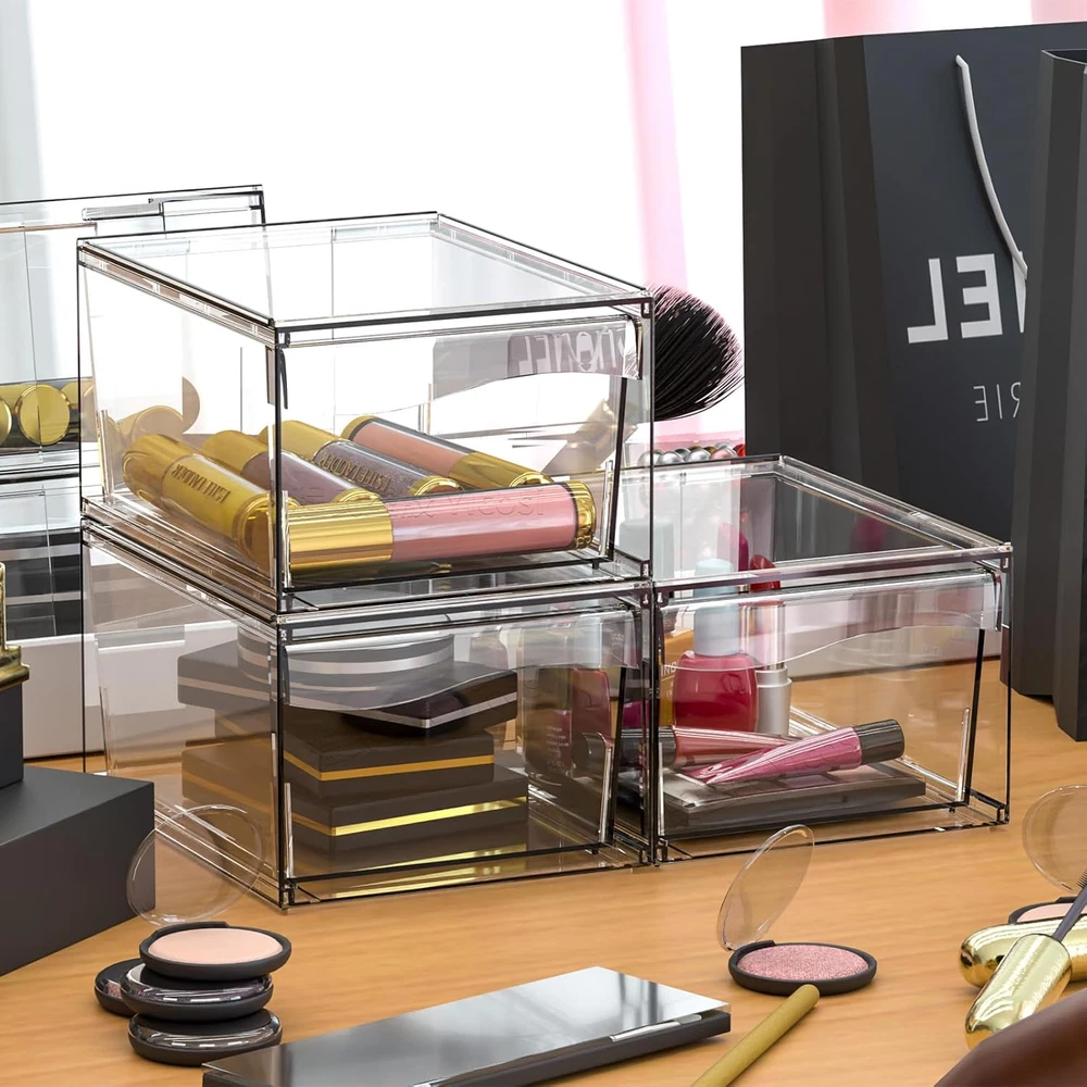 eBay 【Large Stacking acrylic organizers】- The make up storage has 4 independent drawer organizers, They can be used as organizers and storage for makeup, bathroom countertop, kitchen or laundry under sink, medicine cabinet, pantry, vanity. 【Multifunctional clear storage bins】Design of drawers of different sizes makes it a perfect under the sink storage for storing medicine,lotion,skin care,facial cleanser, lipsticks, eye shadows, concealers, and other skin care products 【Stackable Drawers Design】-clear organizers can stack each other,You can use each drawer separately,It is very suitable to be placed on the dormitory,bedroom,Vanity Countertop,dressing table,office desktop,Bathroom Counter clear organizing containers 【This clear stackable storage bins is Perfect Gift】 - Perfect choice as a under sink organizer and Makeup organizer gift to women,Girl,girlfriend, daughter, wife, mom, and friends. College dorm room essentials for girls. 【Stylish and Durable cabinet organizers and storage】: This organizer is also a must-have for beauty bloggers, makeup artists, and college students. Very suitable as: desk storage, under sink storage, makeup storage, under bathroom sink organizer Product Description Stackable Organizer Drawers Maximizes Countertop and Cabinet Storage Capacity Organizer can stack each other,You can use each drawer separately or match it with Our other drawers from our brand,the medicine organizer compact and simple design, does not deform, and is shiny. A great helper for desk organizer Vanity Can be placed on the makeup table, to store your makeup supplies, such as brushes, loose powder, powder, mask, foundation liquid, sunscreen and so on cosmetics, so that your desktop clean and orderly, items classification, transparent design can make you very simple to find what you need. Coffee bar This acrylic stacking box can be placed next to the coffee table, used to store your coffee and various coffee seasonings, will keep the whole table very clean, so that you can quickly find your things next time. The effect of two boxes stacked together Two kinds of acrylic stacking boxes together also have a certain degree of beauty, but also can put different kinds of things, as a storage or a better choice, just can also be placed in a small cabinet, transparent design is also easier to find things Stacked prevents products from moving when drawers are opened Product size Acrylic stacking box is composed of two parts, drawer and shell, the size is not the same, the drawer size is7.7*5.8*3.9inches.the shell size is7.9*6*4.5inches.